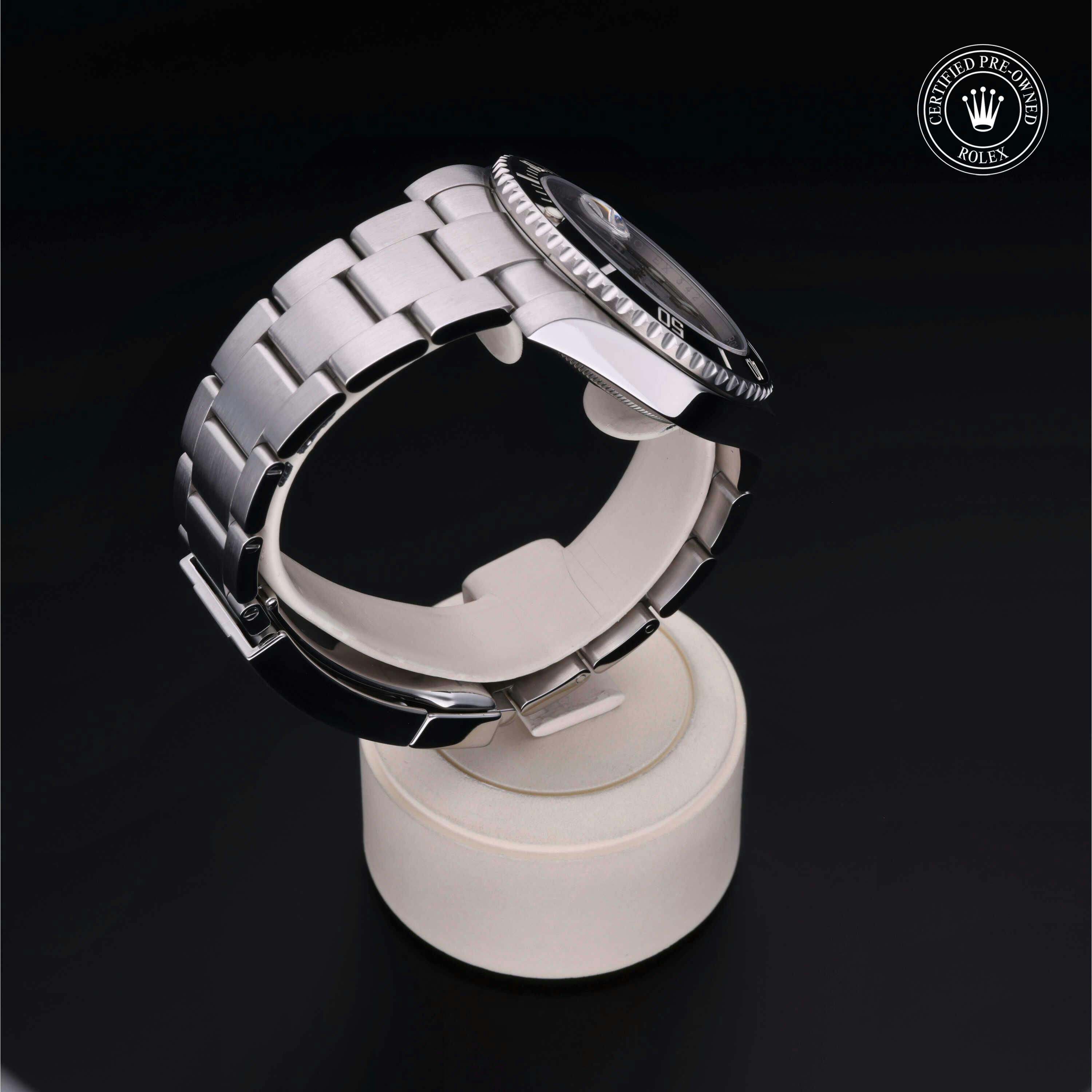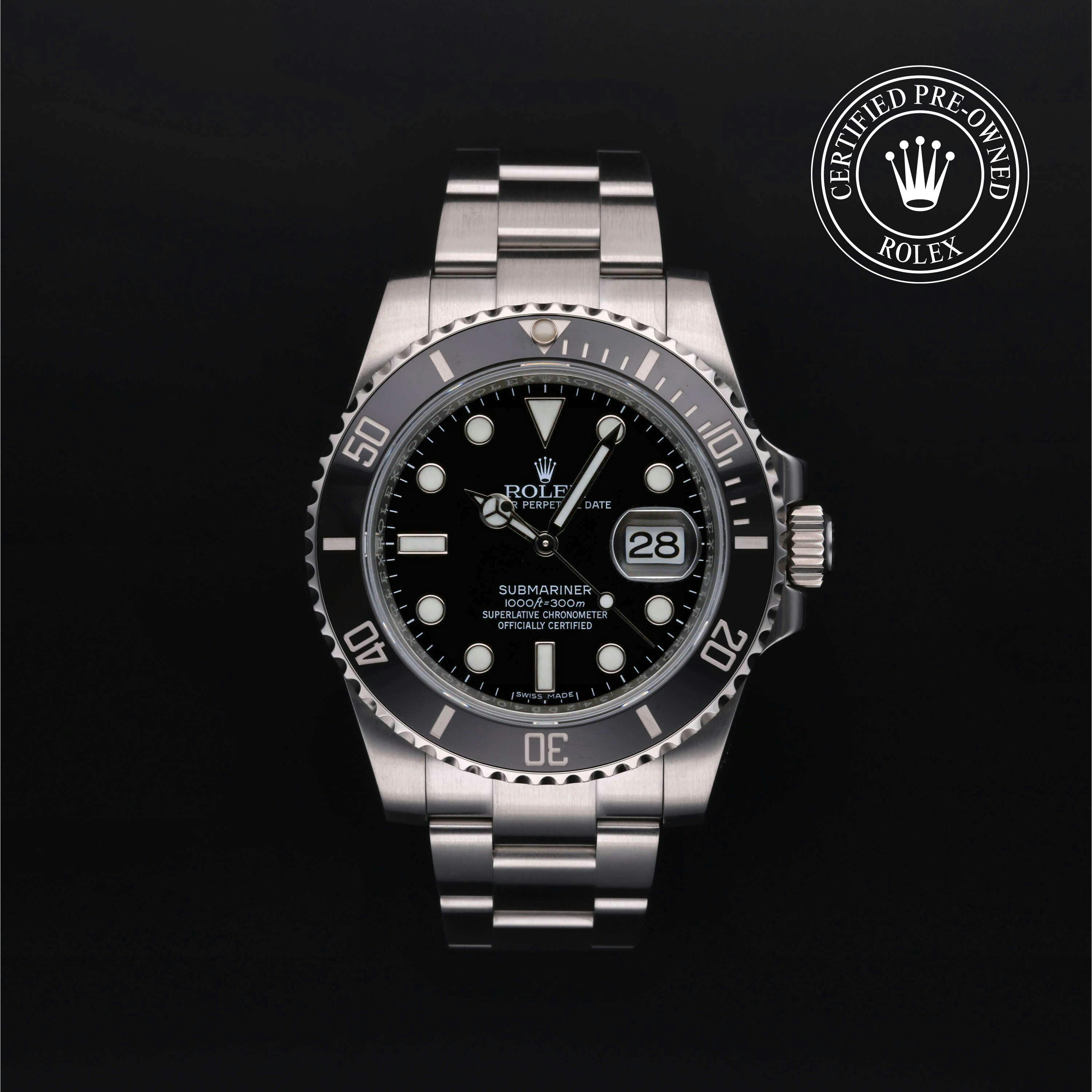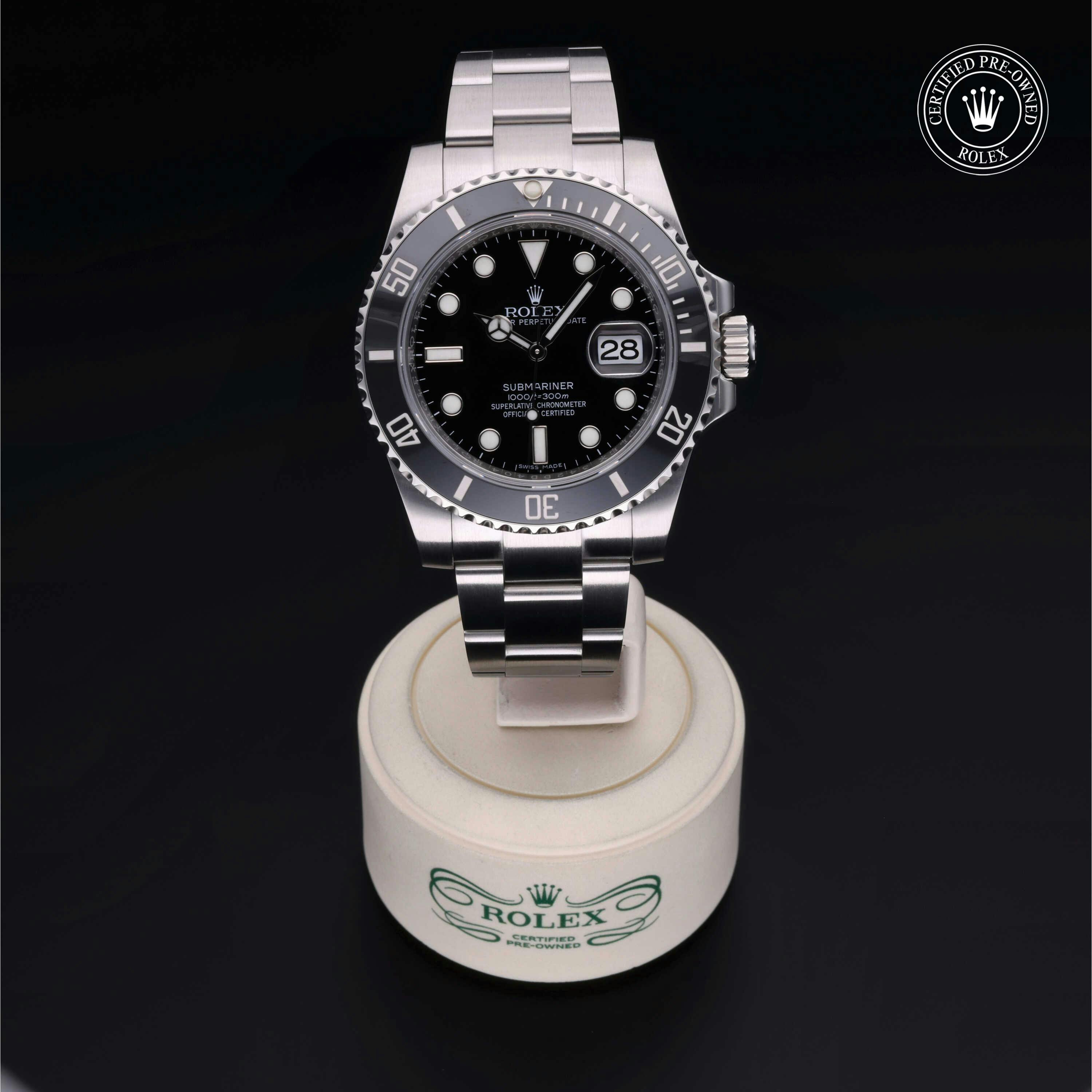 Rolex Certified Pre-Owned Submariner Date (116610LN) self - winding automatic watch, features a 40mm stainless steel case with a black cerachrom bezel insert surrounding a black dial on a stainless steel oyster bracelet. Functions include hours, minutes, seconds and date. This watch has received Rolex-authorized service and certification. It does not come with the original box or papers, but includes a custom Rolex Certified Pre-Owned hang tag, travel pouch and RCPO international warranty card.