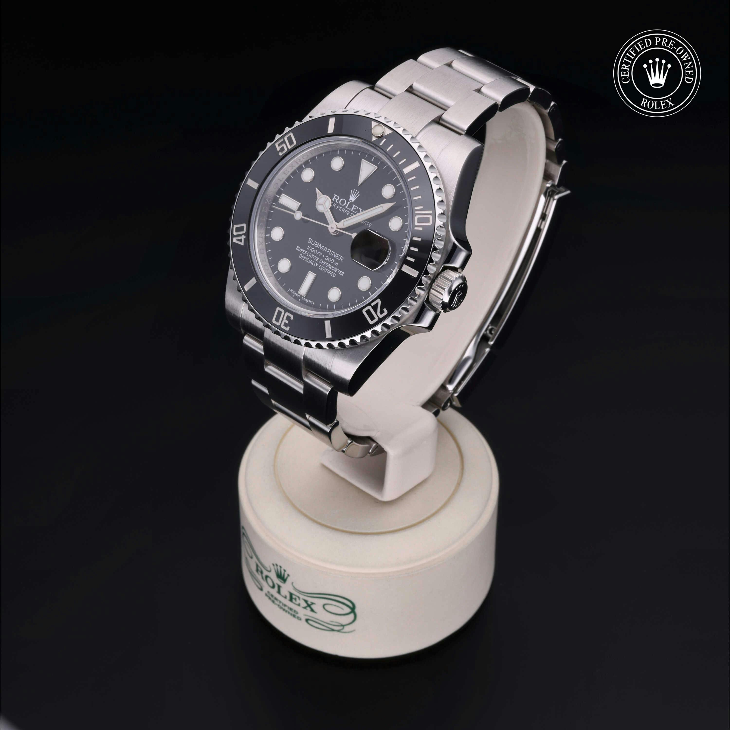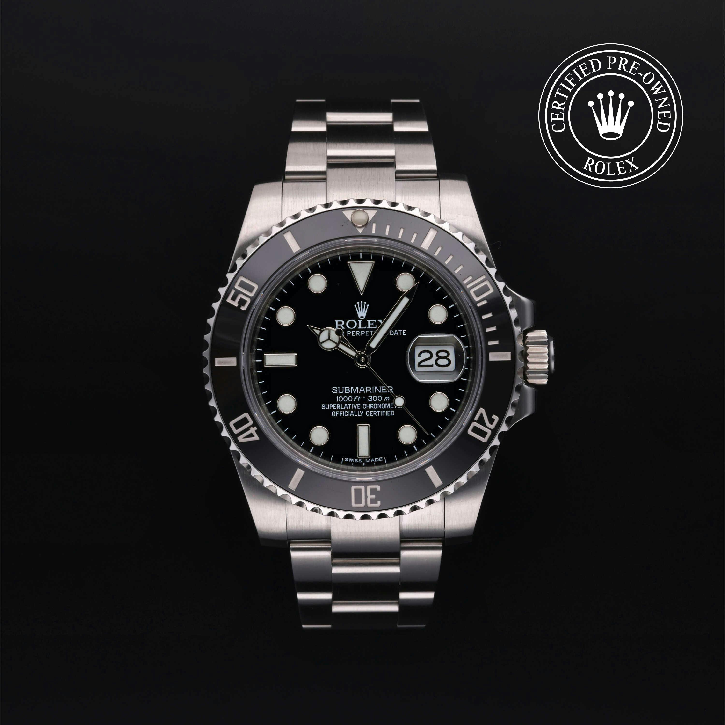 Rolex Certified Pre-Owned Submariner Date (116610LN) self - winding automatic watch, features a 40mm stainless steel case with a black cerachrom bezel insert surrounding a black dial on a stainless steel oyster bracelet. Functions include hours, minutes, seconds and date. This watch has received Rolex-authorized service and certification. It does not come with the original box or papers, but includes a custom Rolex Certified Pre-Owned hang tag, travel pouch and RCPO international warranty card.