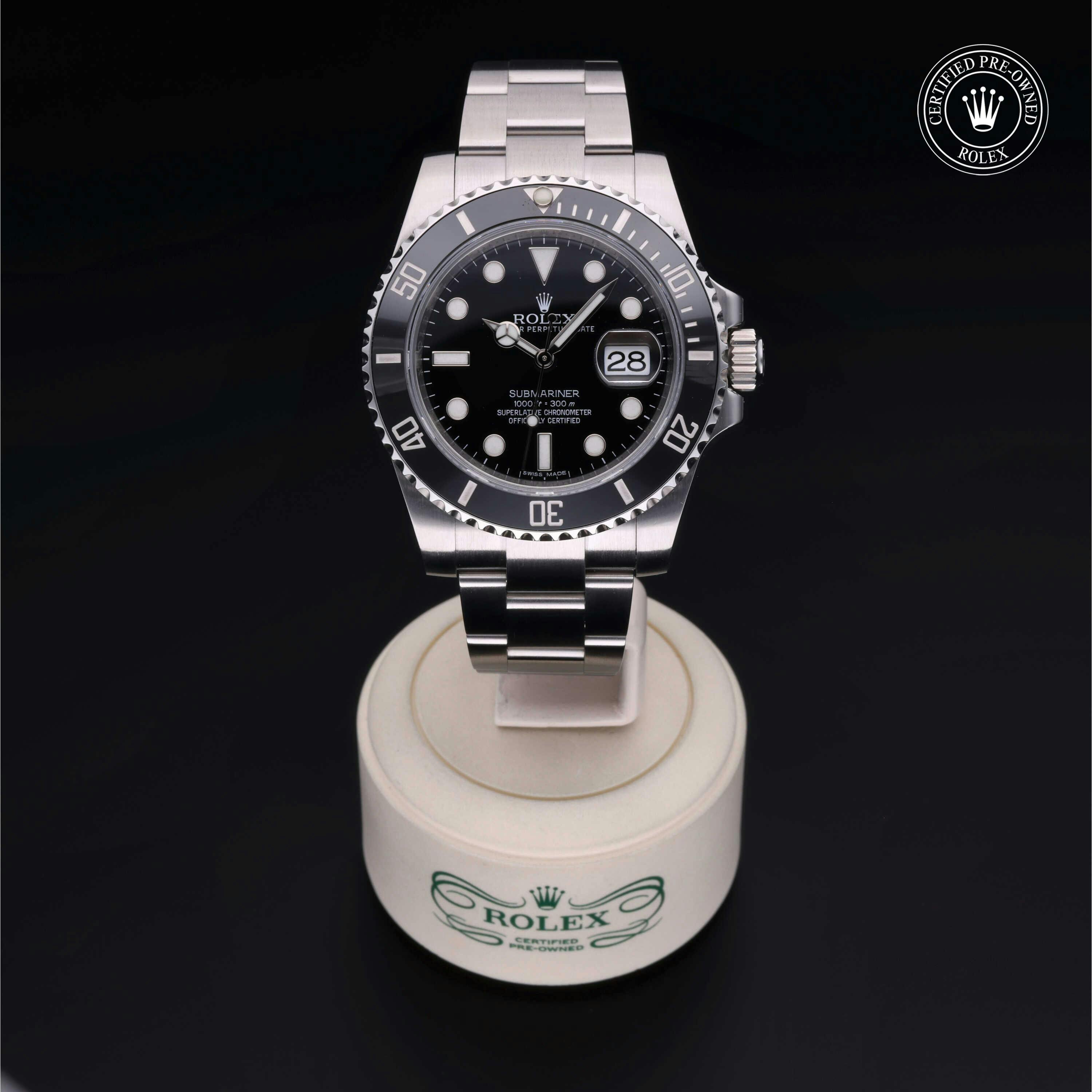 Rolex Certified Pre-Owned Submariner Date (116610LN) self - winding automatic watch, features a 40mm stainless steel case with a black cerachrom bezel insert surrounding a black dial on a stainless steel oyster bracelet. Functions include hours, minutes, seconds and date. This watch has received Rolex-authorized service and certification. It does not come with the original box or papers, but includes a custom Rolex Certified Pre-Owned hang tag, travel pouch and RCPO international warranty card.