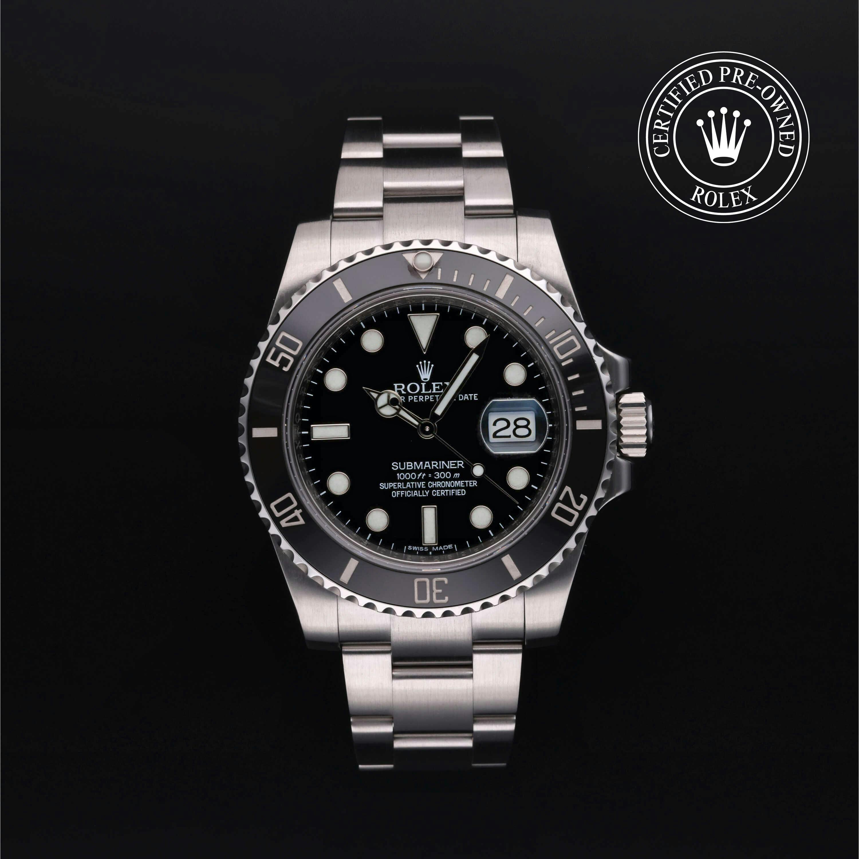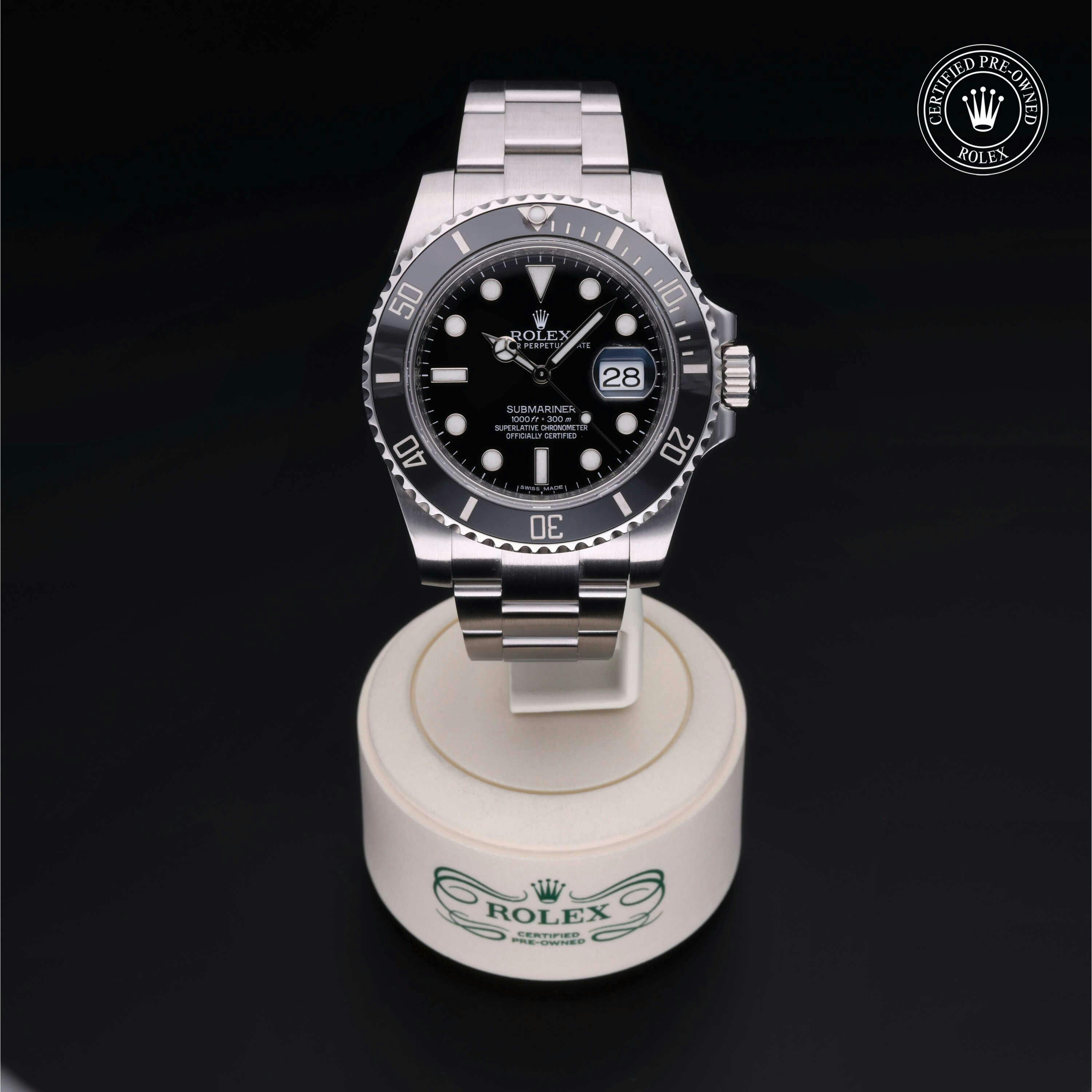 Rolex Certified Pre-Owned Submariner Date (116610LN) self - winding automatic watch, features a 40mm stainless steel case with a stainless steel and black cerachrom bezel surrounding a black dial. The watch is secured on a stainless steel Oyster bracelet complete with a folding buckle. Functions include hours, minutes, seconds and date. This watch has received Rolex-authorized service and certification. It does not come with the original box or papers, but includes a custom Rolex Certified Pre-Owned hang tag, travel pouch and RCPO international warranty card.