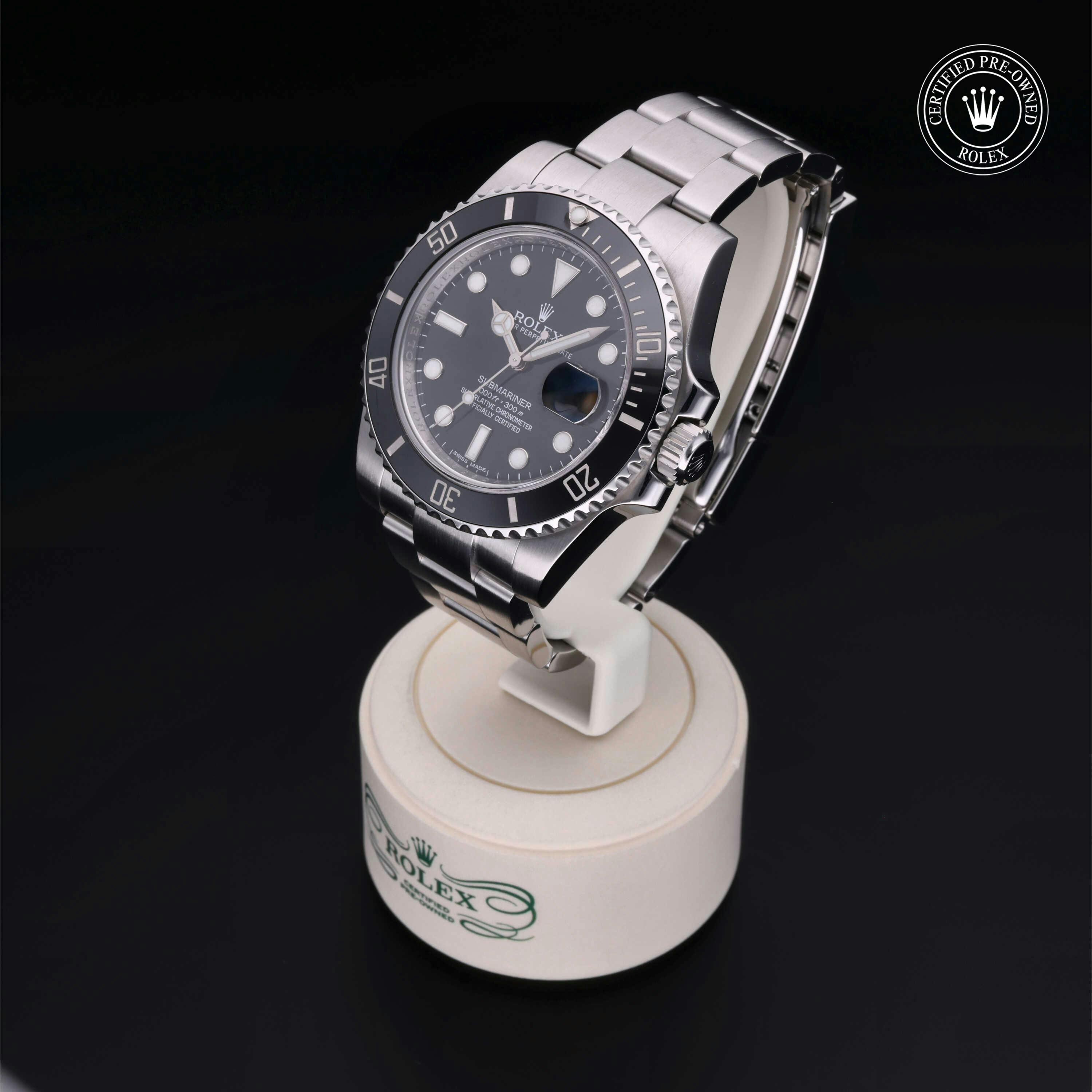 Rolex Certified Pre-Owned Submariner Date (116610LN) self - winding automatic watch, features a 40mm stainless steel case with a stainless steel and black cerachrom bezel surrounding a black dial. The watch is secured on a stainless steel Oyster bracelet complete with a folding buckle. Functions include hours, minutes, seconds and date. This watch has received Rolex-authorized service and certification. It does not come with the original box or papers, but includes a custom Rolex Certified Pre-Owned hang tag, travel pouch and RCPO international warranty card.