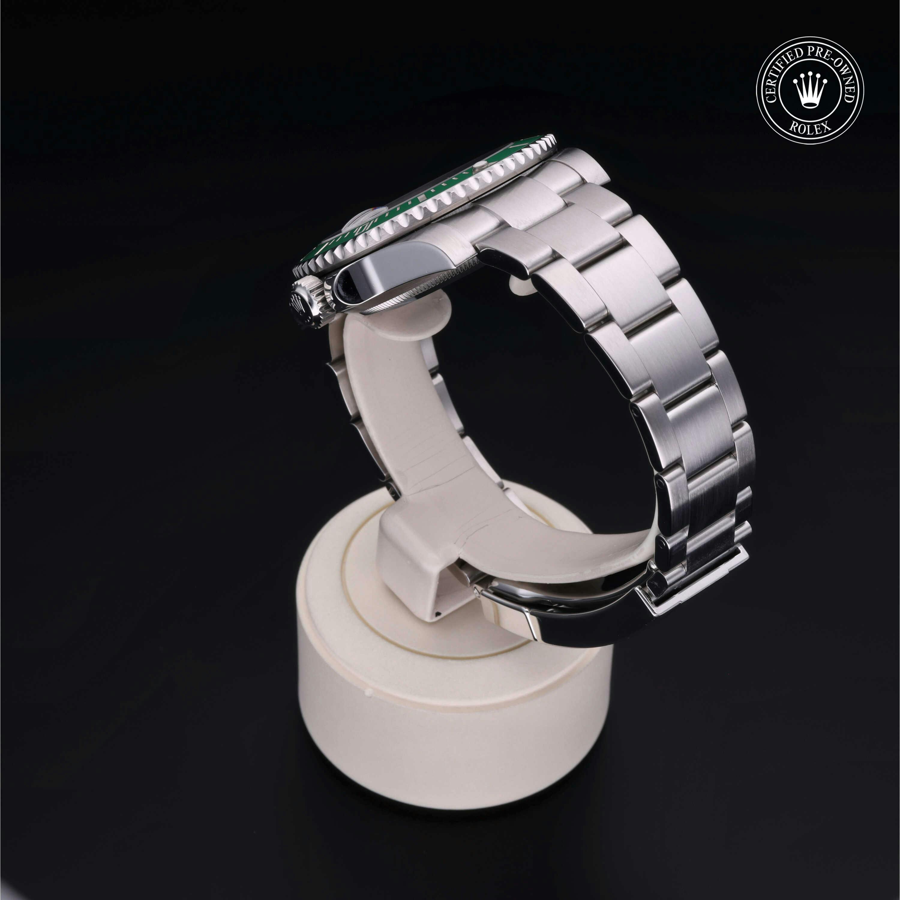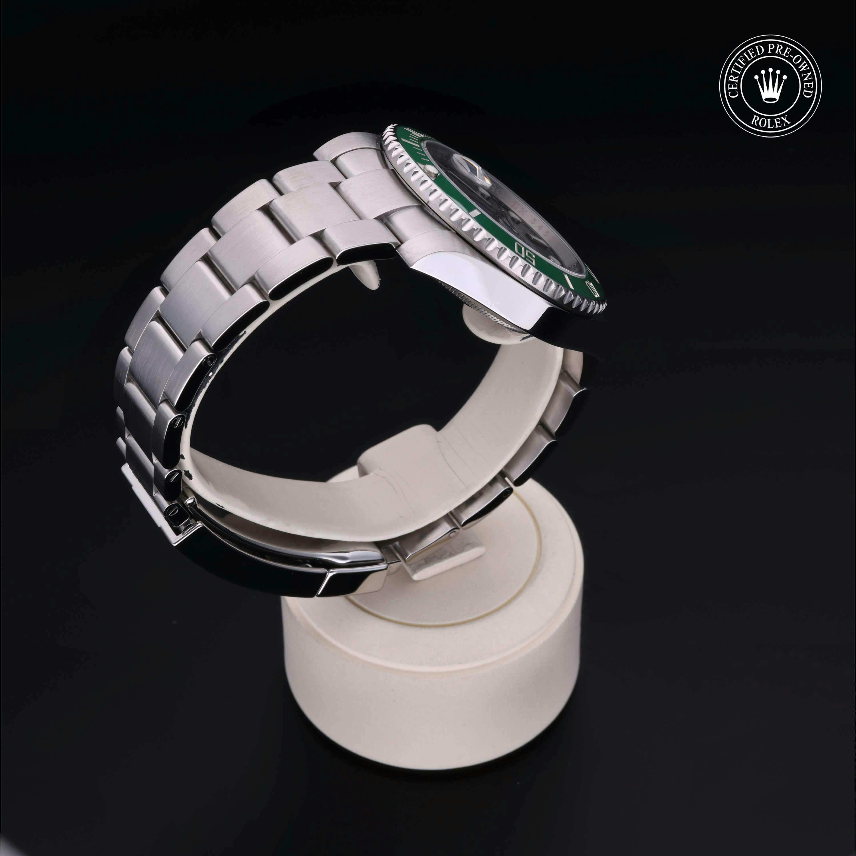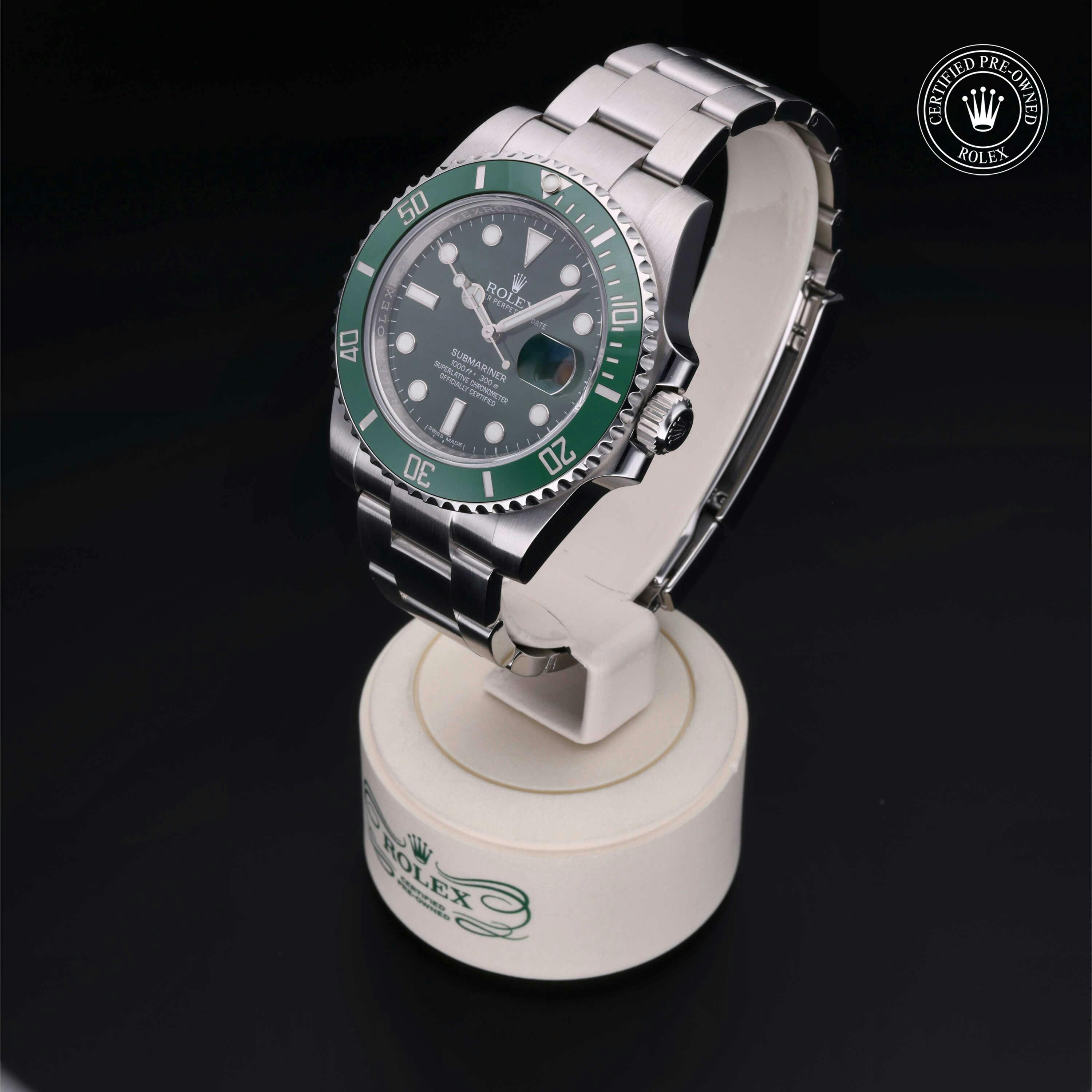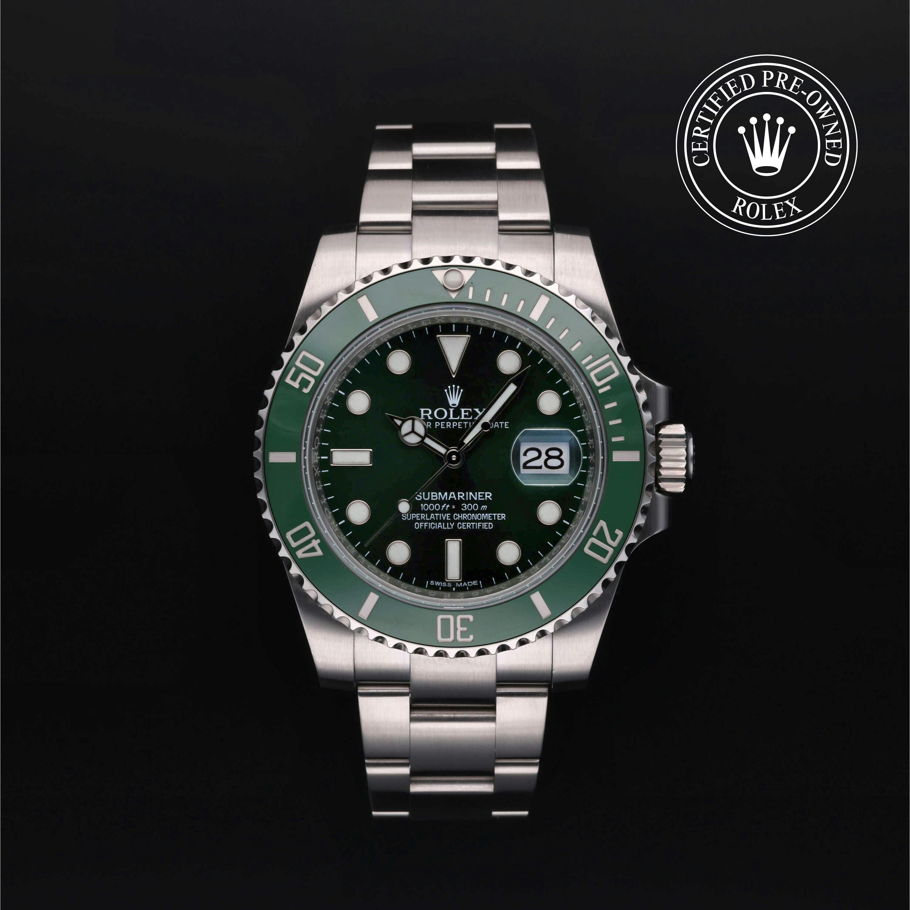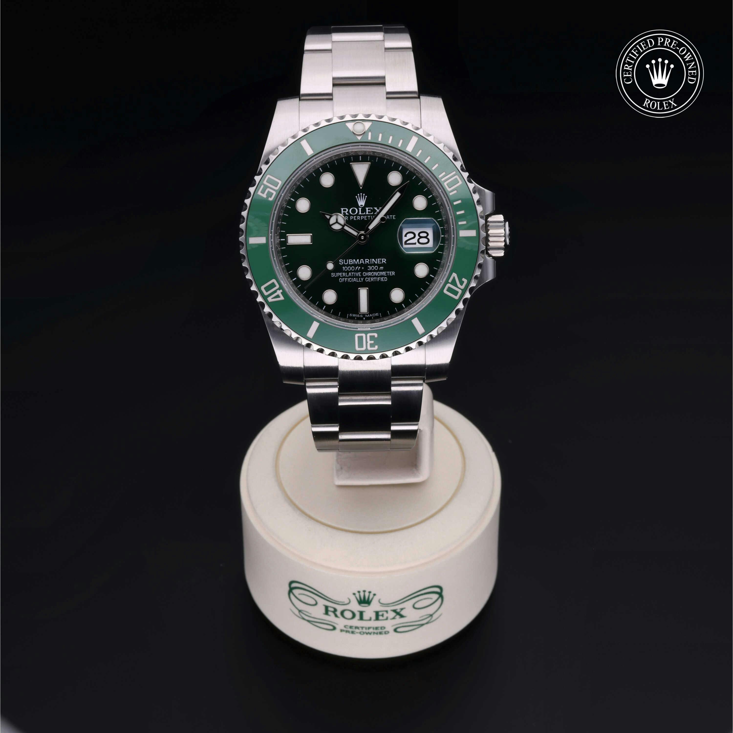 Rolex Certified Pre-Owned Submariner Date (116610LV) self - winding automatic watch, features a 40mm stainless steel case with a green cerachrom bezel insert surrounding a green dial on a stainless steel oyster bracelet. Functions include hours, minutes, seconds and date. This watch has received Rolex-authorized service and certification. It does not come with the original box or papers, but includes a custom Rolex Certified Pre-Owned hang tag, travel pouch and RCPO international warranty card.