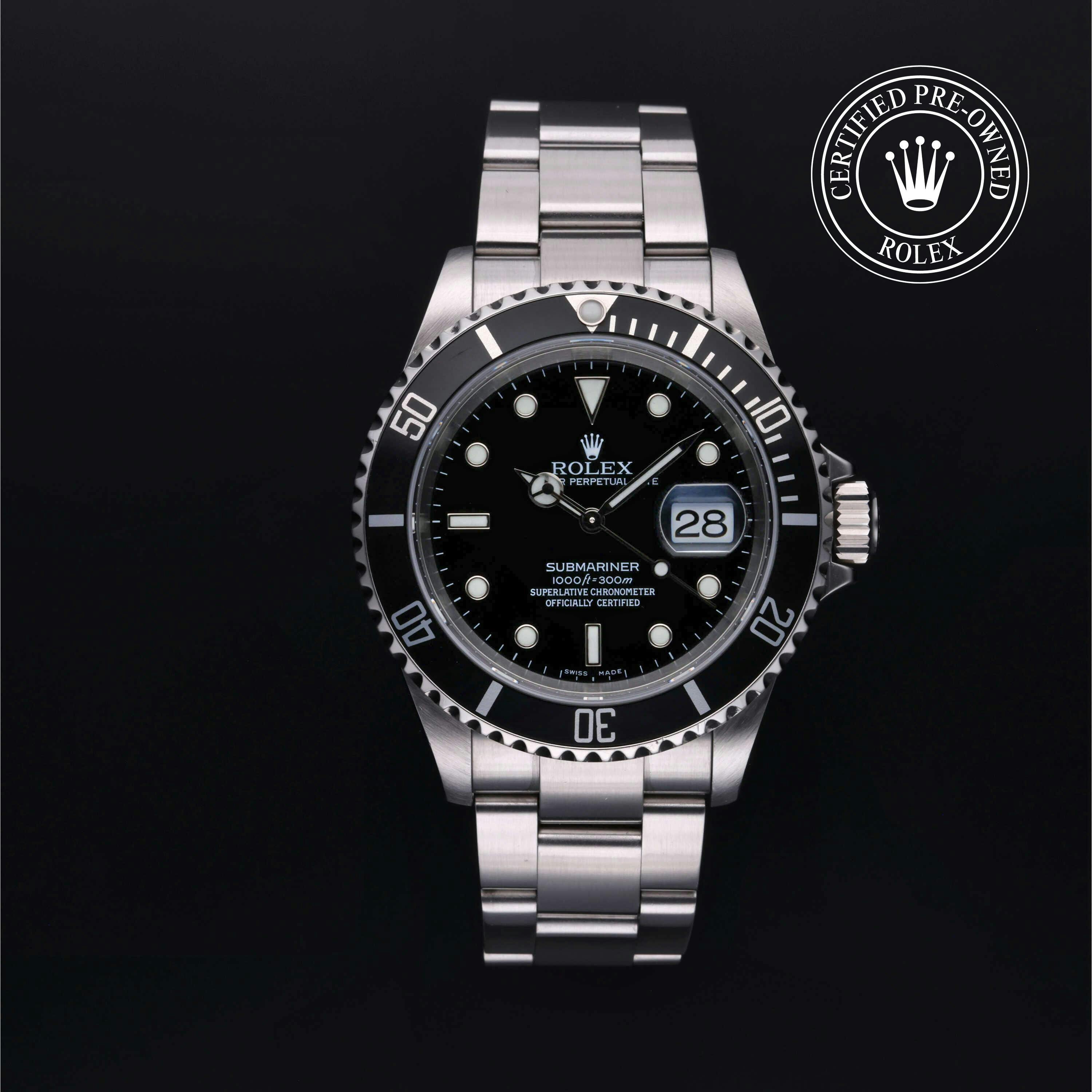 Rolex Certified Pre-Owned Submariner Date (16610) self - winding automatic watch, features a 40mm stainless steel case with a black aluminum bezel insert surrounding a black dial on a stainless steel oyster bracelet. Functions include hours, minutes, seconds and date. This watch has received Rolex-authorized service and certification. It does not come with the original box or papers, but includes a custom Rolex Certified Pre-Owned hang tag, travel pouch and RCPO international warranty card.
