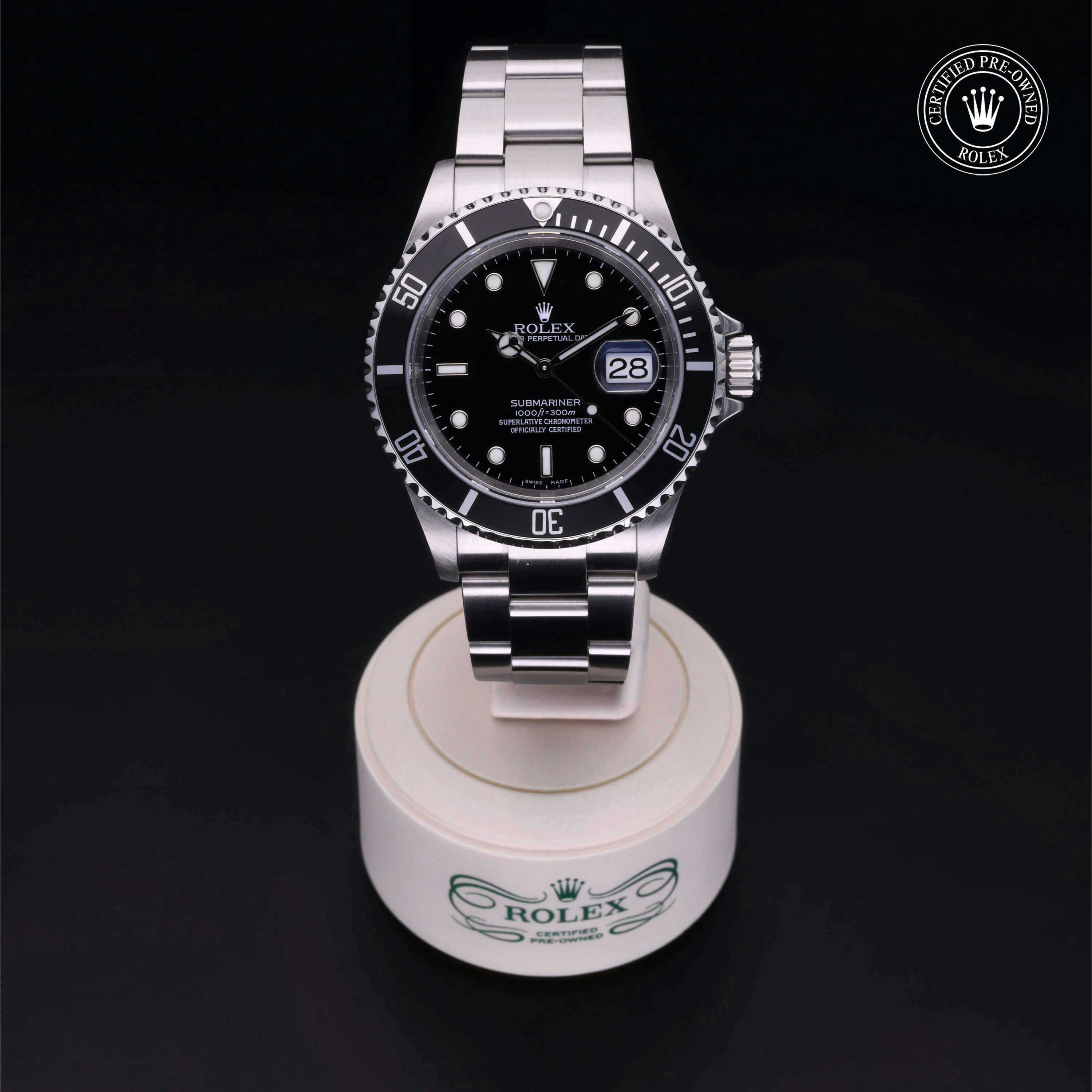 Rolex Certified Pre-Owned Submariner Date (16610) self - winding automatic watch, features a 40mm stainless steel case with a black aluminum bezel insert surrounding a black dial on a stainless steel oyster bracelet. Functions include hours, minutes, seconds and date. This watch has received Rolex-authorized service and certification. It does not come with the original box or papers, but includes a custom Rolex Certified Pre-Owned hang tag, travel pouch and RCPO international warranty card.