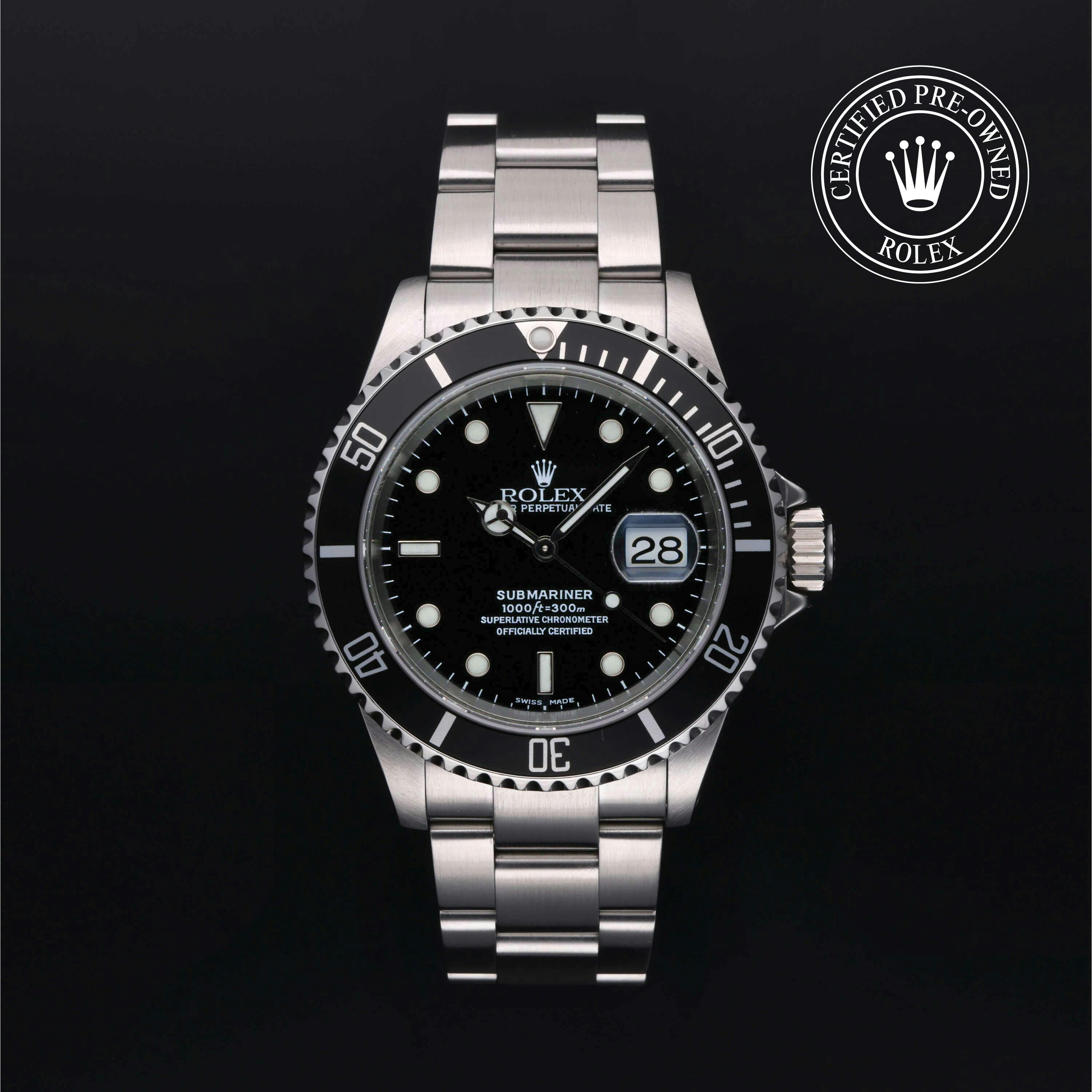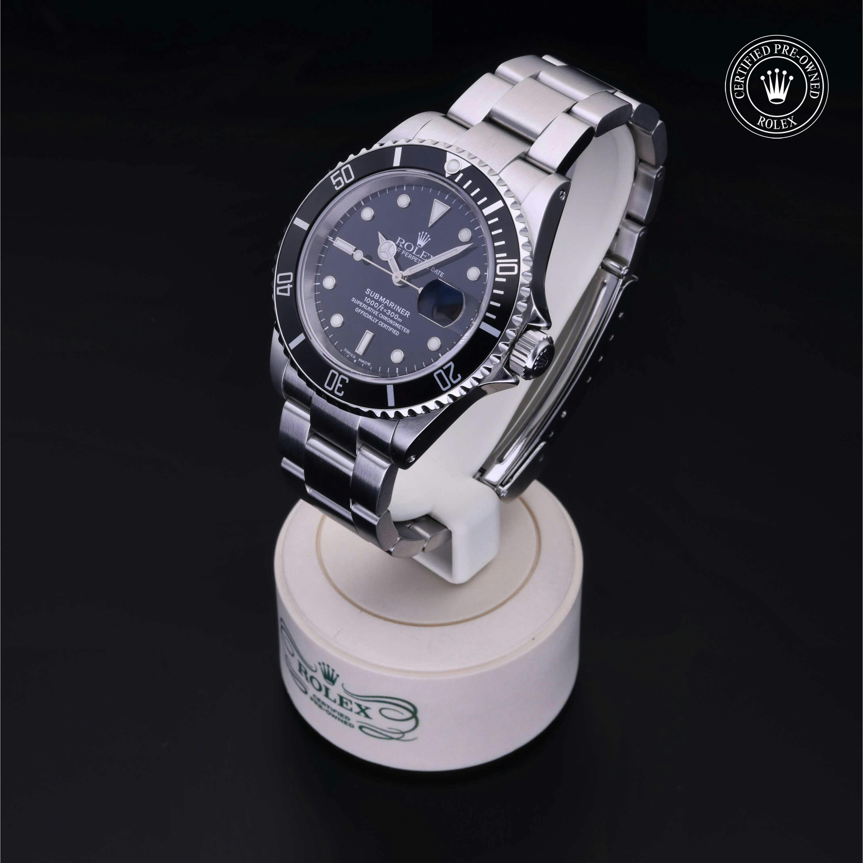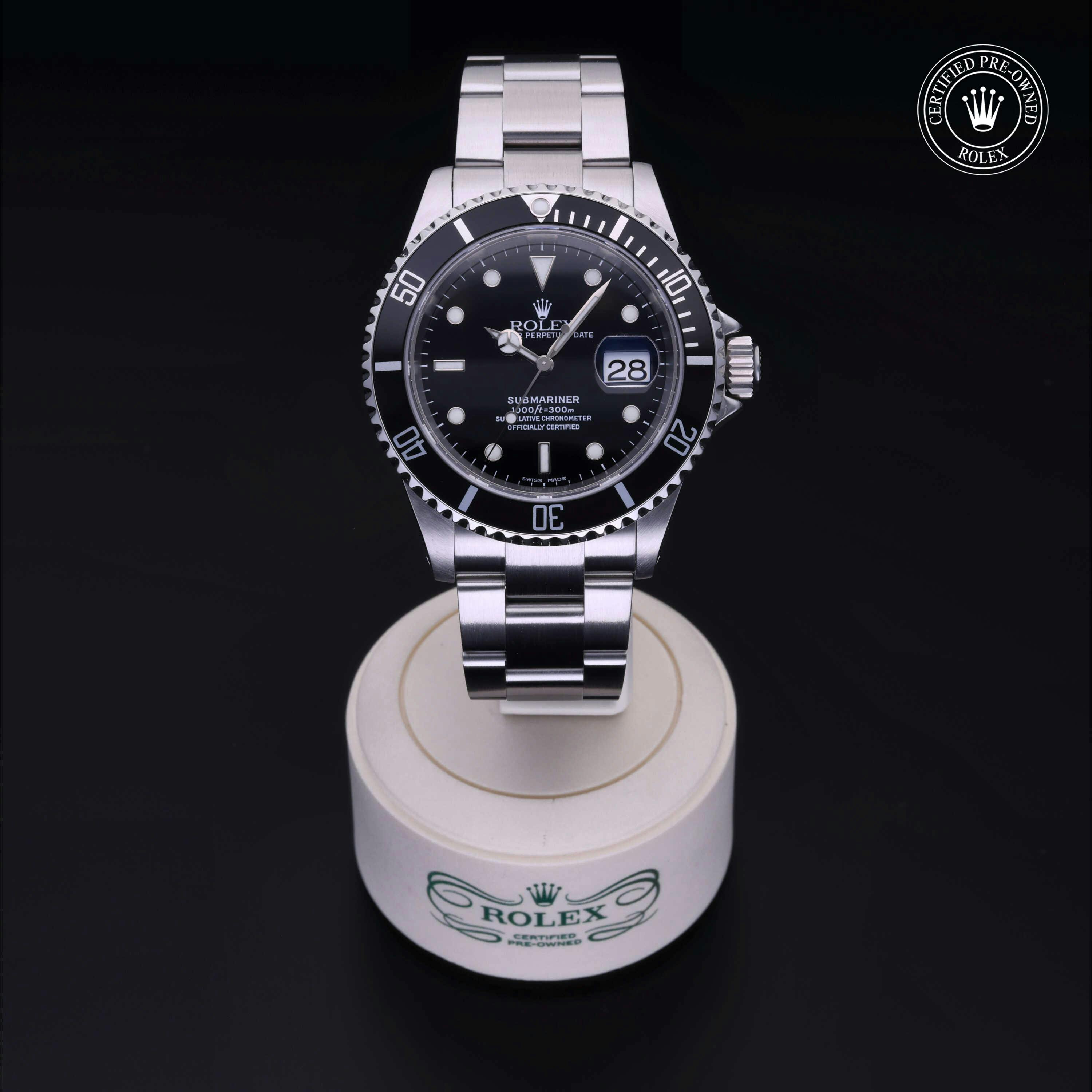 Rolex Certified Pre-Owned Submariner Date (16610) self - winding automatic watch, features a 40mm stainless steel case and unidirectional rotating bezel surrounding a black dial on a stainless steel oyster bracelet. Functions include hours, minutes, seconds and date. This watch has received Rolex-authorized service and certification. It does not come with the original box or papers, but includes a custom Rolex Certified Pre-Owned hang tag, travel pouch and RCPO international warranty card.