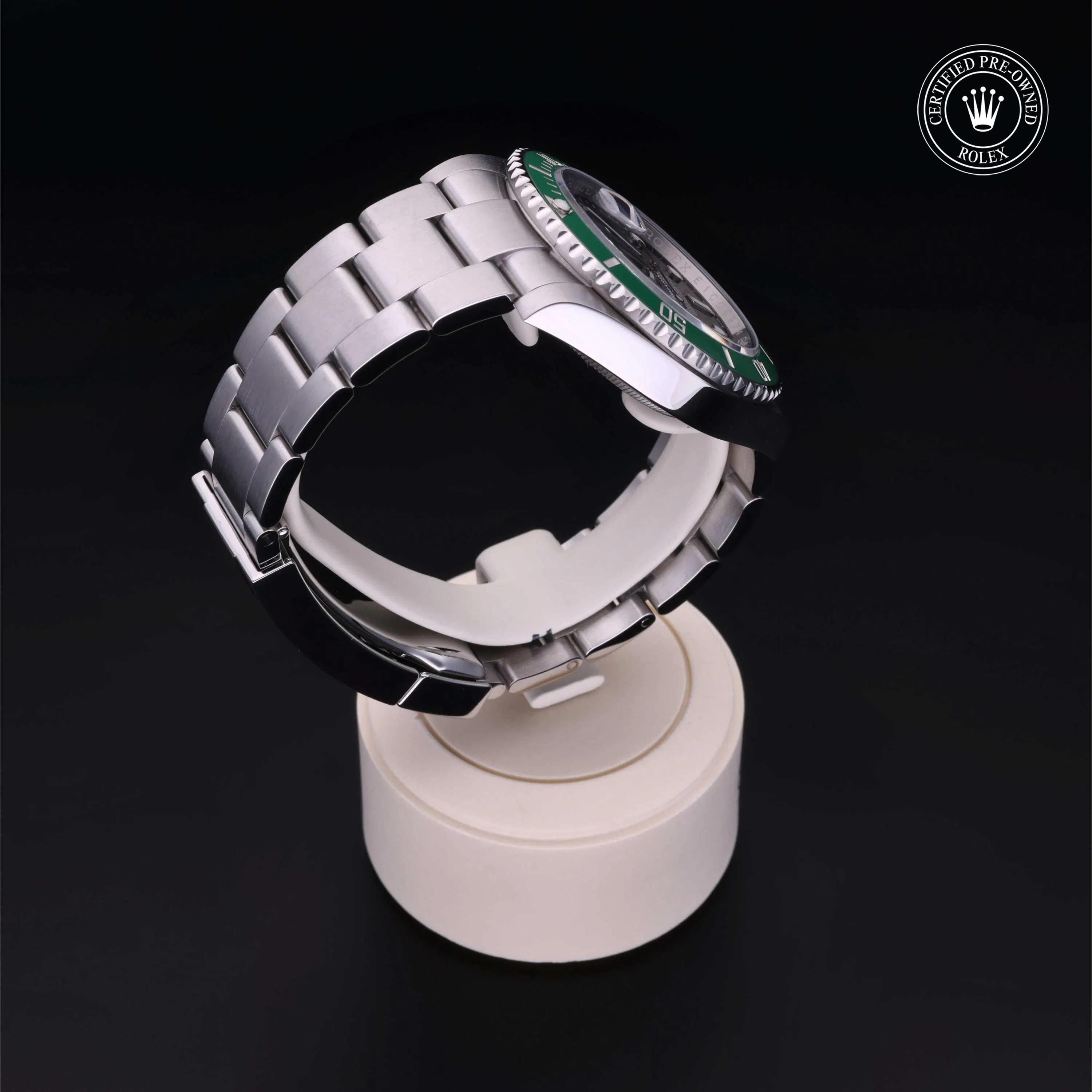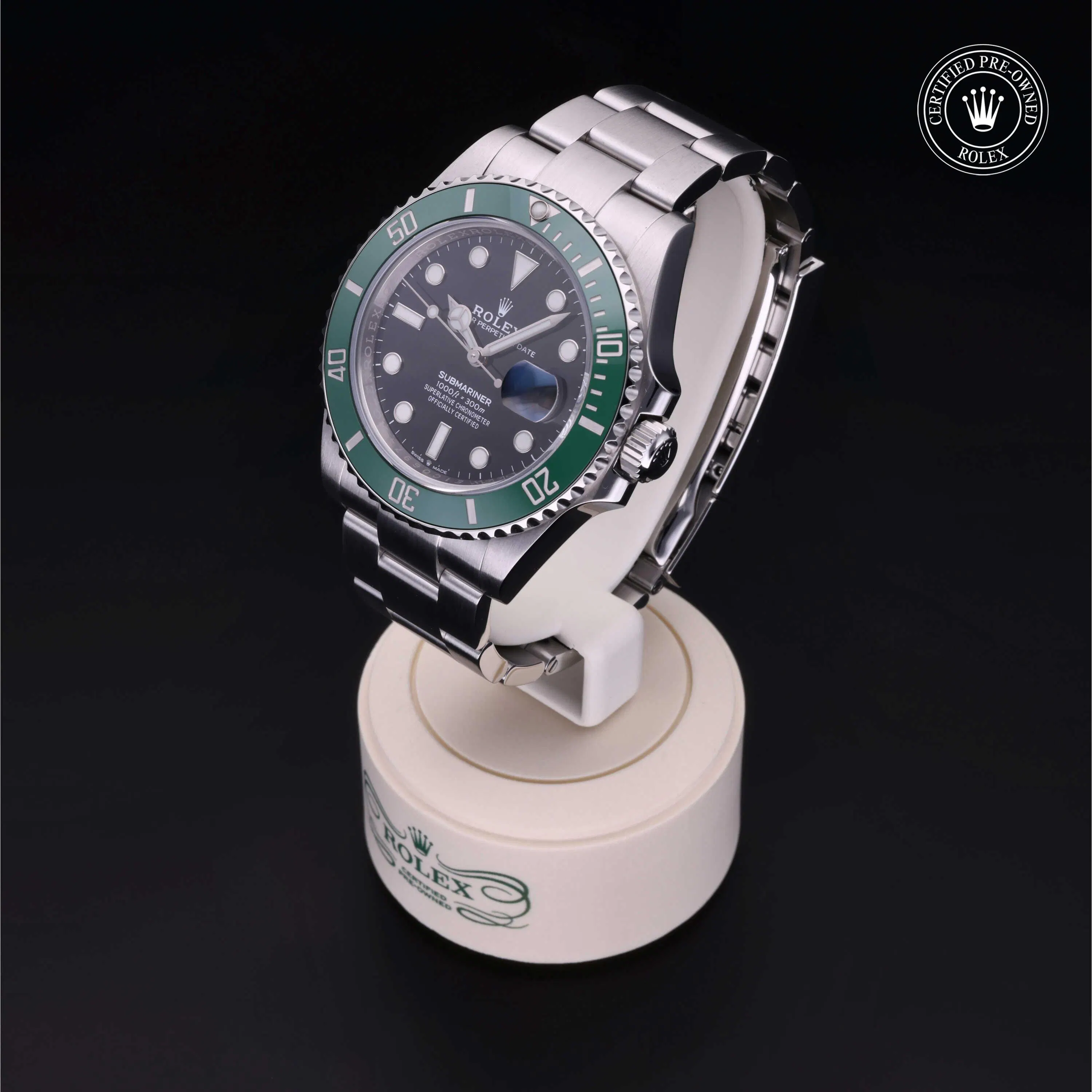 Rolex Certified Pre-Owned Submariner (126610LV) self - winding automatic watch, features a 41mm stainless steel case and rotating bezel with a green cerachrom insert surrounding a black dial on a stainless steel oyster bracelet. Functions include hours, minutes, seconds and date. This watch has received Rolex-authorized service and certification. It does not come with the original box or papers, but includes a custom Rolex Certified Pre-Owned hang tag, travel pouch and RCPO international warranty card.