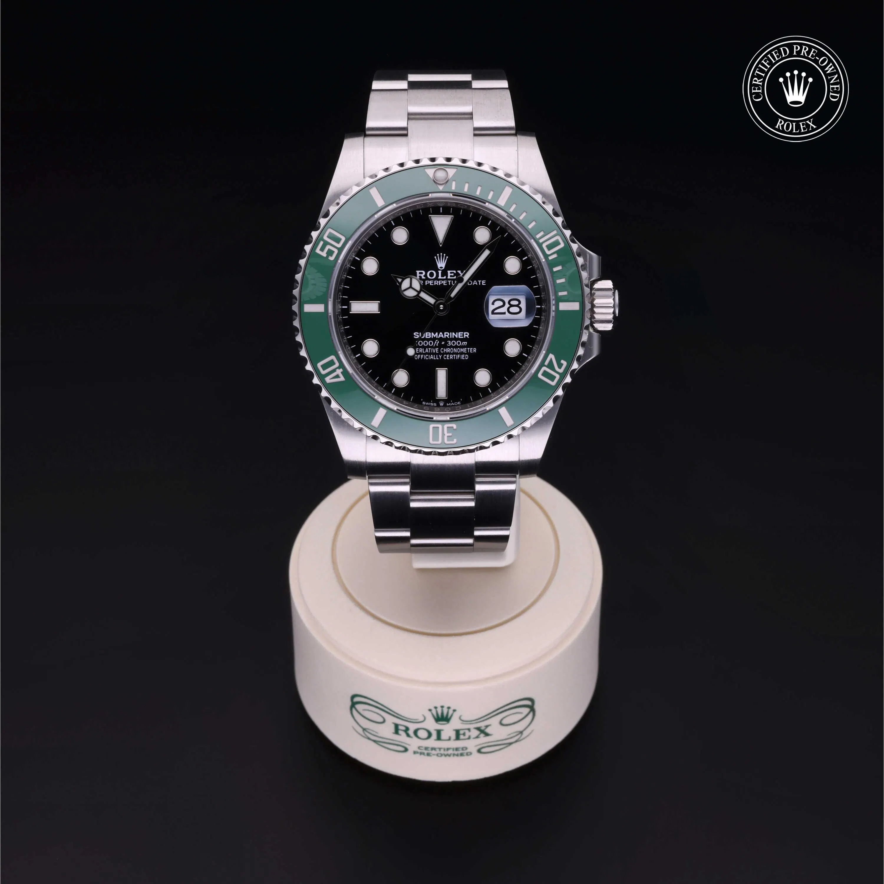 Rolex Certified Pre-Owned Submariner (126610LV) self - winding automatic watch, features a 41mm stainless steel case and rotating bezel with a green cerachrom insert surrounding a black dial on a stainless steel oyster bracelet. Functions include hours, minutes, seconds and date. This watch has received Rolex-authorized service and certification. It does not come with the original box or papers, but includes a custom Rolex Certified Pre-Owned hang tag, travel pouch and RCPO international warranty card.