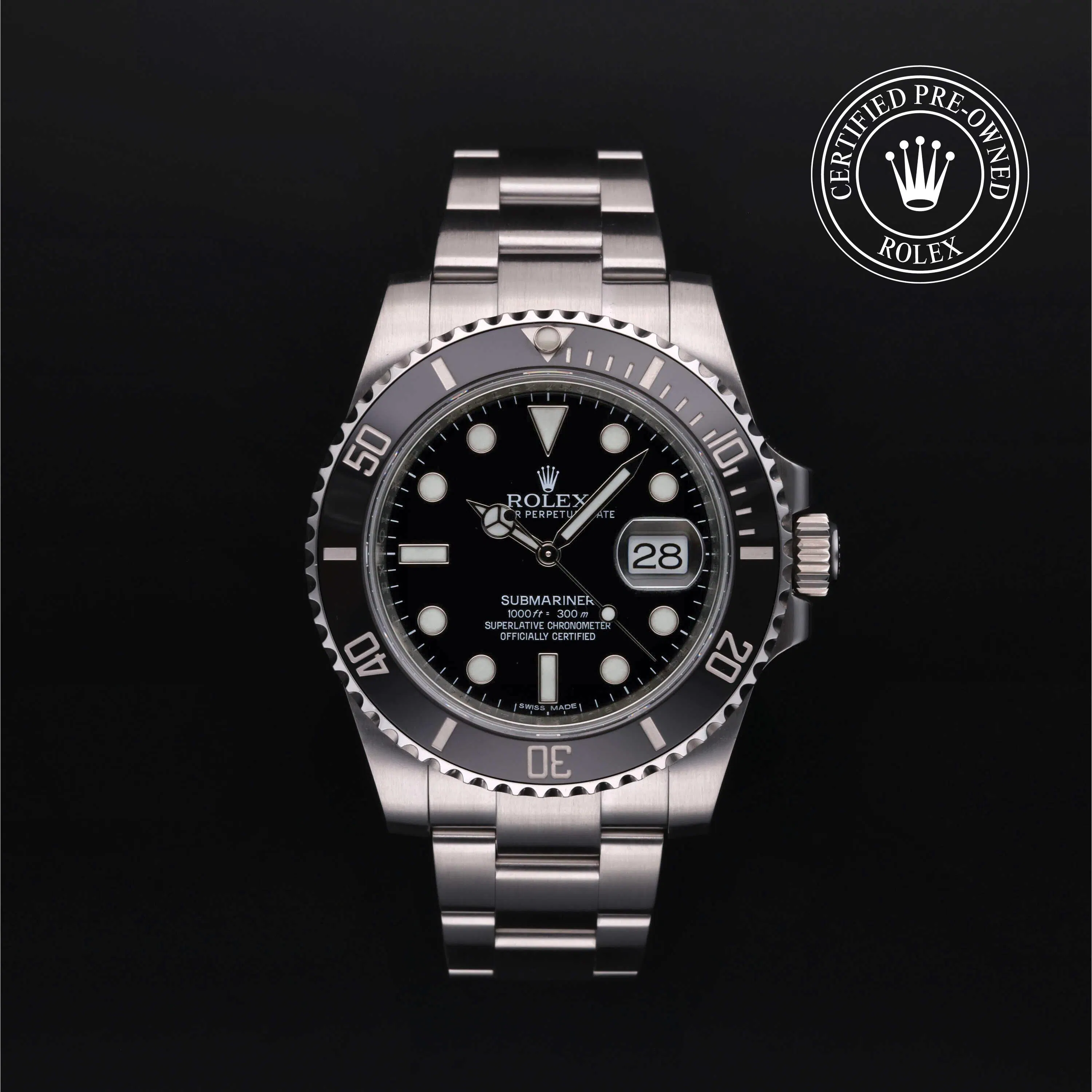 Rolex Certified Pre-Owned Submariner Date (116610LN) self - winding automatic watch, features a 40mm stainless steel case with a stainless steel and black cerchrom bezel surrounding a black dial. The watch is secured on a stainless steel Oyster bracelet complete with a folding buckle. Functions include hours, minutes, seconds and date. This watch has received Rolex-authorized service and certification. It comes with the original box and papers, and includes a custom Rolex Certified Pre-Owned hang tag, travel pouch and RCPO international warranty card.