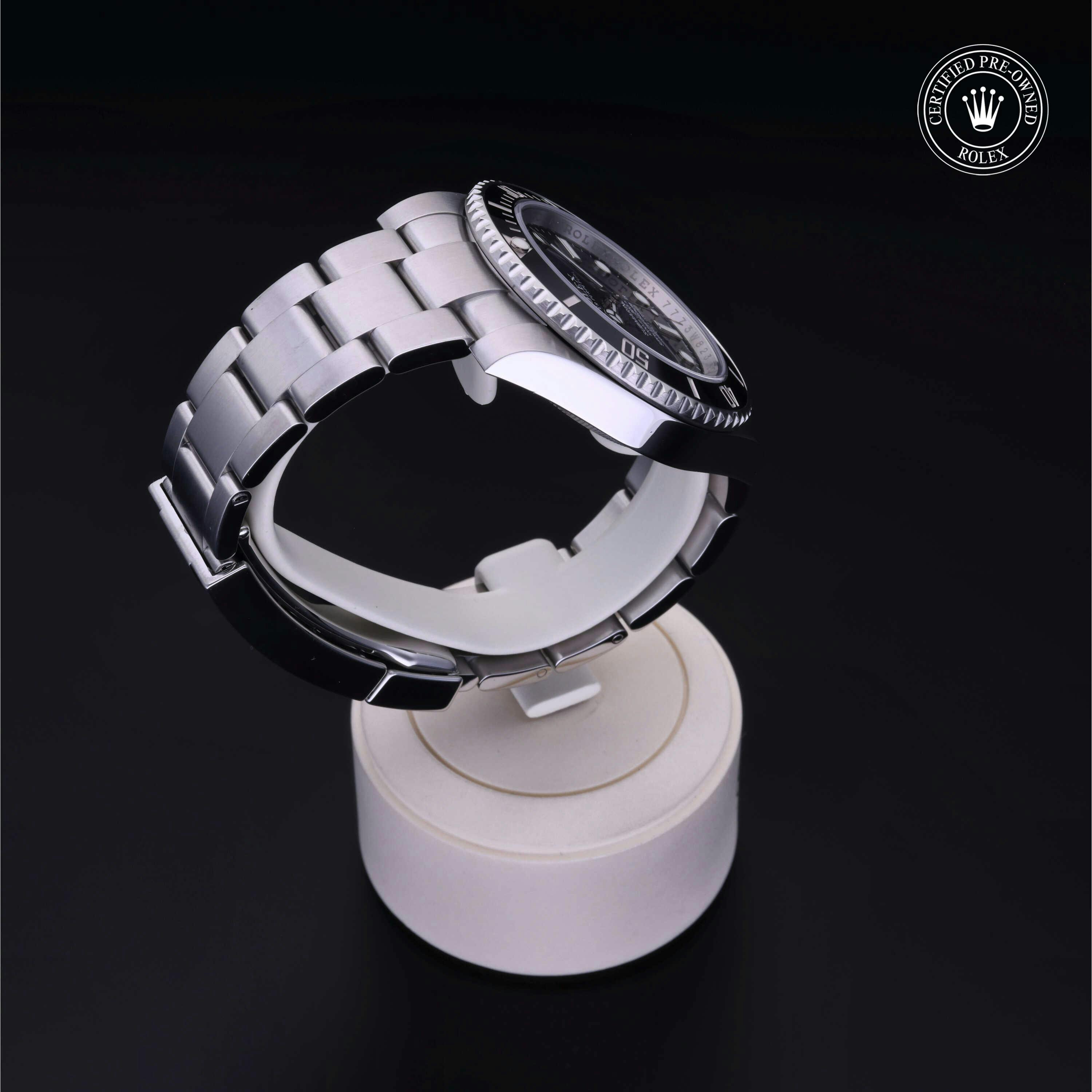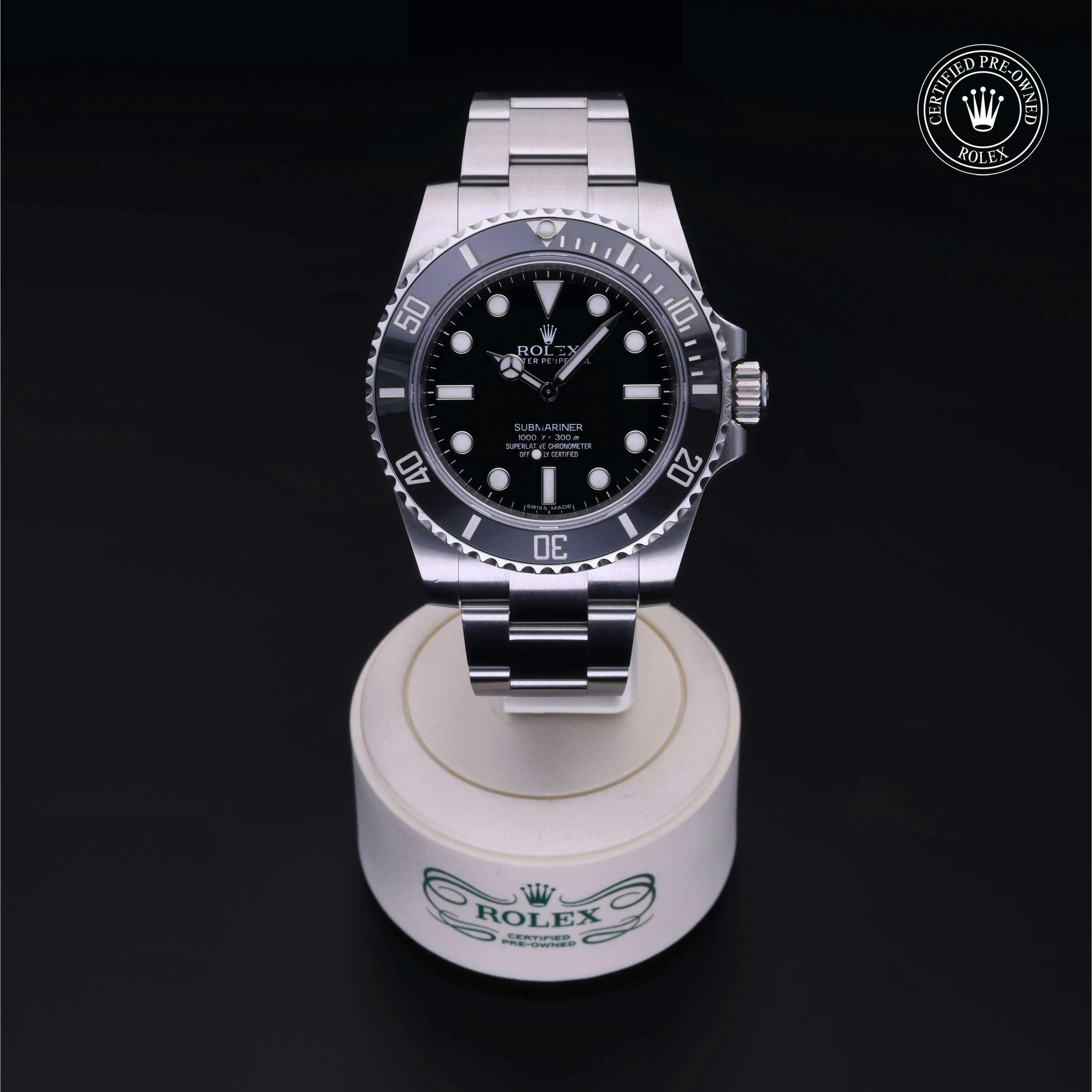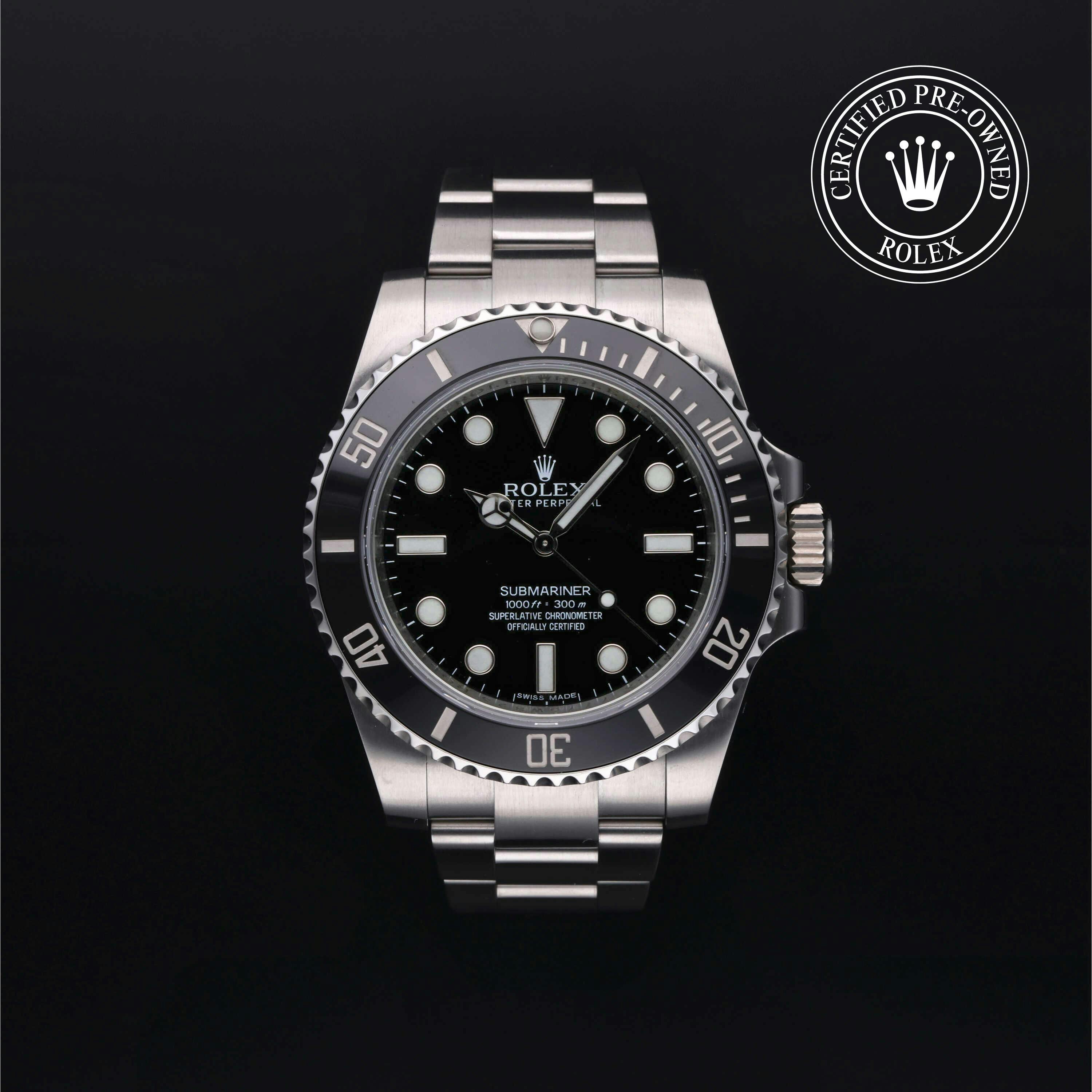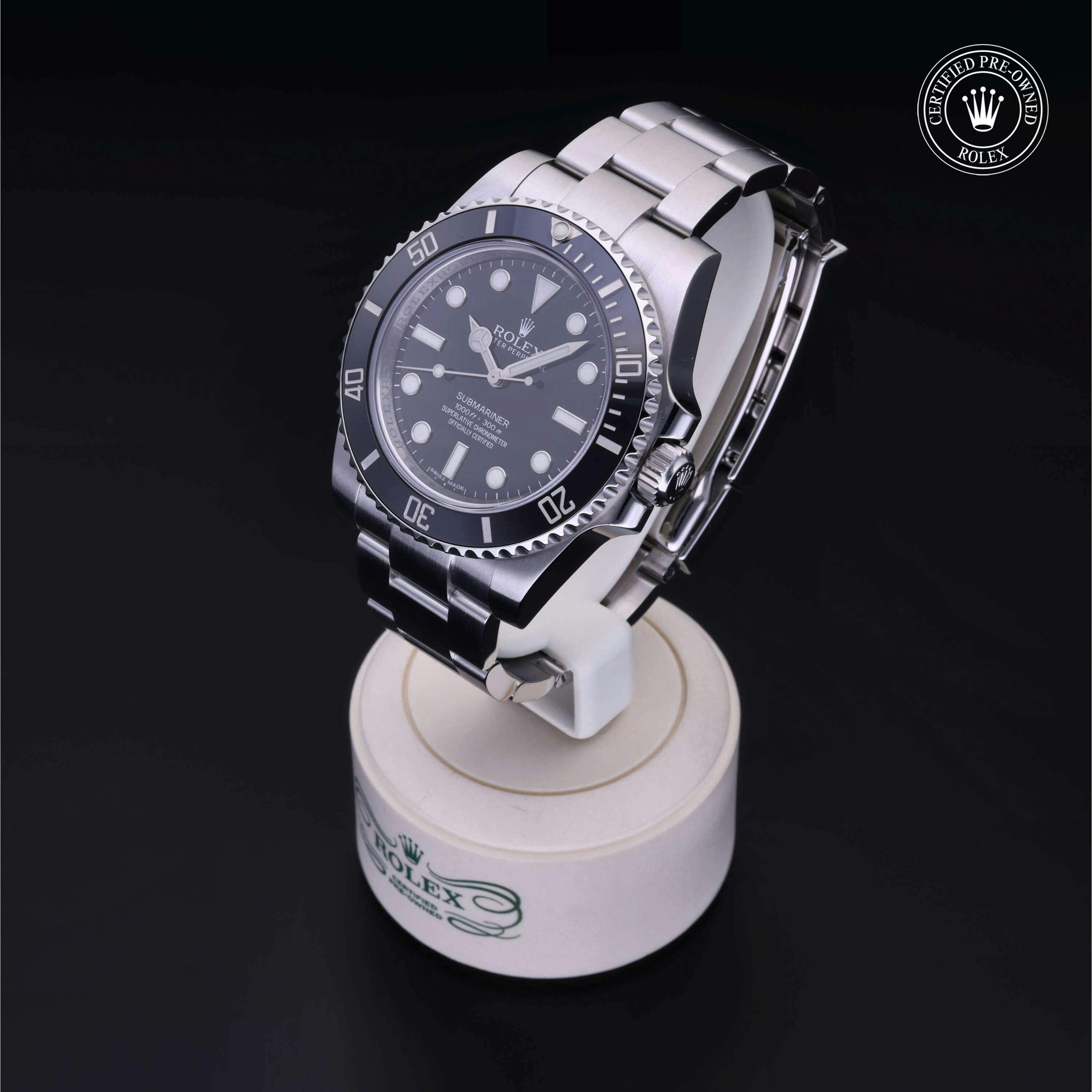 Rolex Certified Pre-Owned Submariner No Date (114060) self - winding automatic watch, features a 40mm stainless steel case and rotating bezel with a black cerachrom insert surrounding a black dial on a stainless steel oyster bracelet. Functions include hours, minutes and seconds. This watch has received Rolex-authorized service and certification. It does not come with the original box or papers, but includes a custom Rolex Certified Pre-Owned hang tag, travel pouch and RCPO international warranty card.