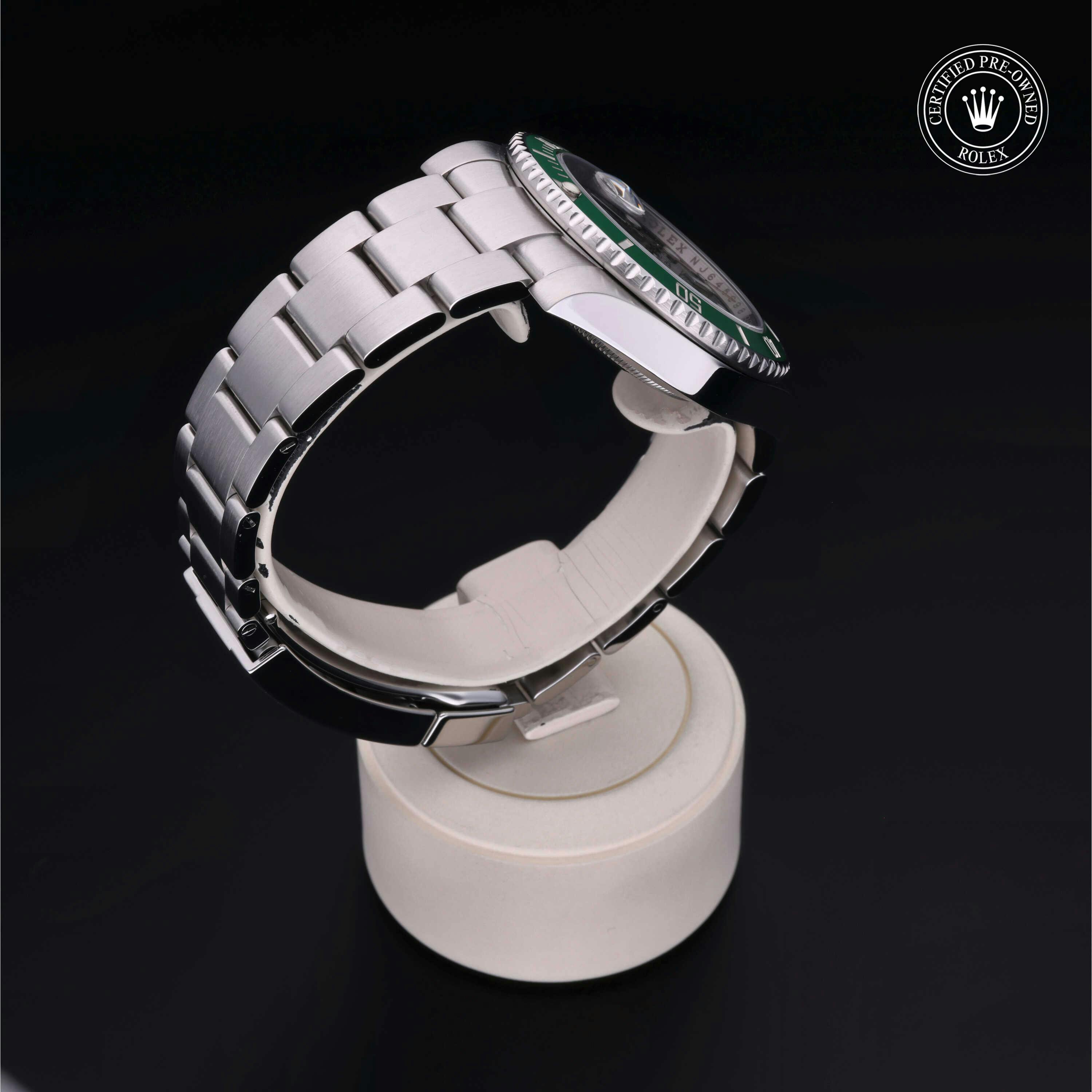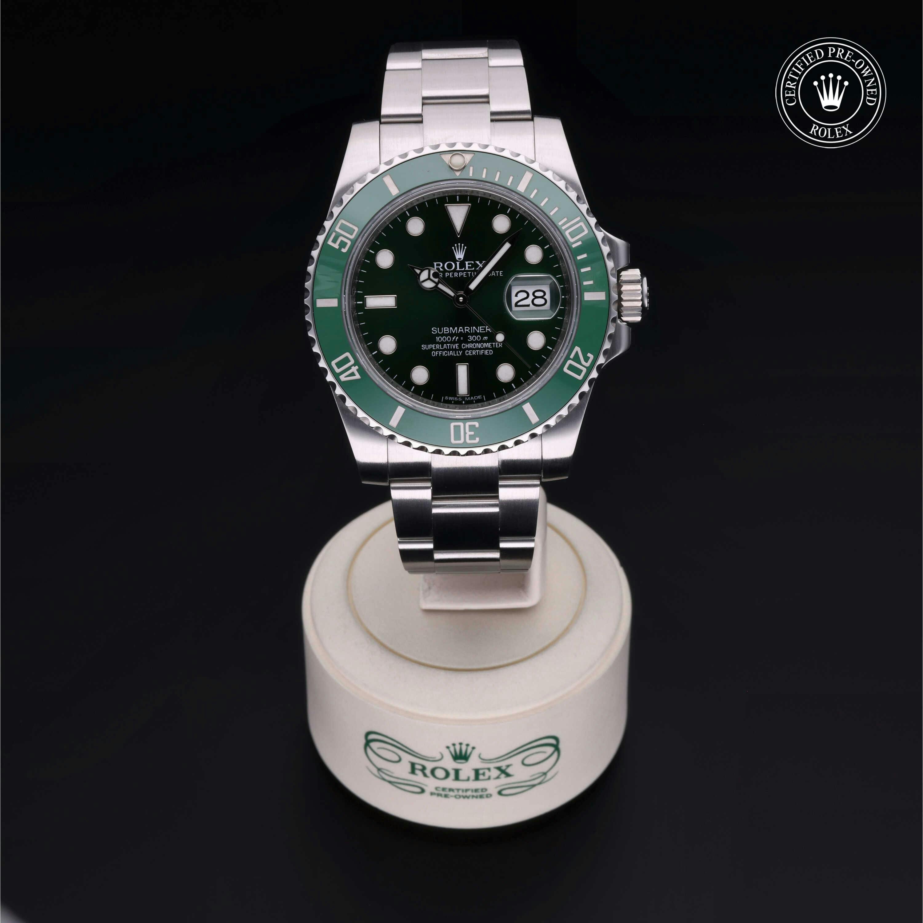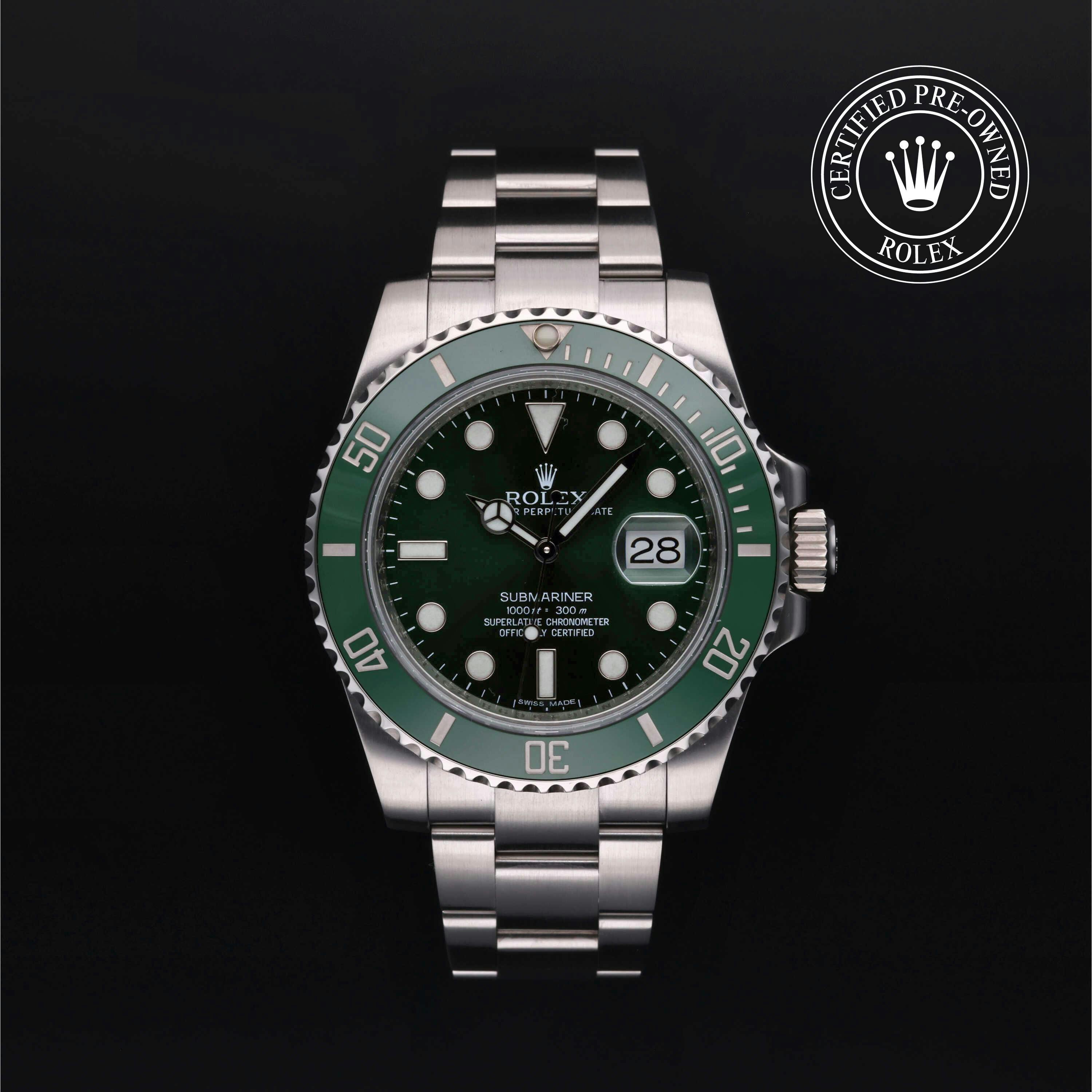Rolex Certified Pre-Owned Submariner Date (116610LV) self - winding automatic watch, features a 40mm stainless steel case and rotating bezel with a green cerachrom insert surrounding a green dial on a stainless steel oyster bracelet. Functions include hours, minutes, seconds and date. This watch has Rolex-authorized service and certification. It comes with the original papers, and includes a custom Rolex Certified Pre-Owned hang tag, travel pouch and RCPO international warranty card.