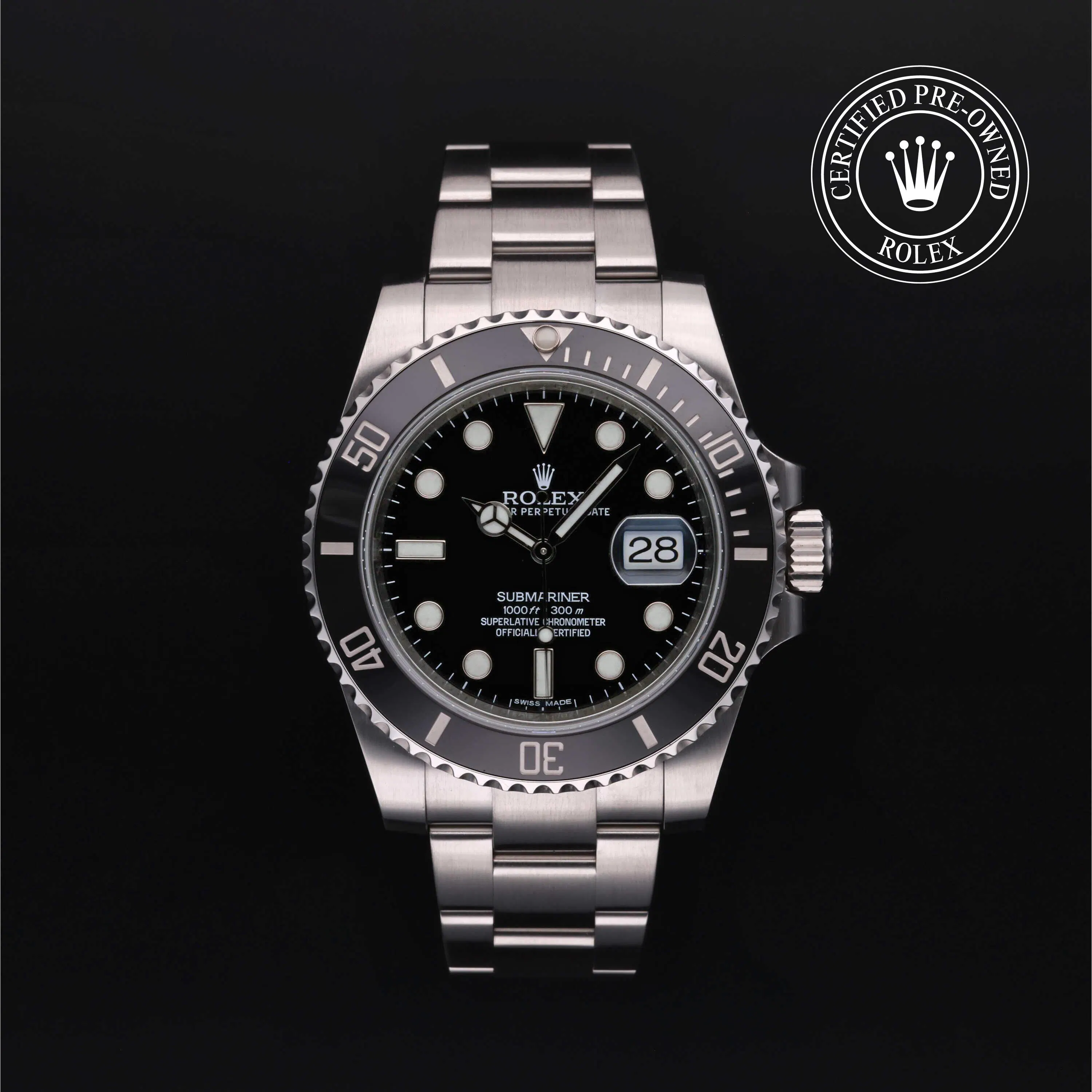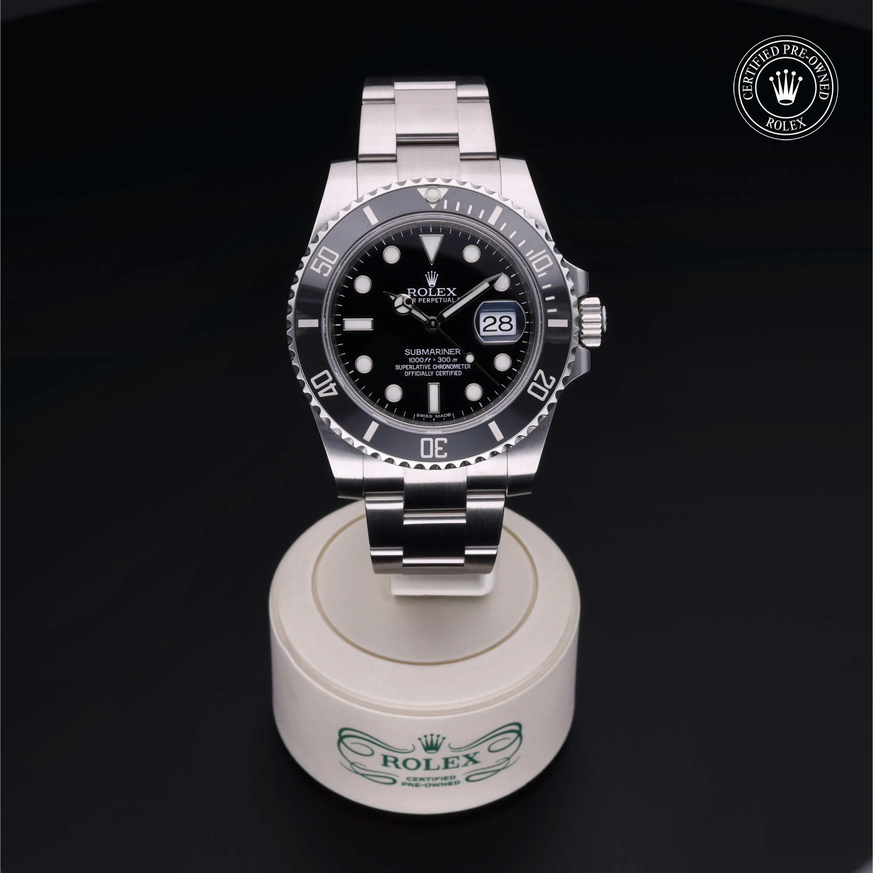 Rolex Certified Pre-Owned Submariner Date (116610LN) self - winding automatic watch, features a 40mm stainless steel case and rotating bezel with a black cerachrom insert surrounding a black dial on a stainless steel oyster bracelet. Functions include hours, minutes, seconds and date. This watch has received Rolex-authorized service and certification. It comes with the original box and papers, and includes a custom Rolex Certified Pre-Owned hang tag, travel pouch and RCPO international warranty card.