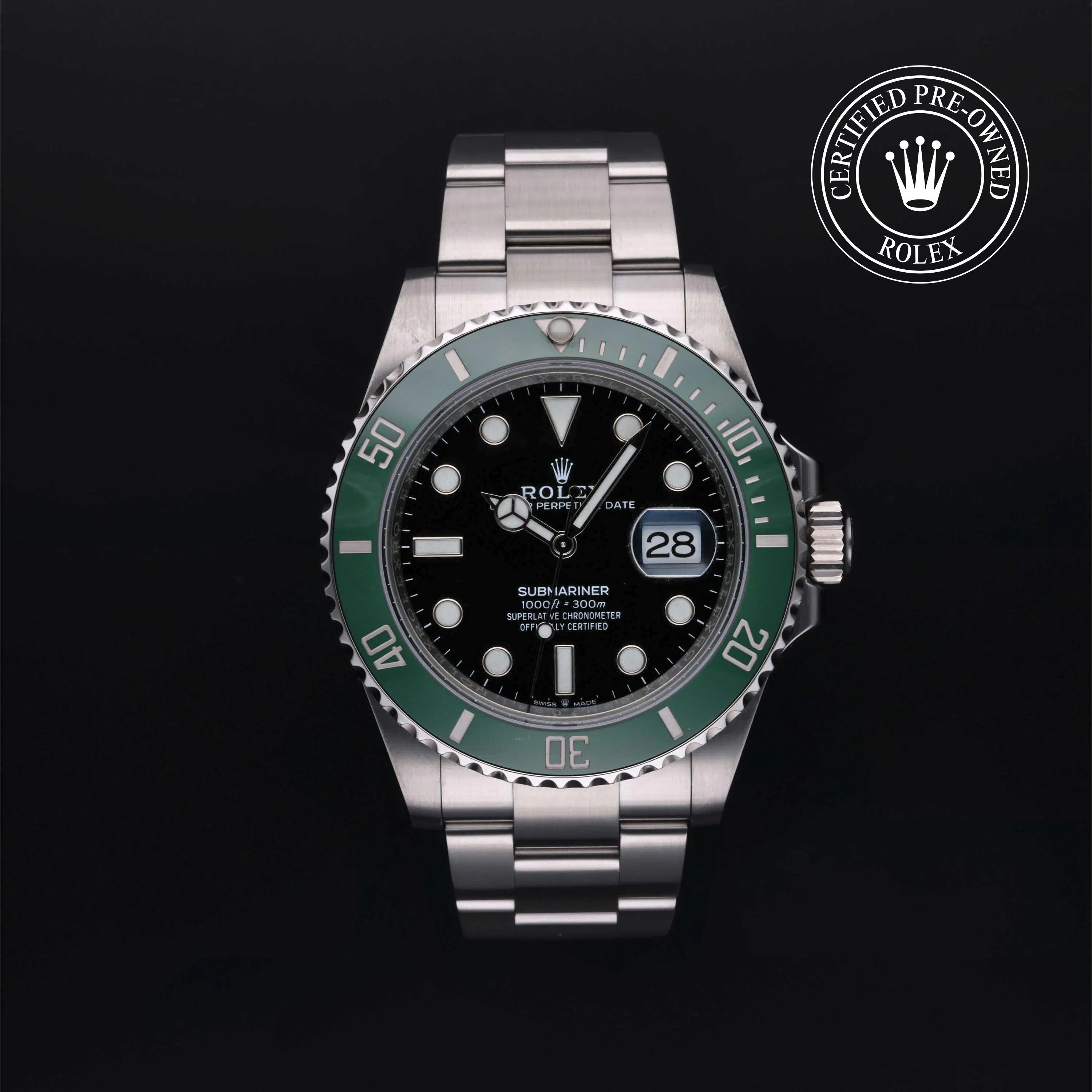 Rolex Certified Pre-Owned Submariner Date (126610LV) self - winding automatic watch, features a 41mm stainless steel case and unidirectional rotating bezel fitted with a green cerachrom 60-minute scale insert surrounding a black dial. The watch is secured on a stainless steel Oyster bracelet complete with a folding buckle. Functions include hours, minutes, seconds and date. This watch has received Rolex-authorized service and certification. It comes with the original box and papers, and includes a custom Rolex Certified Pre-Owned hang tag, travel pouch and RCPO international warranty card.