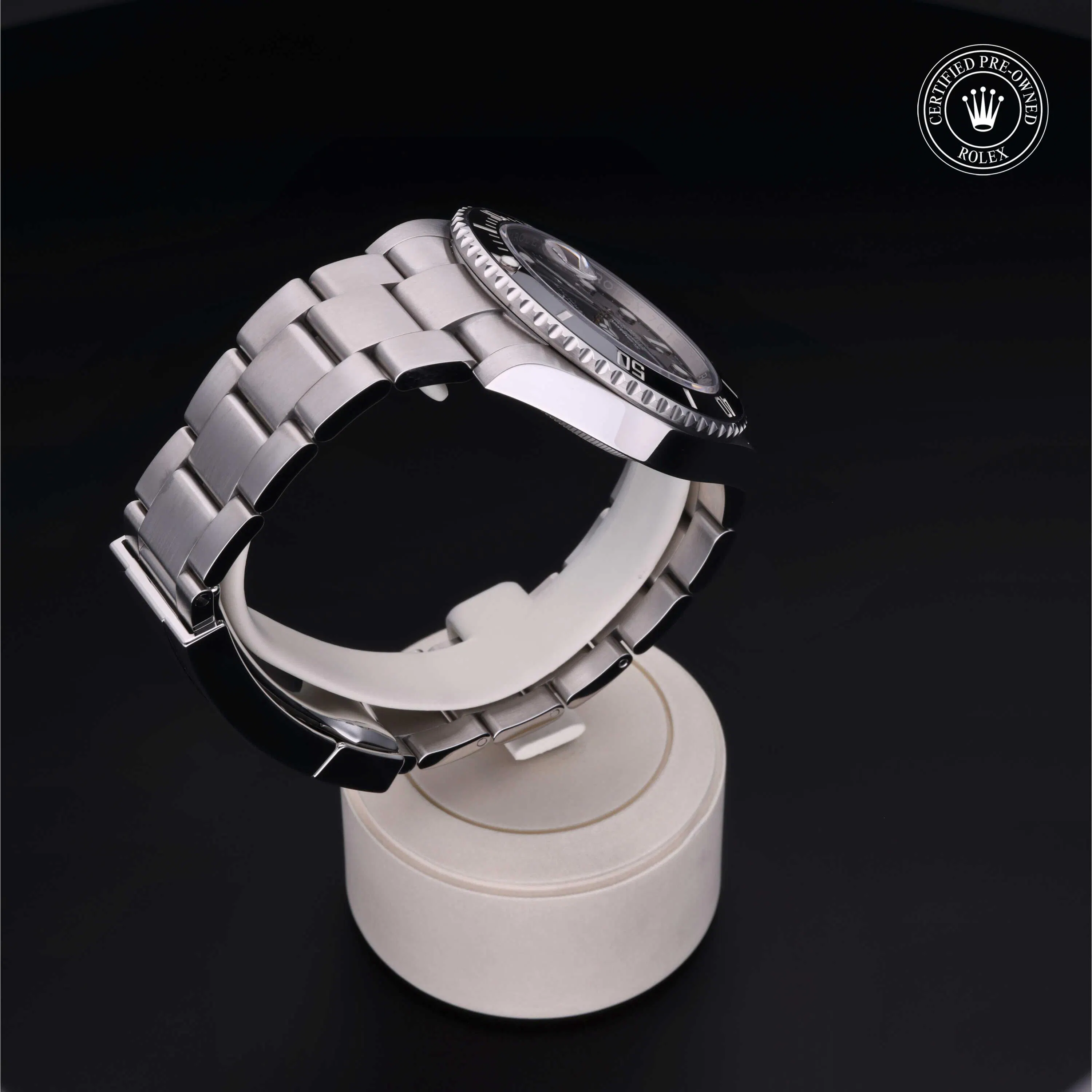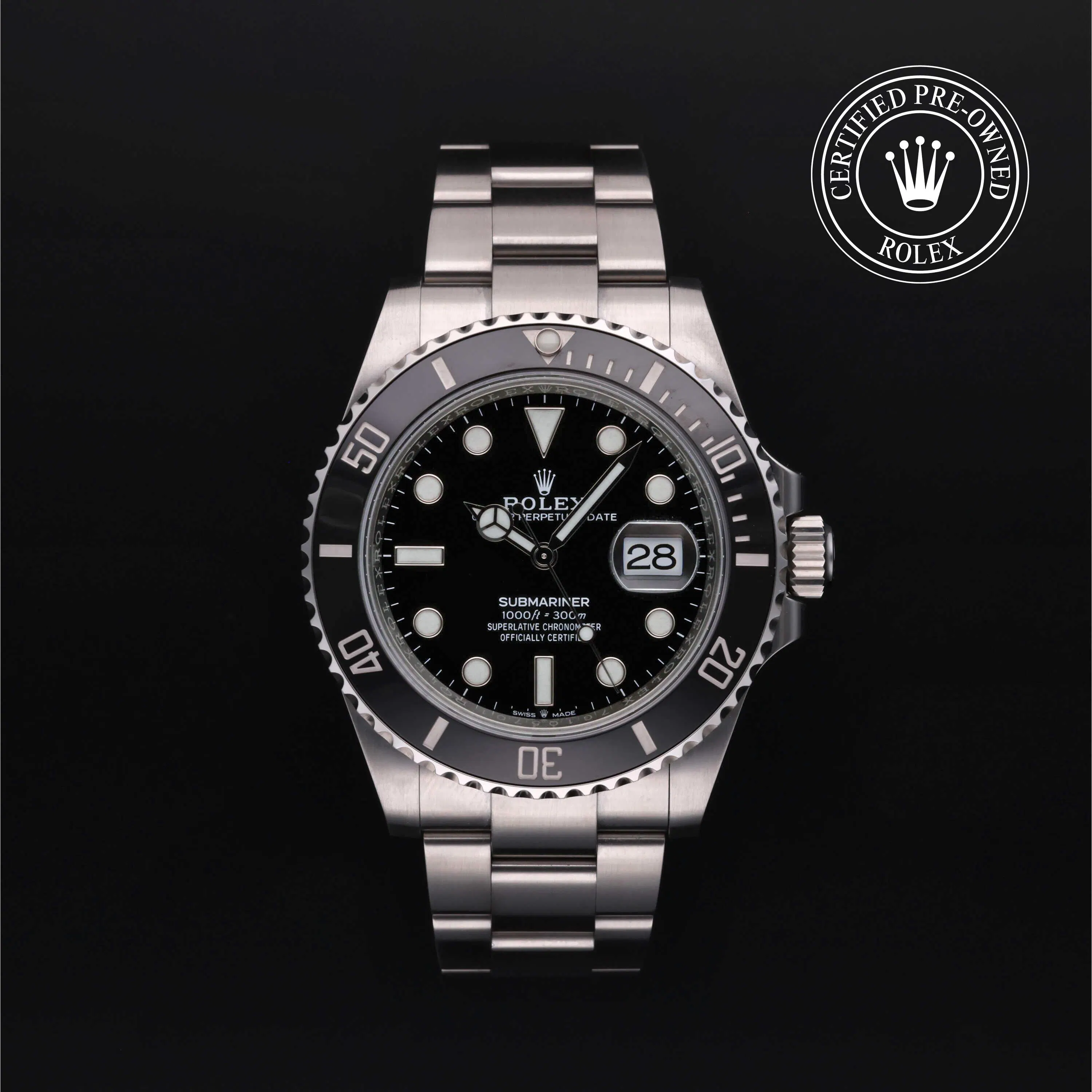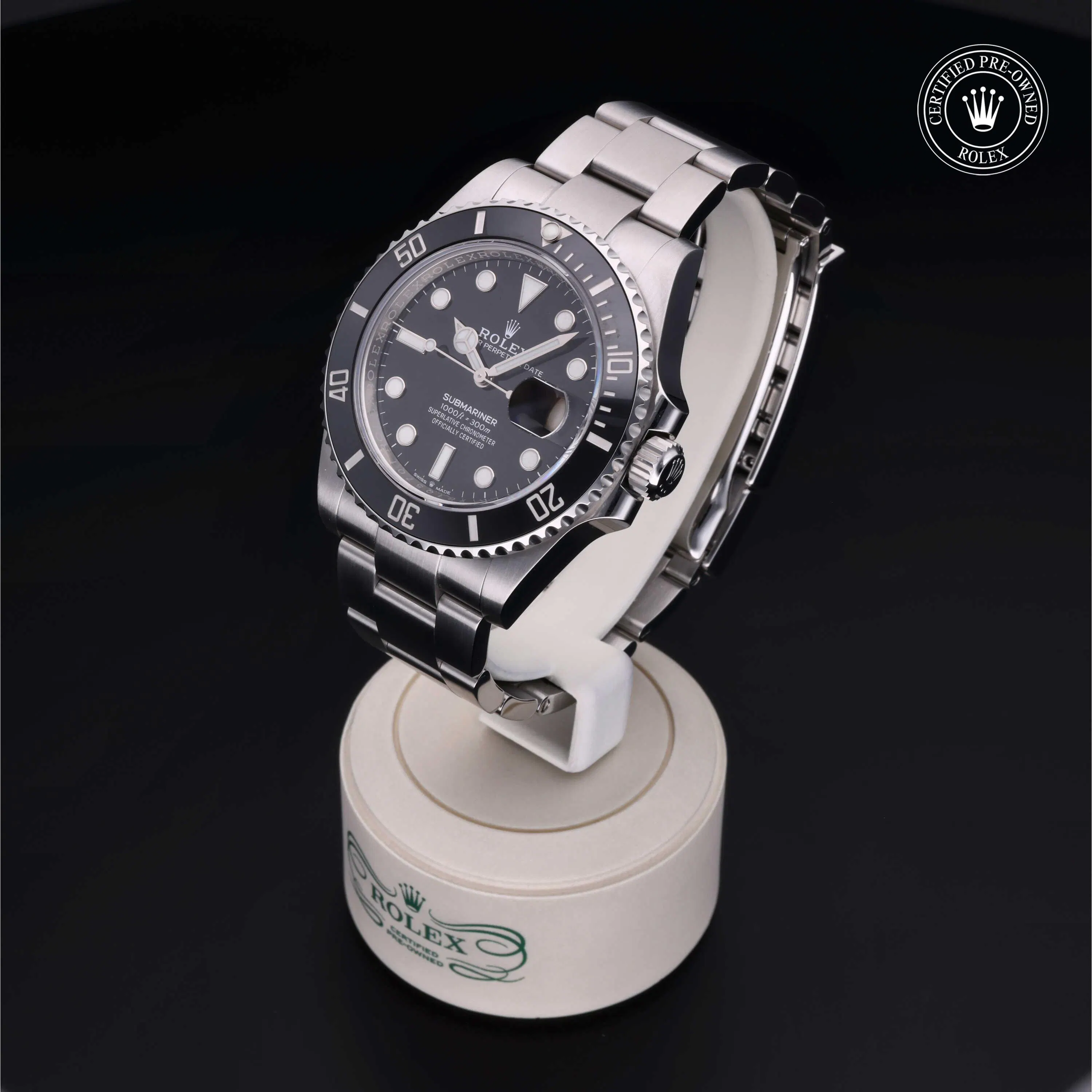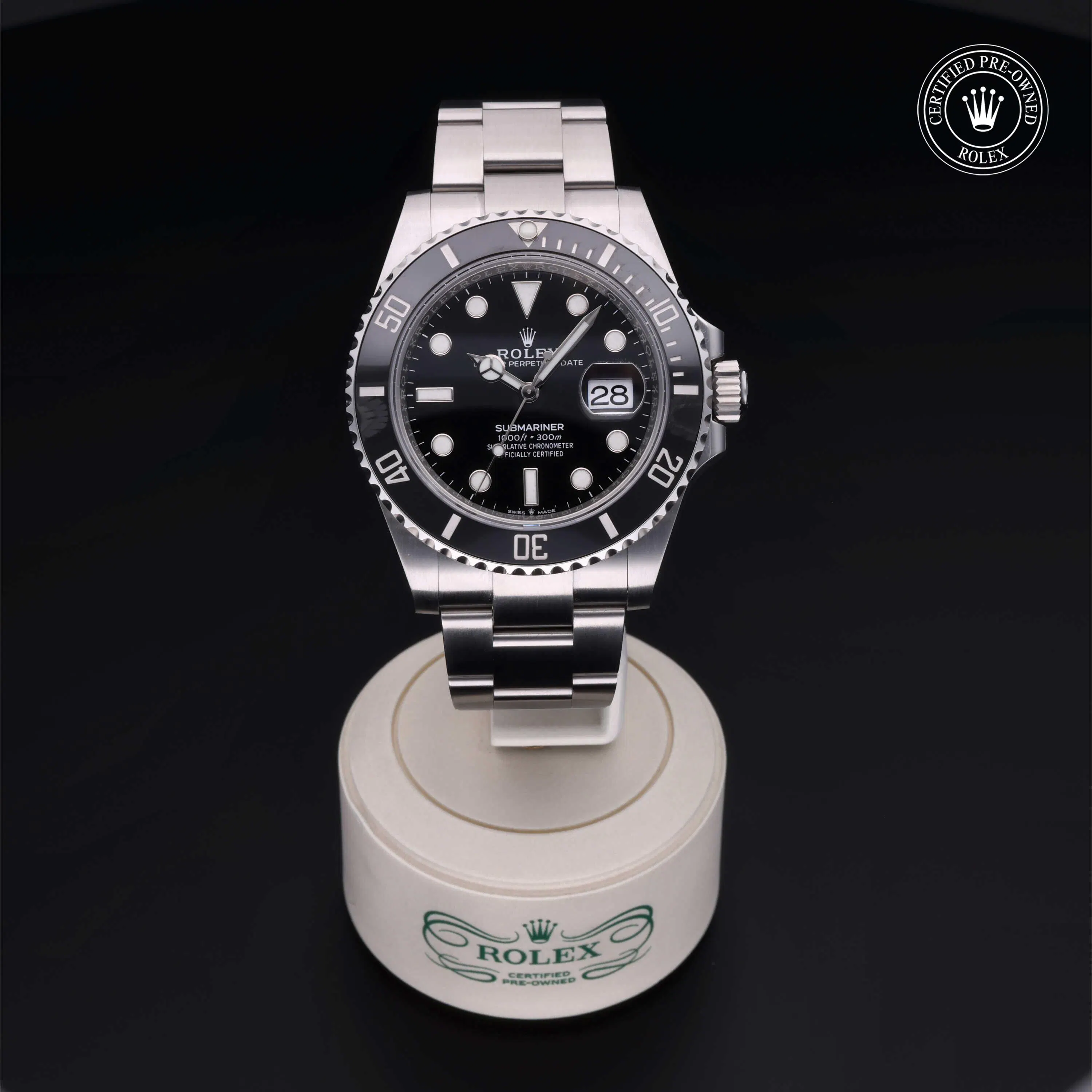 Rolex Certified Pre-Owned Submariner Date (126610LN) self - winding automatic watch, features a 41mm stainless steel case and unidirectional rotating bezel with a black cerachrom insert surrounding a black dial on a stainless steel oyster bracelet. Functions include hours, minutes, seconds and date. This watch has received Rolex-authorized service and certification. It comes with the original box and papers, and includes a custom Rolex Certified Pre-Owned hang tag, travel pouch and RCPO international warranty card.