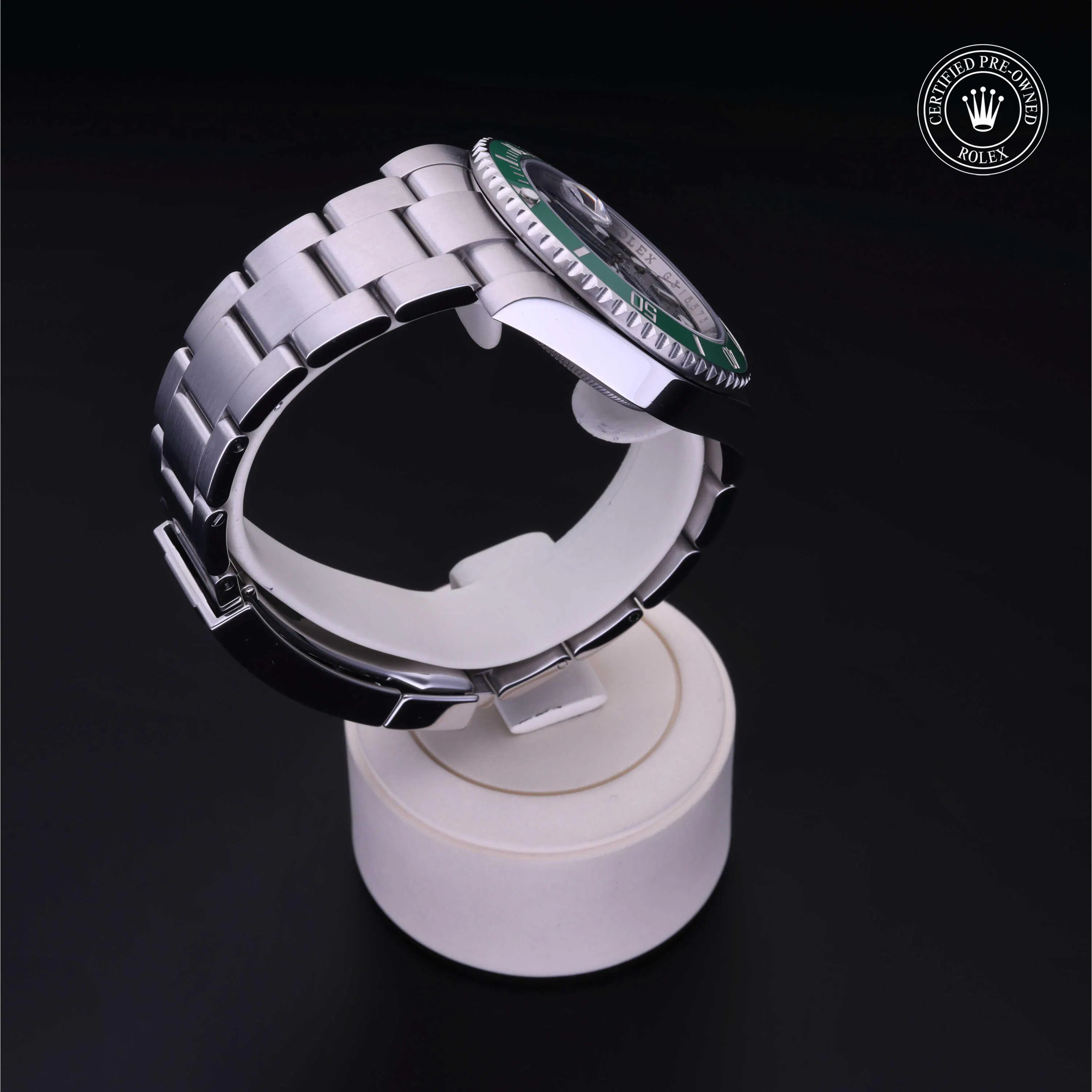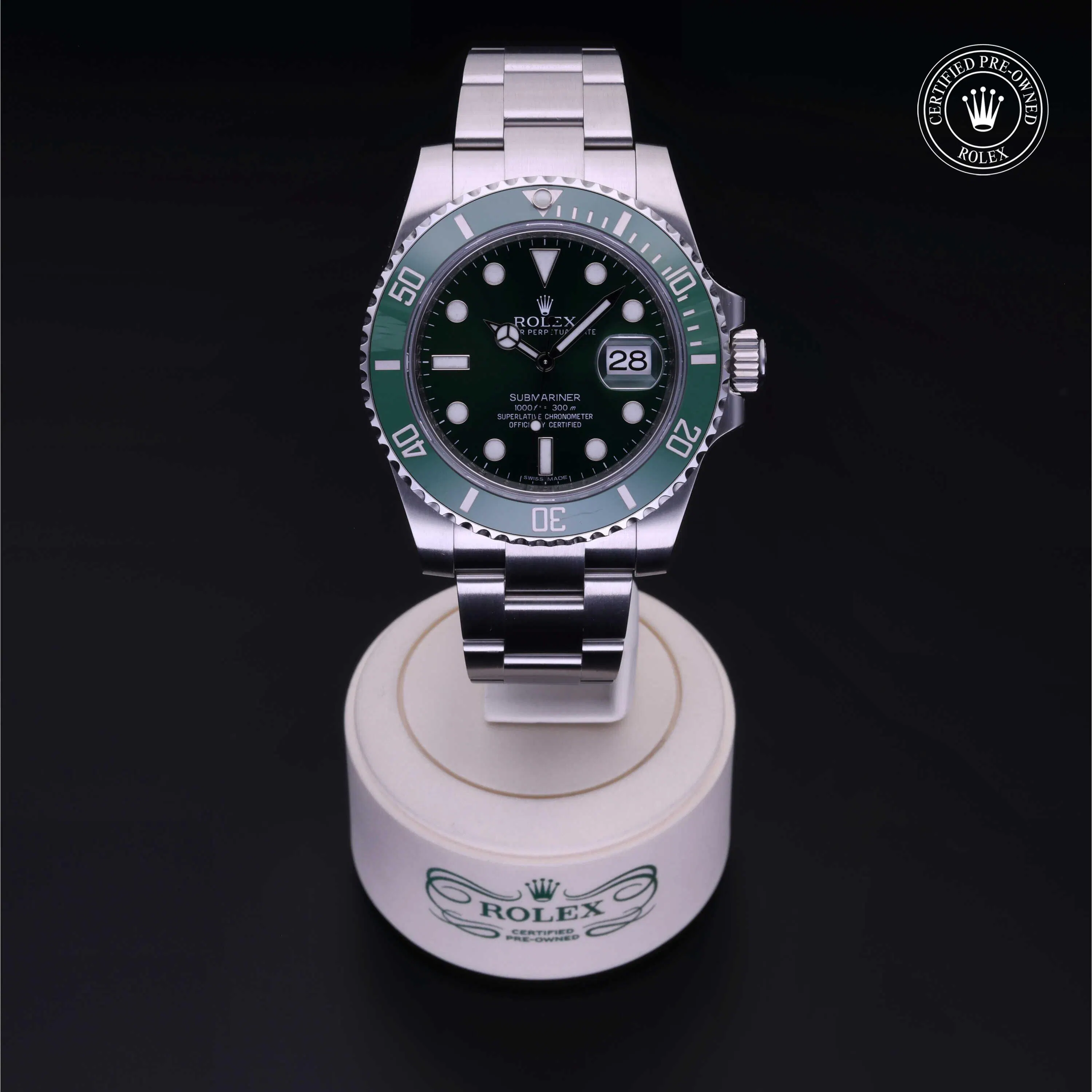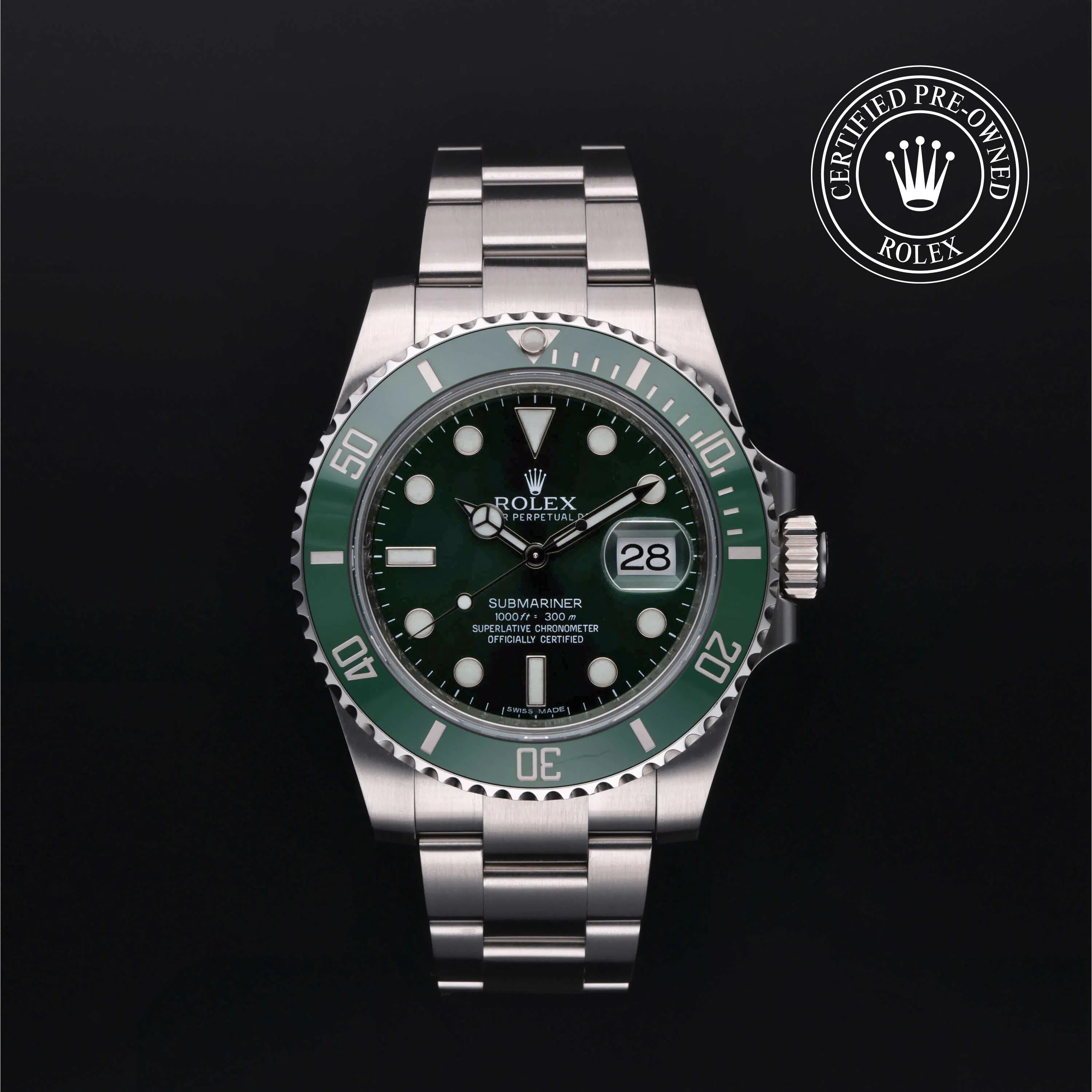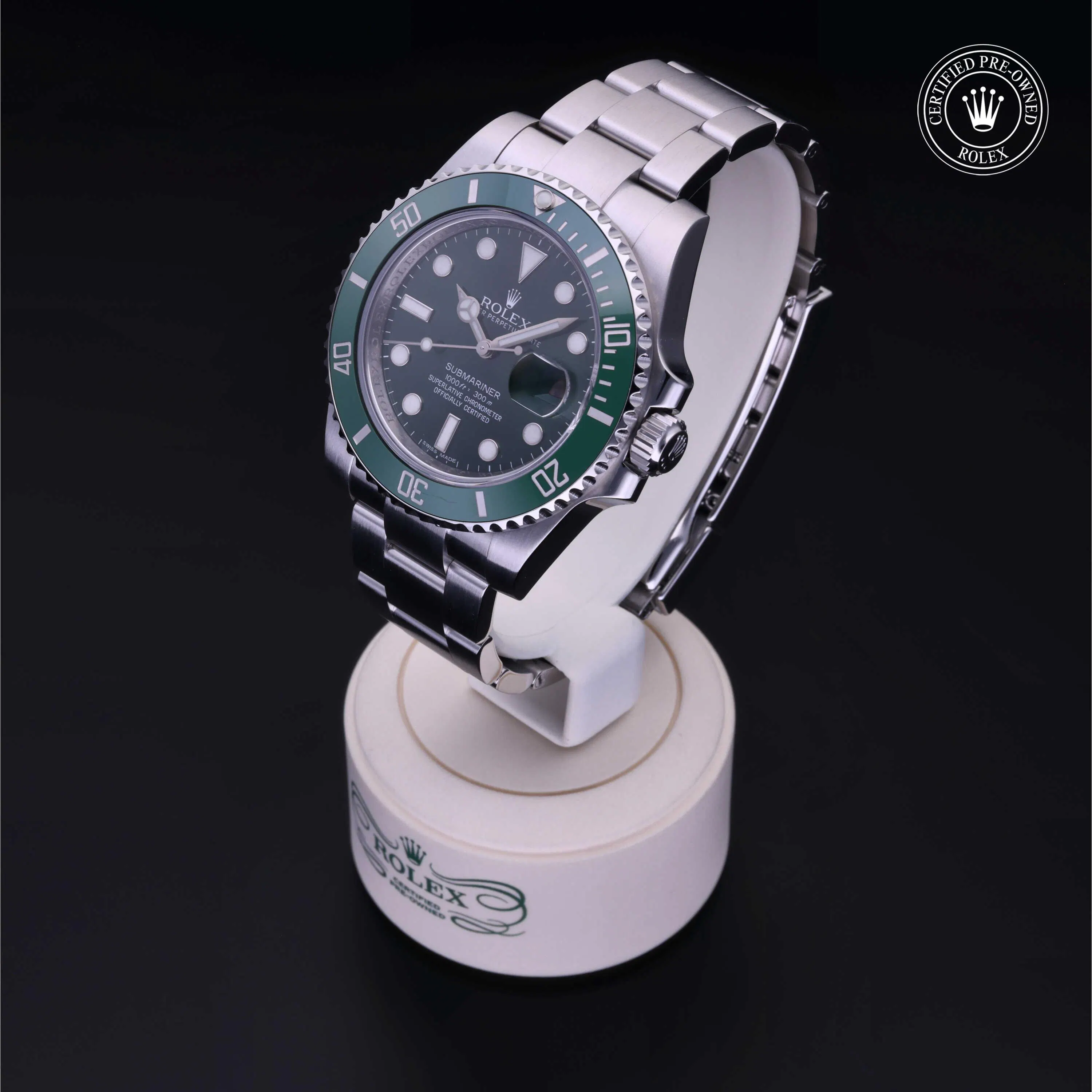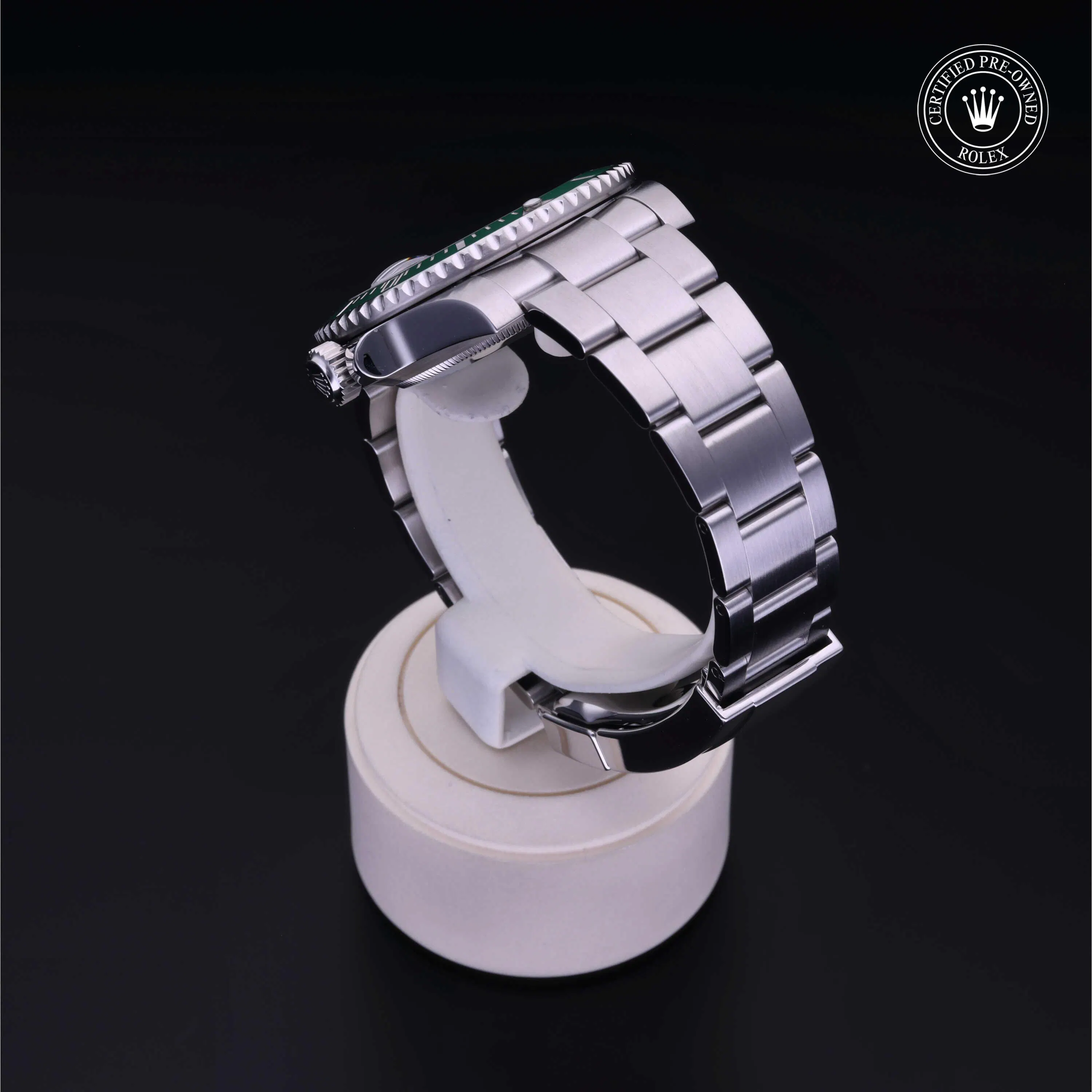 Rolex Certified Pre-Owned Submariner Date (116610LV) self - winding automatic watch, features a 40mm stainless steel case and rotating bezel with a green cerachrom insert surrounding a green dial on a stainless steel oyster bracelet. Functions include hours, minutes, seconds and date. This watch has received Rolex-authorized service and certification. It comes with the original box and papers, and includes a custom Rolex Certified Pre-Owned hang tag, travel pouch and RCPO international warranty card.