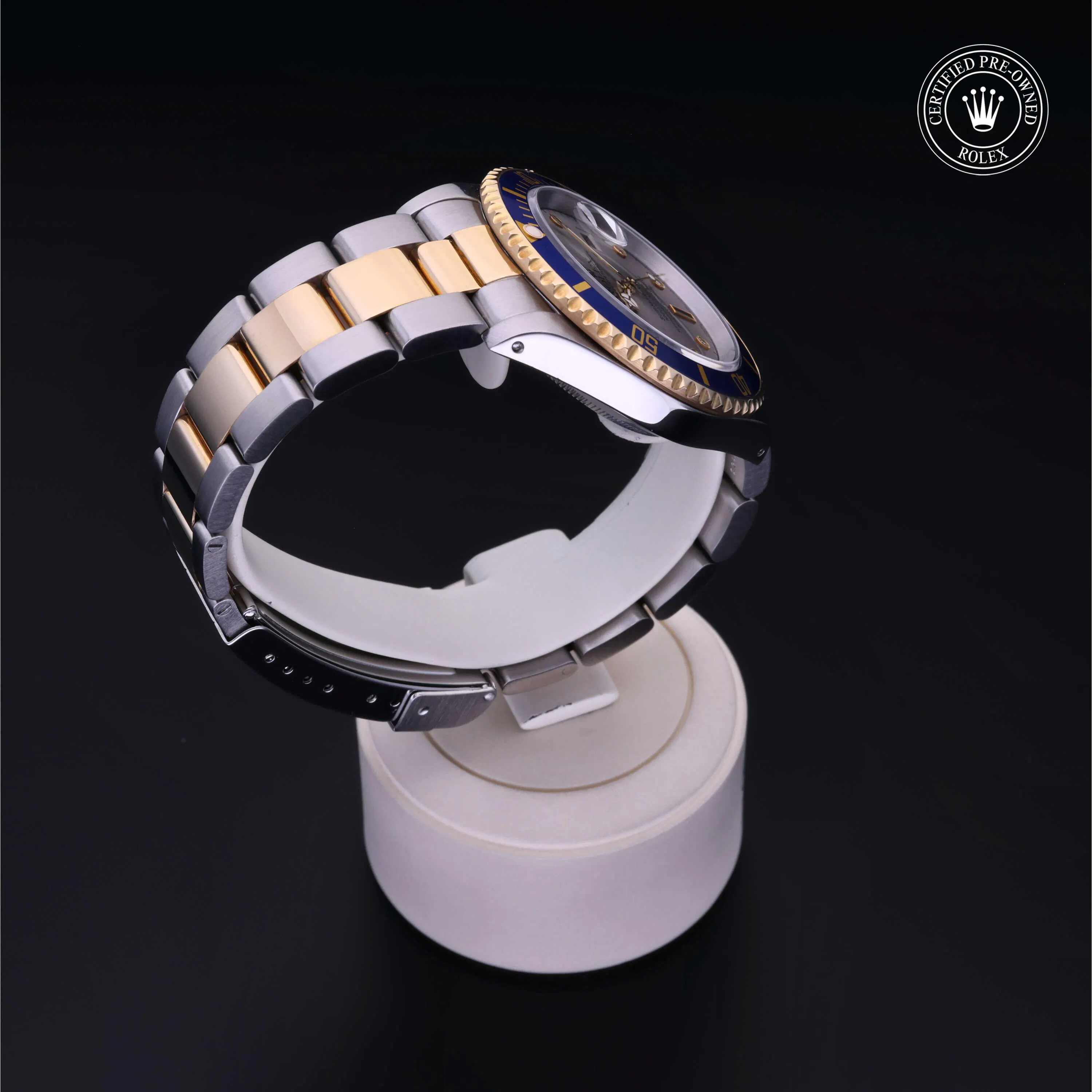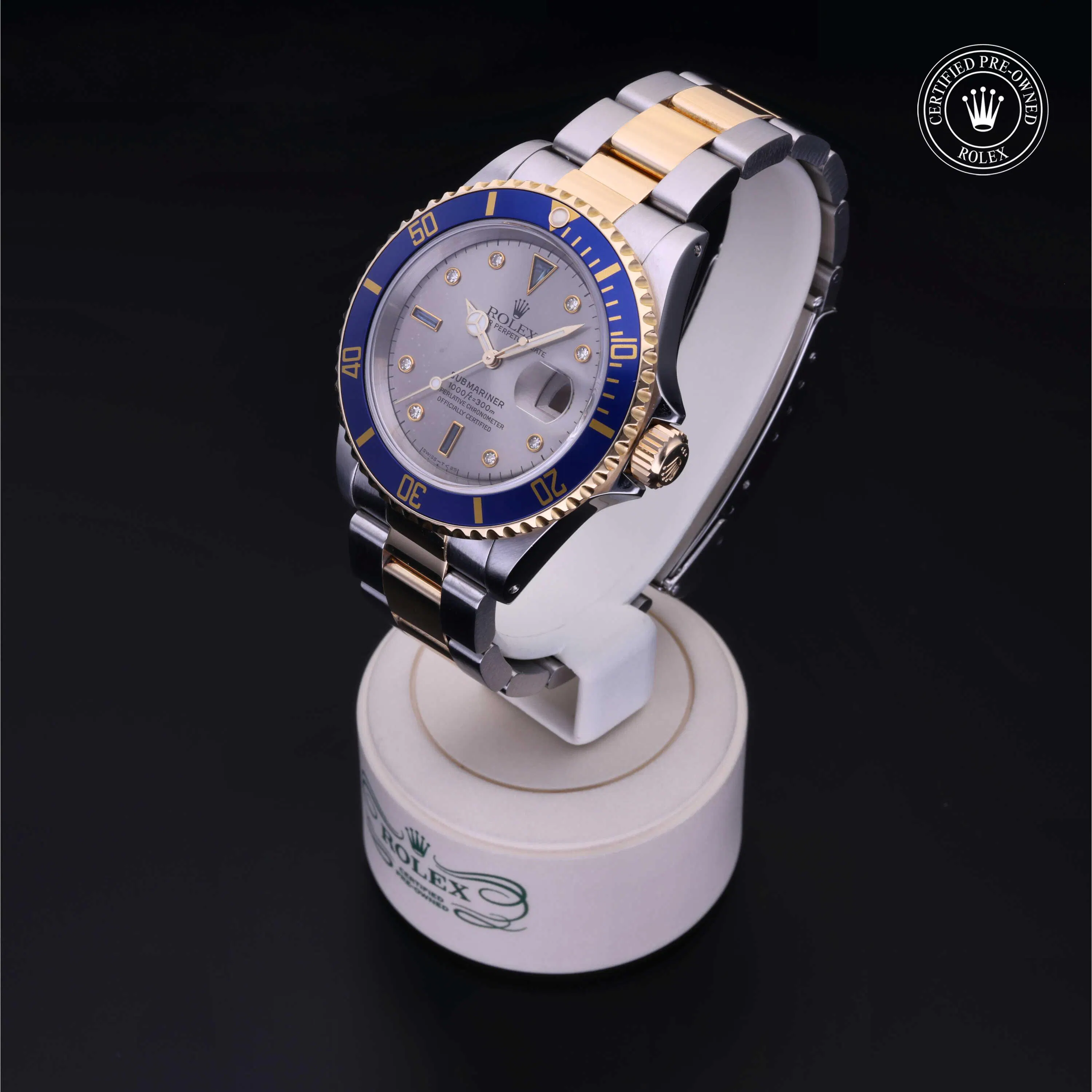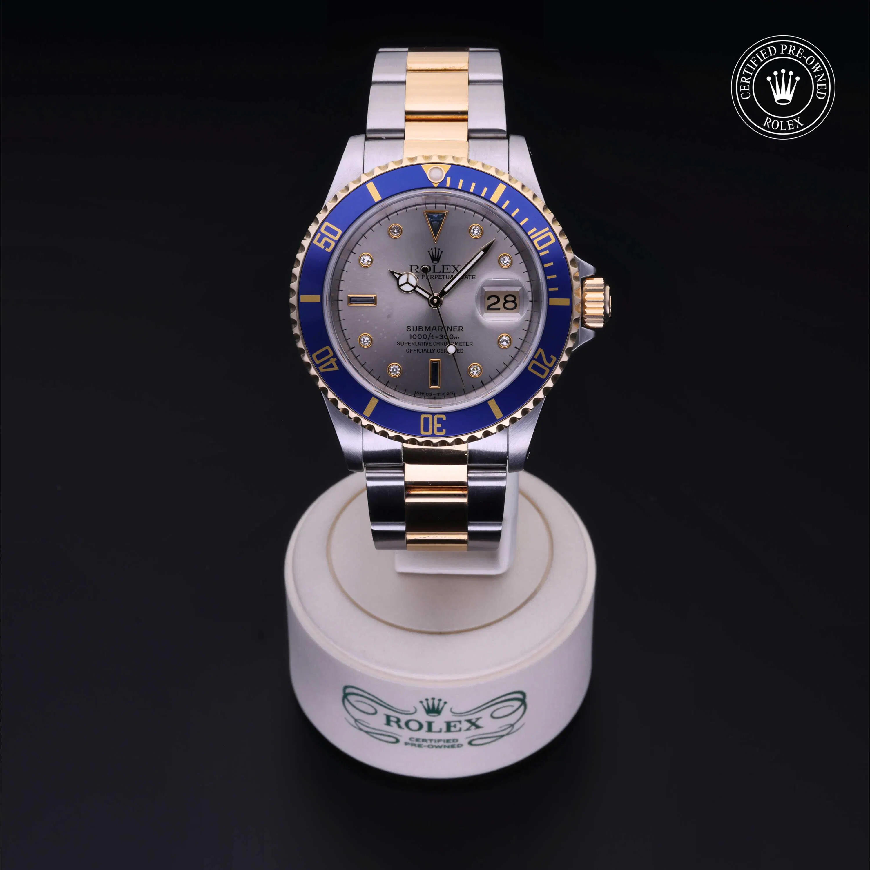 Rolex Certified Pre-Owned Submariner Date (16613) self - winding automatic watch, features a 40mm stainless steel case with an 18k yellow gold unidirectional rotating bezel fitted with a blue aluminium 60-minute scale insert. The dial is steel-grey color and is set with diamonds and blue sapphire stones. The watch is secured on a stainless steel and 18k yellow gold Oyster bracelet complete with a folding buckle. Functions include hours, minutes, seconds and date. This watch has been serviced by an authorized service center and certified by Rolex. It does not come with the original box or papers, but includes a custom Rolex Certified Pre-Owned hang tag, travel pouch and international warranty card.