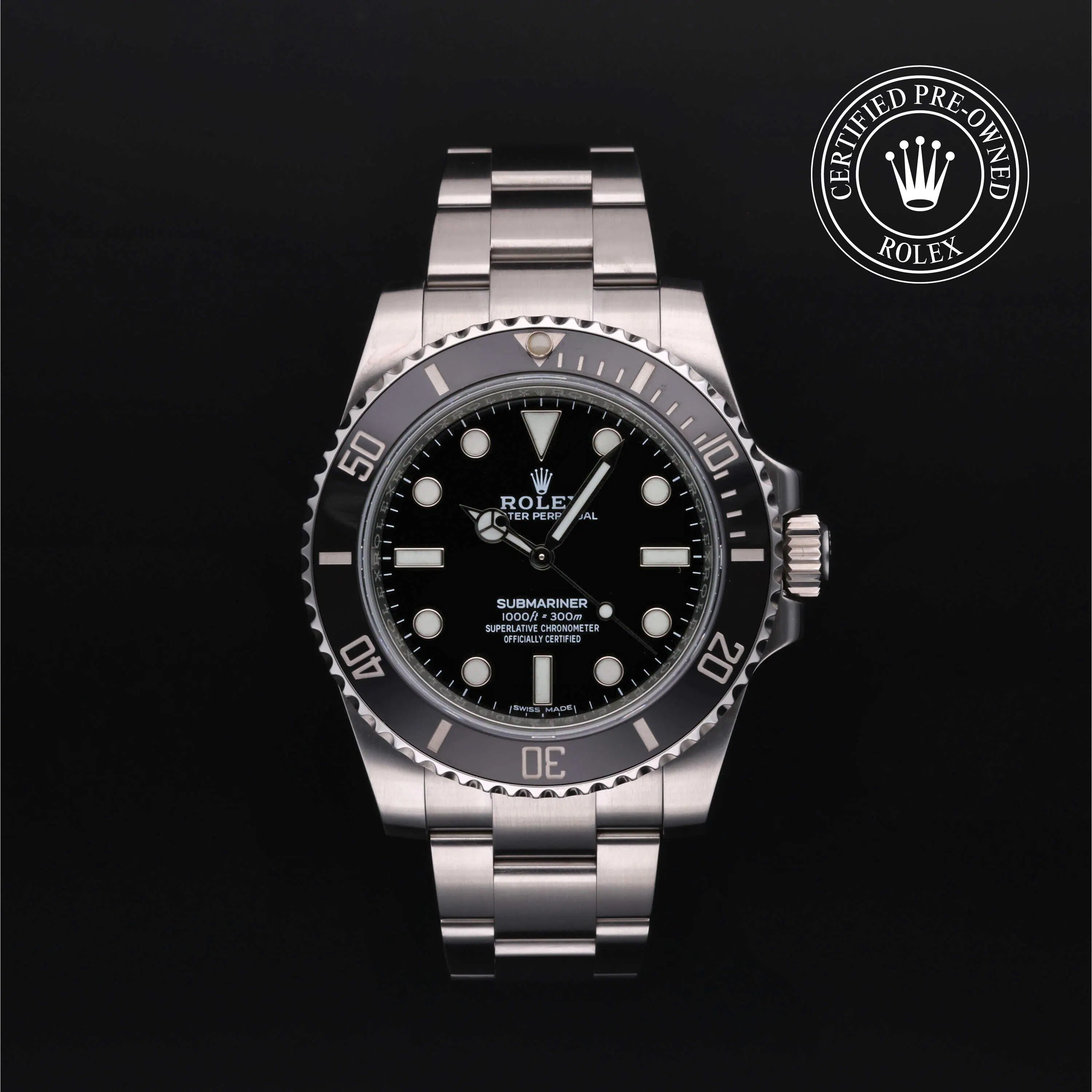 Rolex Certified Pre-Owned Submariner No Date (114060) self - winding automatic watch, features a 40mm stainless steel case and rotating bezel with a black cerachrom insert surrounding a black dial on a stainless steel oyster bracelet. Functions include hours, minutes and seconds. This watch has received Rolex-authorized service and certification. It comes with the original box and papers, and includes a custom Rolex Certified Pre-Owned hang tag, travel pouch and RCPO international warranty card.