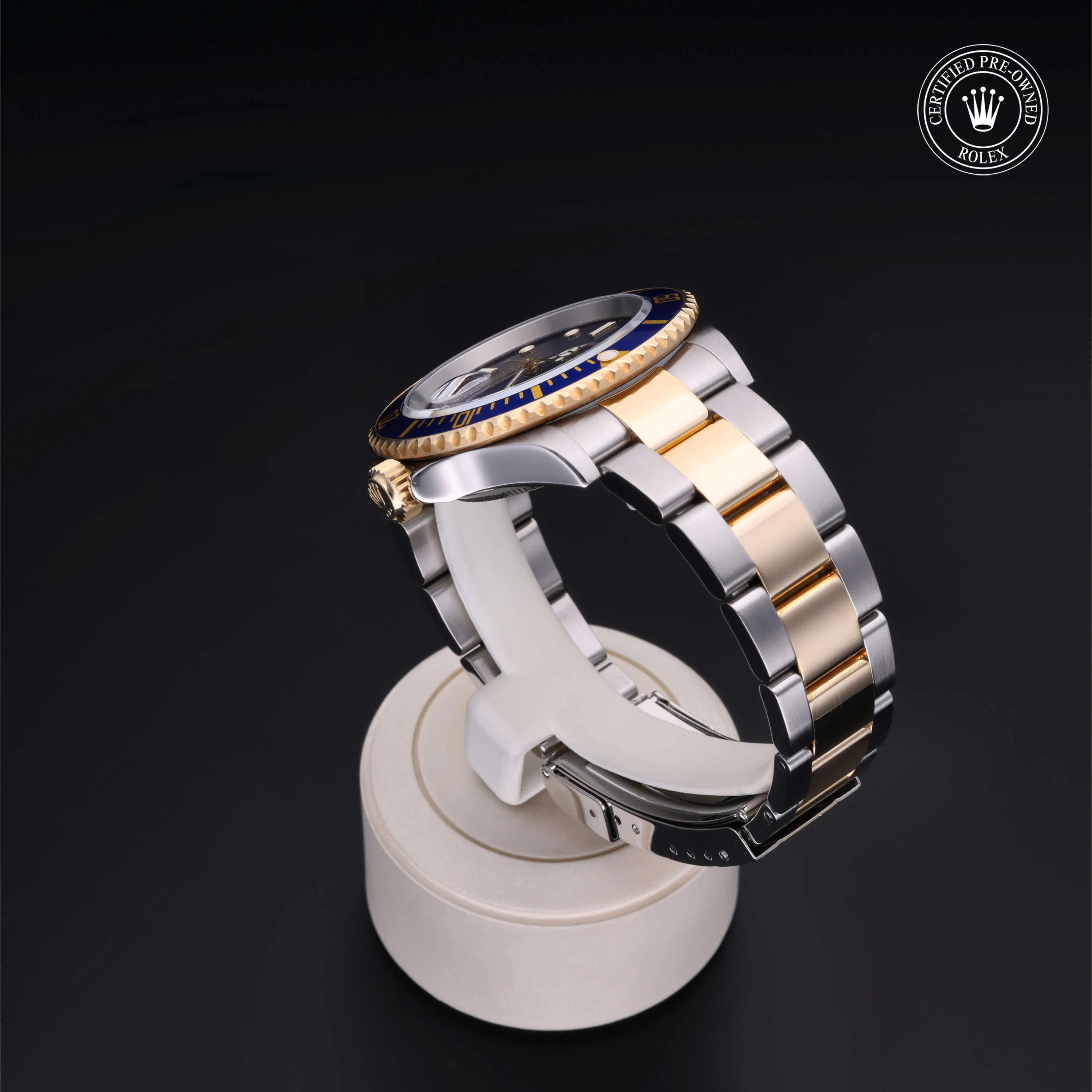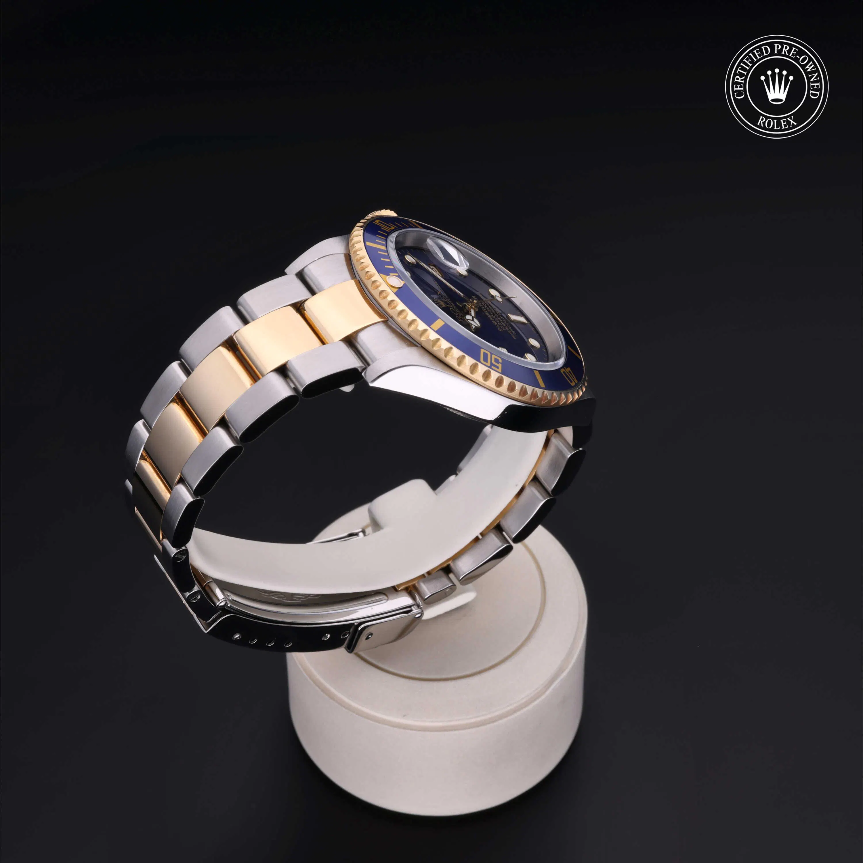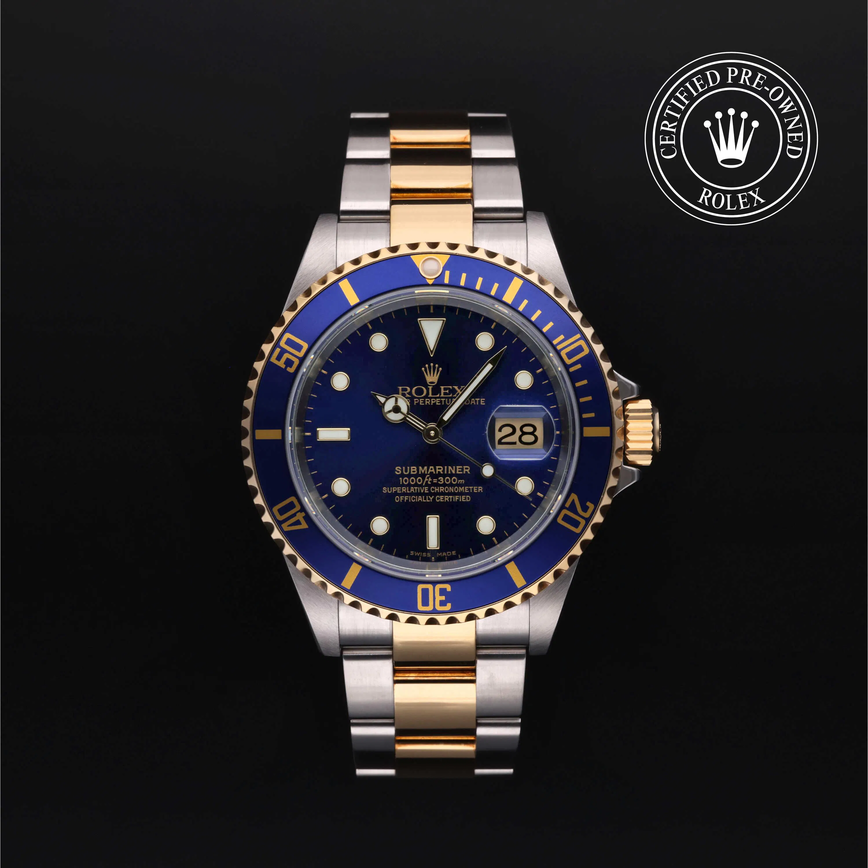 Rolex Certified Pre-Owned Submariner (16613) self - winding automatic watch, features a 40mm stainless steel case with an 18k yellow gold rotating bezel with a blue aluminum insert surrounding a blue dial on a stainless steel and 18k yellow gold oyster bracelet. Functions include hours, minutes, seconds and date. This watch has received Rolex-authorized service and certification. It comes with the original box, and includes a custom Rolex Certified Pre-Owned hang tag, travel pouch and RCPO international warranty card.