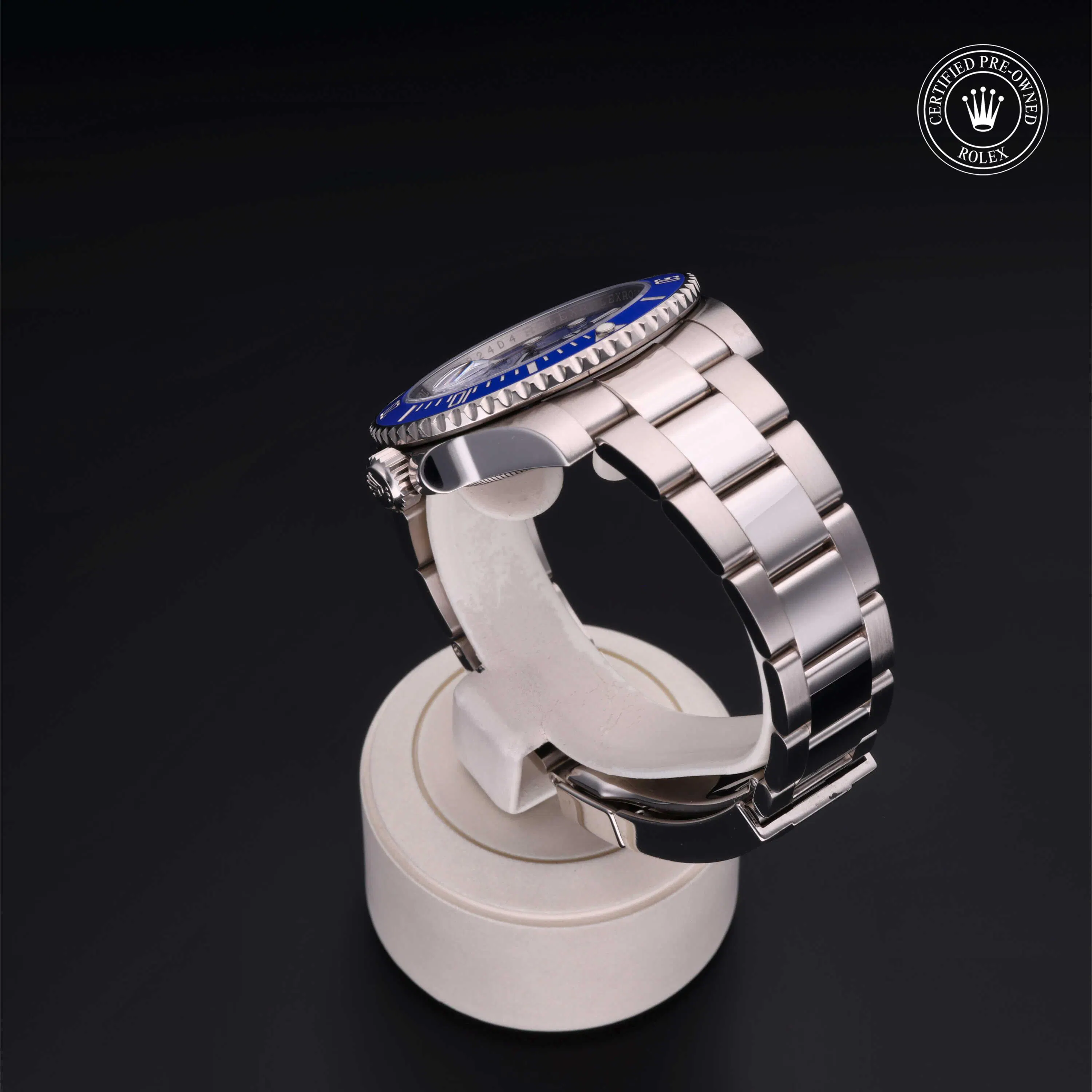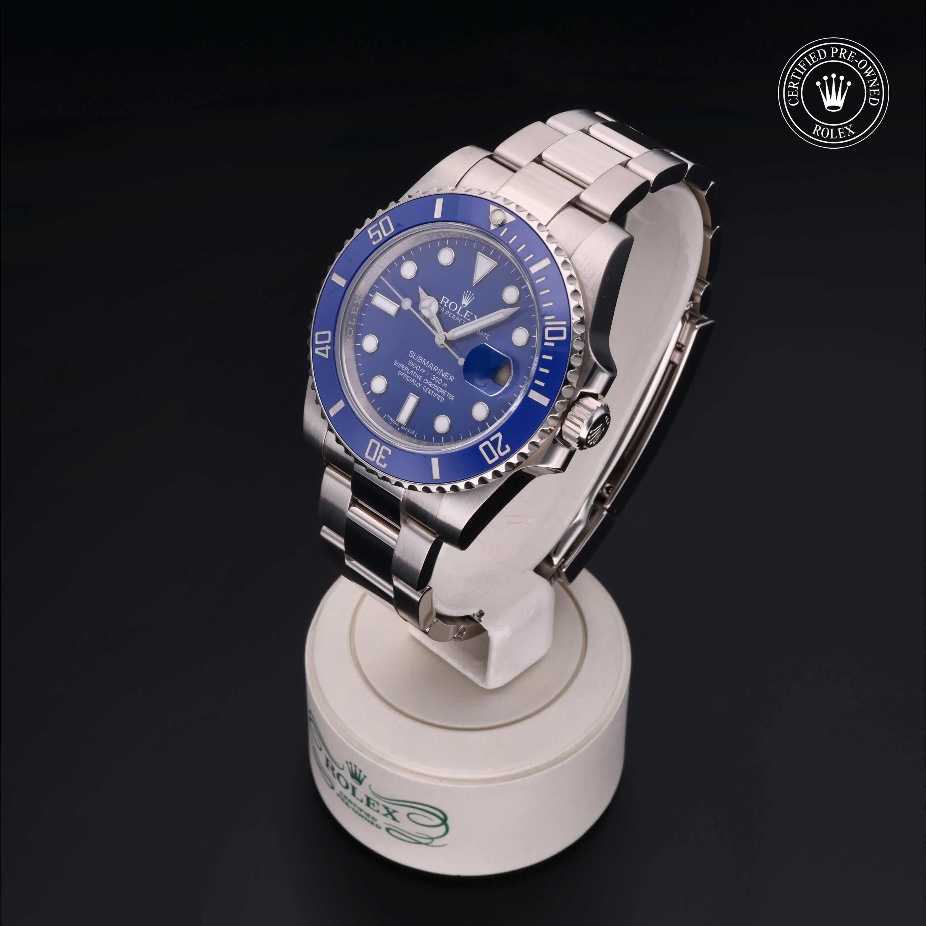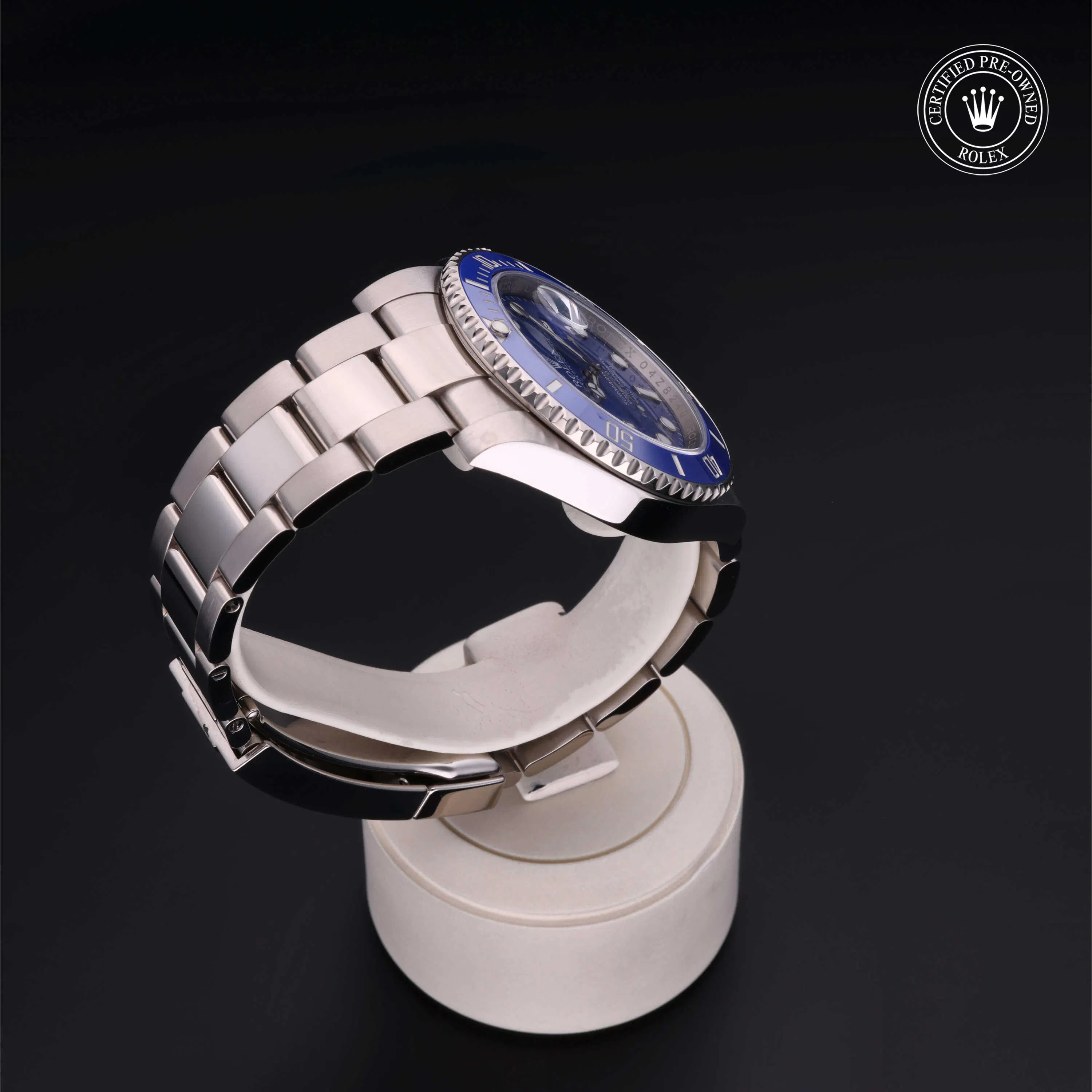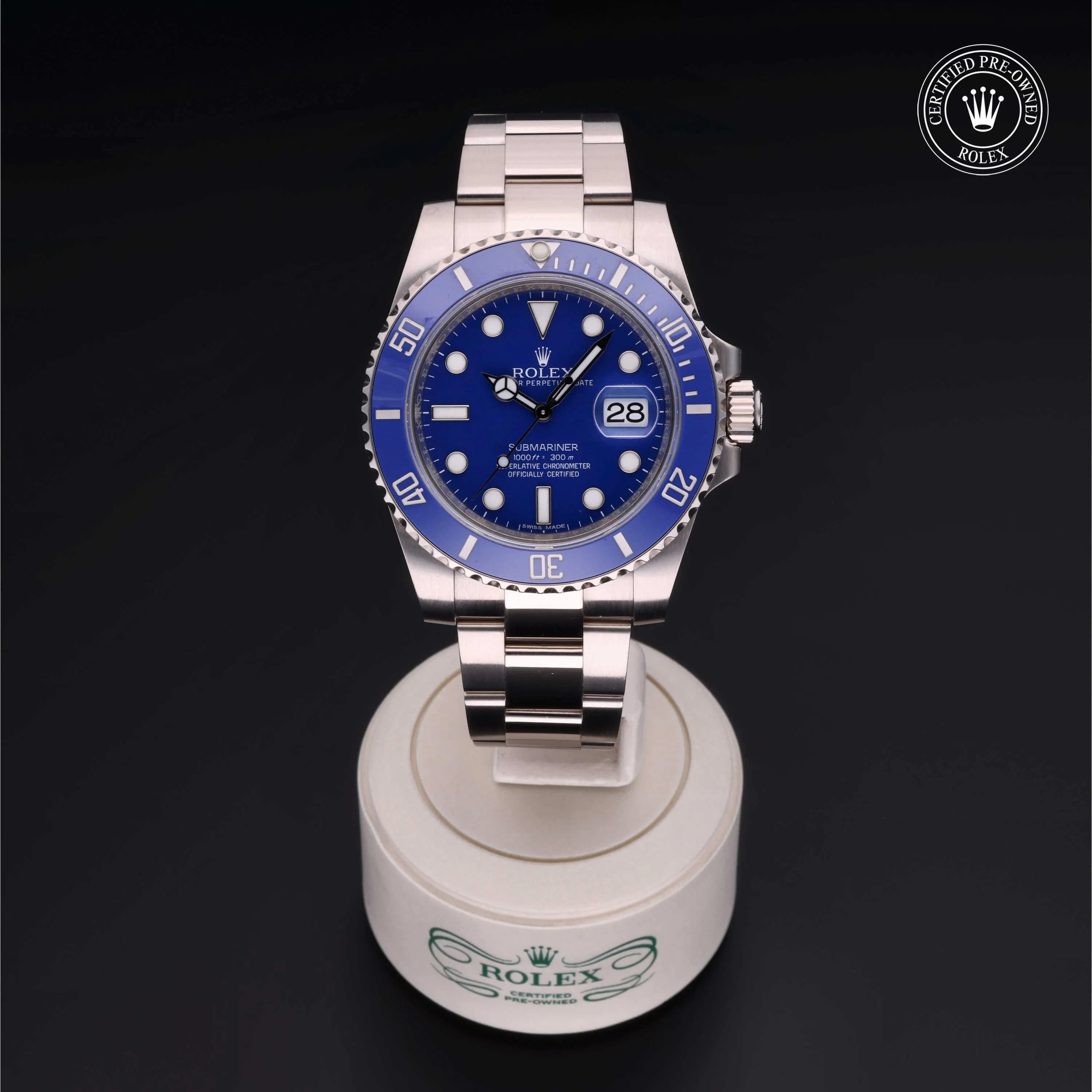 Rolex Certified Pre-Owned Submariner Date (116619LB) self - winding automatic watch, features a 40mm 18k white gold case with a unidirectional rotating bezel fitted with a blue cerachrom 60-minute scale bezel surrounding a blue dial. The watch is secured on an 18k white gold Oyster bracelet complete with a folding buckle. Functions include hours, minutes, seconds and date. This watch has been serviced by an authorized service center and certified by Rolex. It does not come with the original box or papers, but includes a custom Rolex Certified Pre-Owned hang tag, travel pouch and international warranty card.
