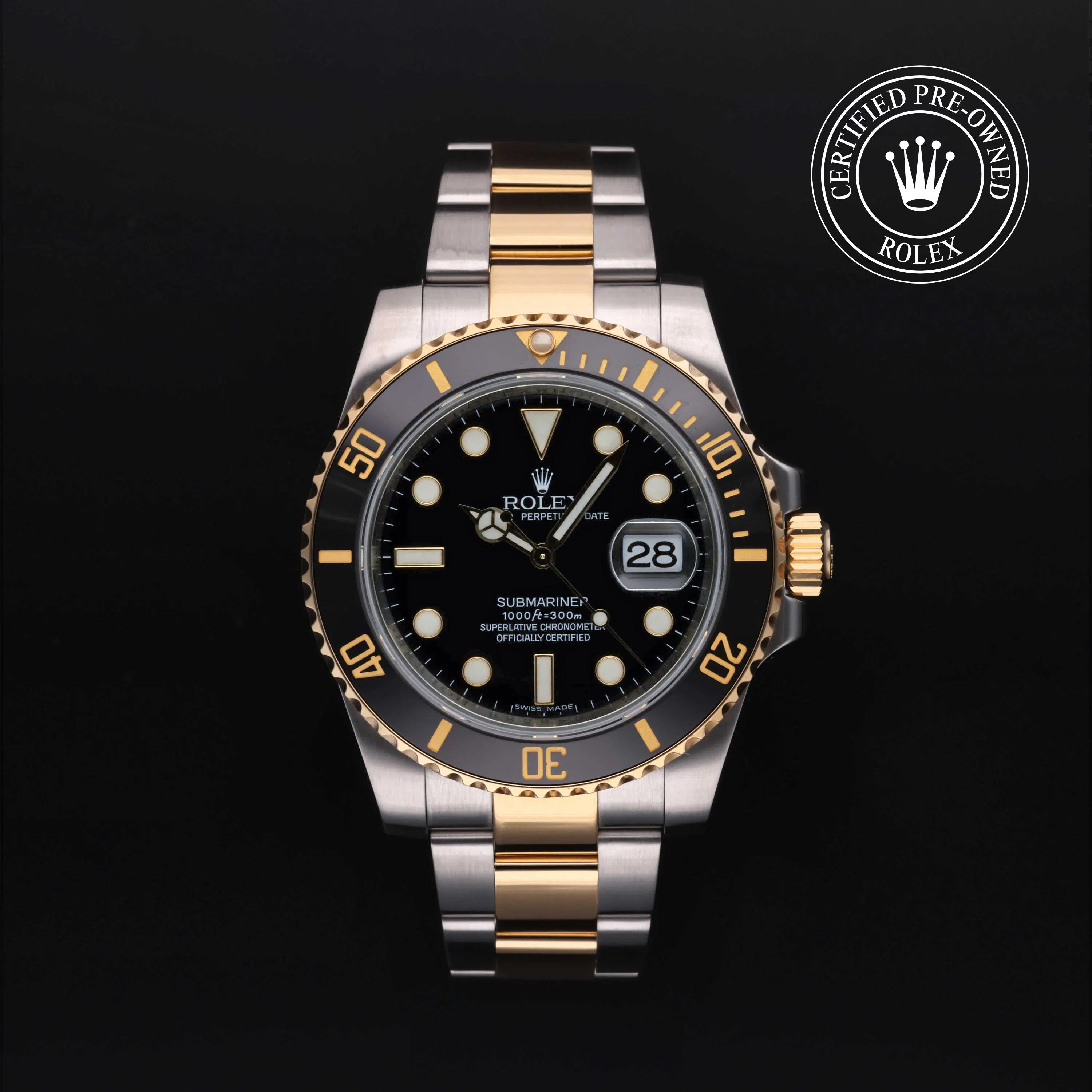 Rolex Certified Pre-Owned Submariner Date (116613LN) self - winding automatic watch, features a 40mm stainless steel case with an 18k yellow gold unidirectional rotating bezel with a black cerachrom insert surrounding a black dial on a stainless steel and 18k yellow gold oyster bracelet. Functions include hours, minutes, seconds and date. This watch has received Rolex-authorized service and certification. It comes with the original papers, and includes a custom Rolex Certified Pre-Owned hang tag, travel pouch and RCPO international warranty card.
