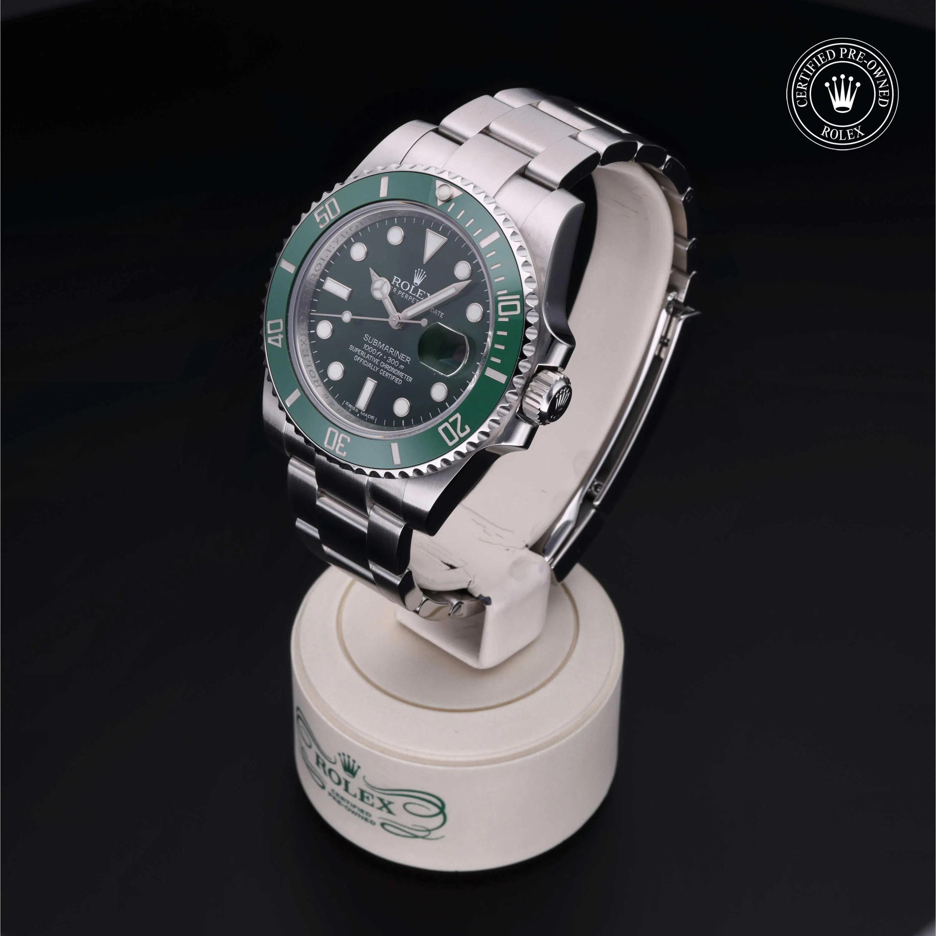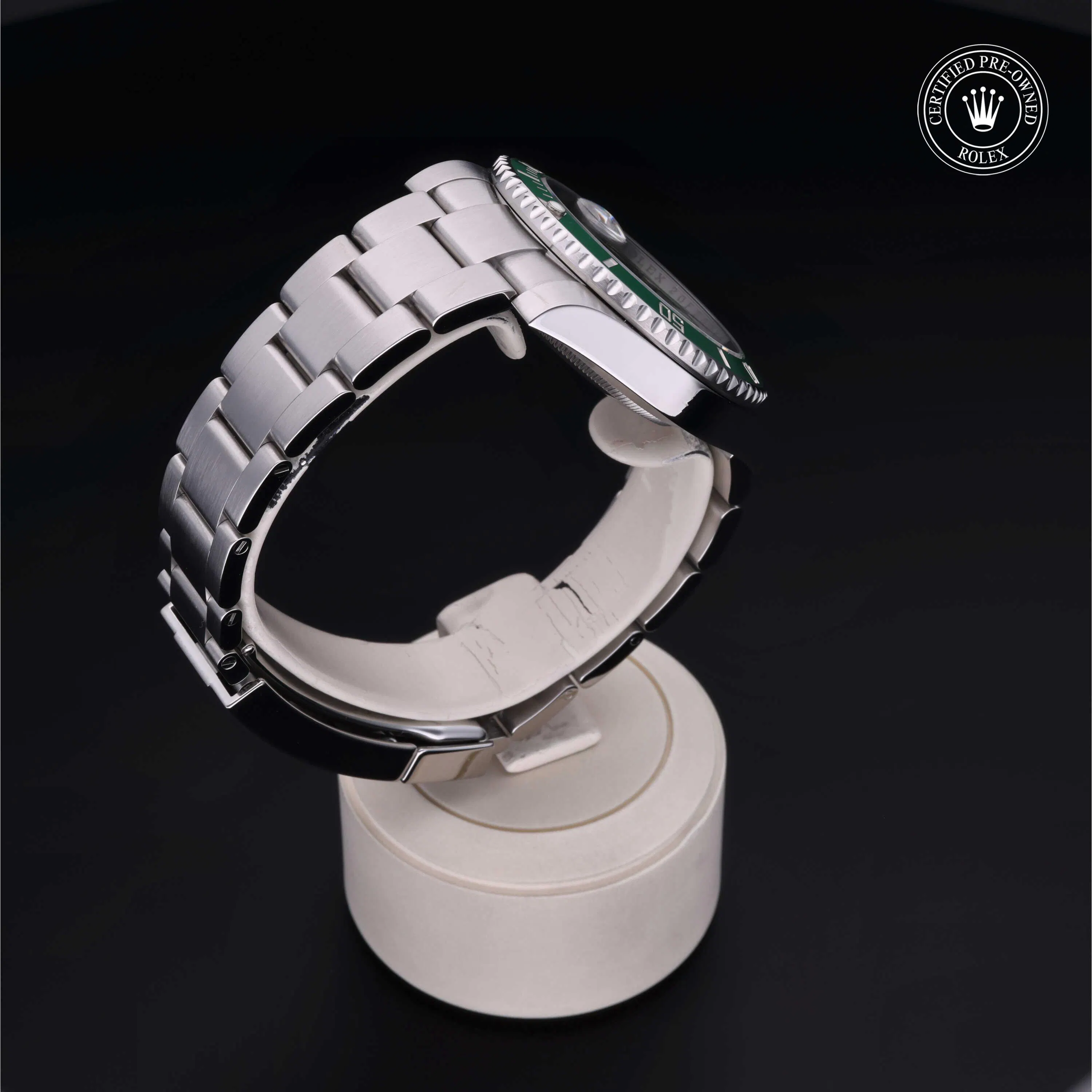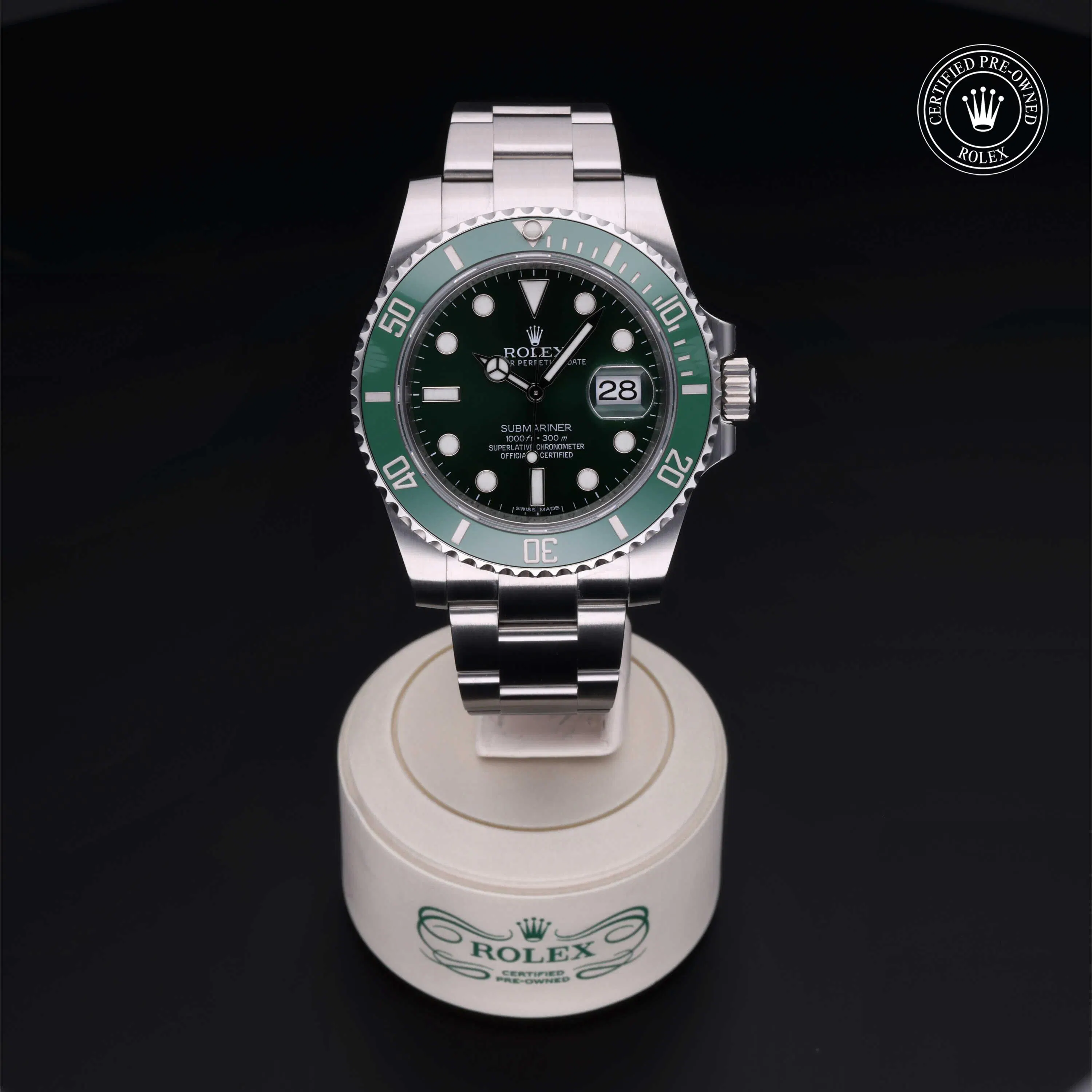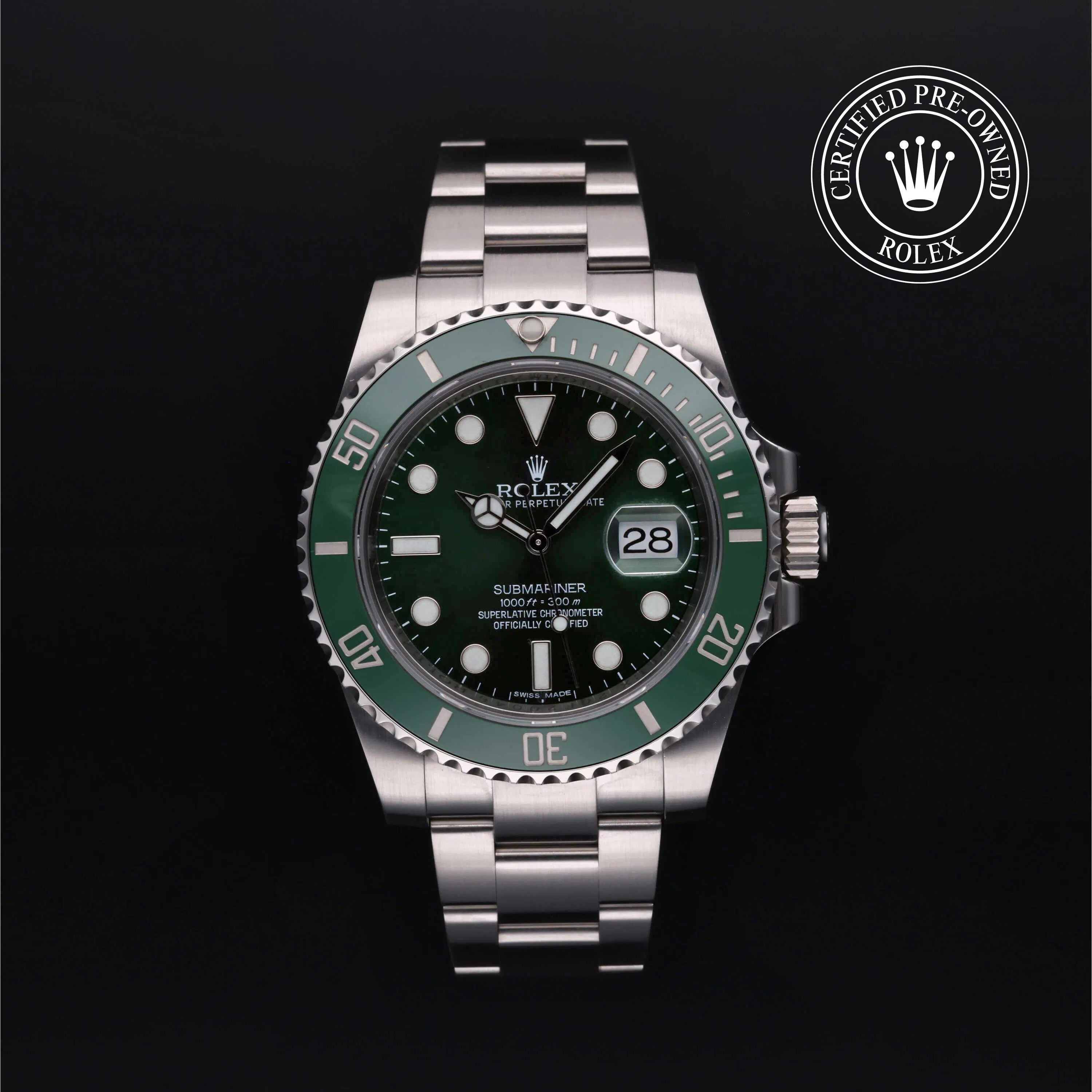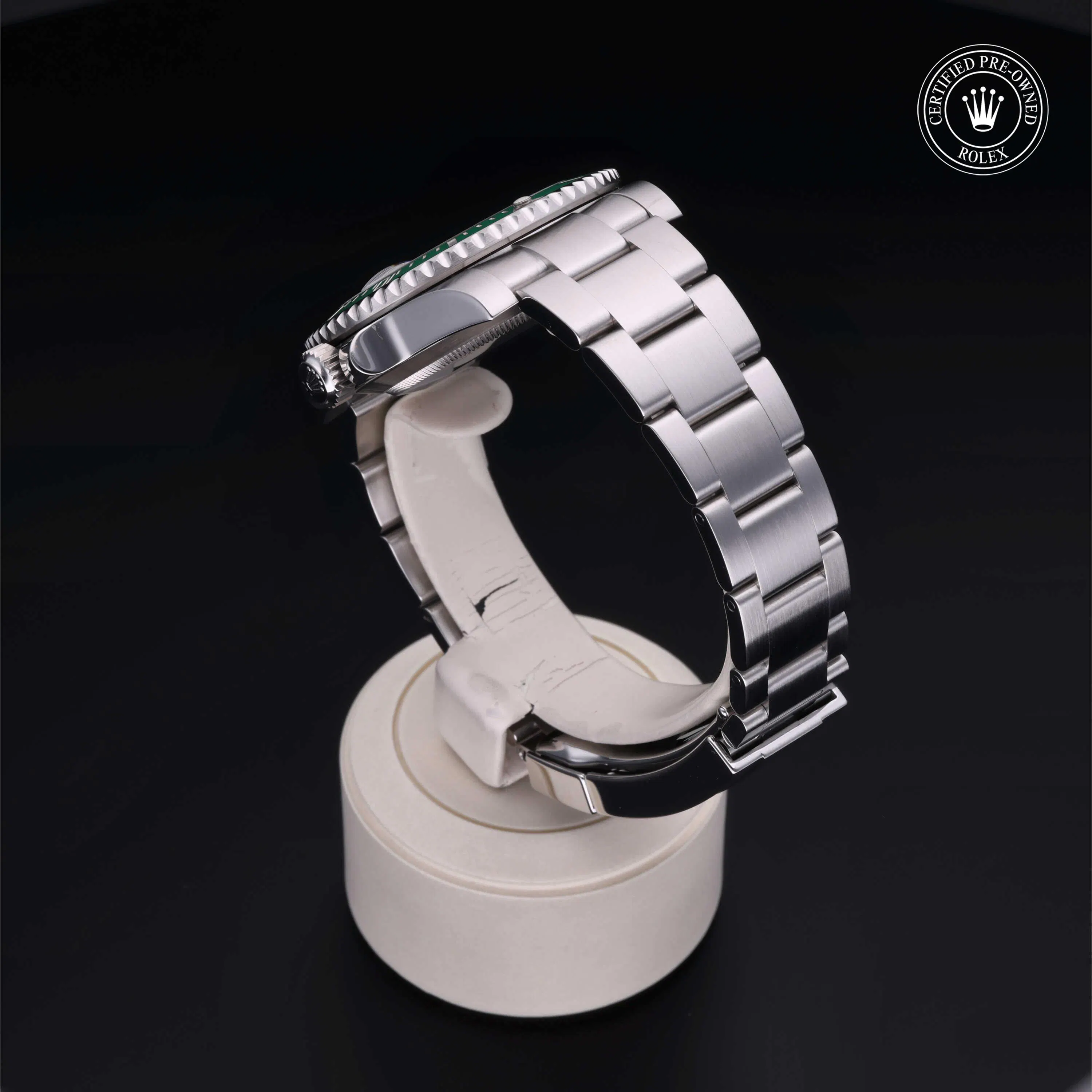 Rolex Certified Pre-Owned Submariner Date (116610LV) self - winding automatic watch, features a 40mm stainless steel case and rotating bezel with a green cerachrom insert surrounding a green dial on a stainless steel oyster bracelet. Functions include hours, minutes, seconds and date. This watch has received Rolex-authorized service and certification. It does not come with the original box or papers, but includes a custom Rolex Certified Pre-Owned hang tag, travel pouch and RCPO international warranty card.