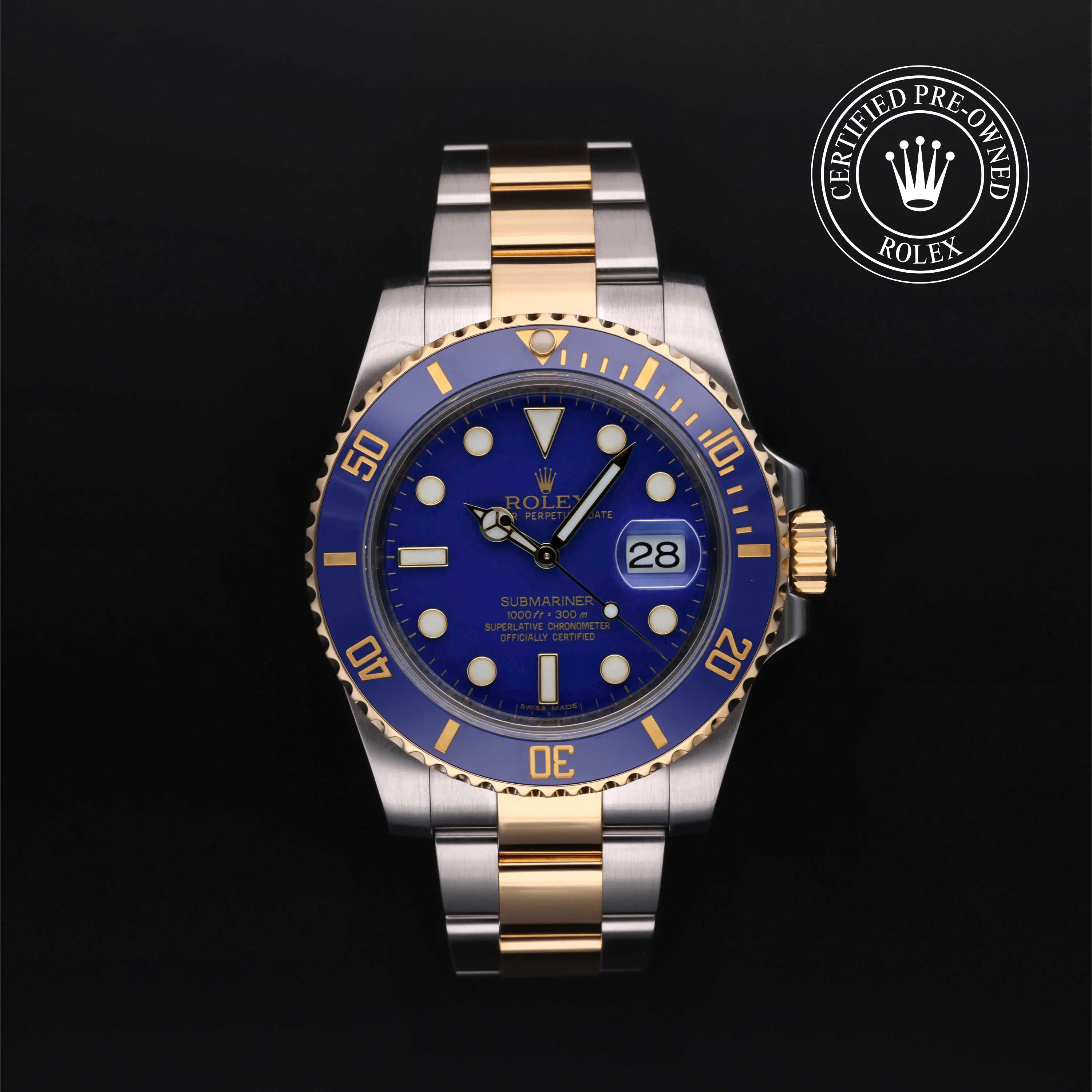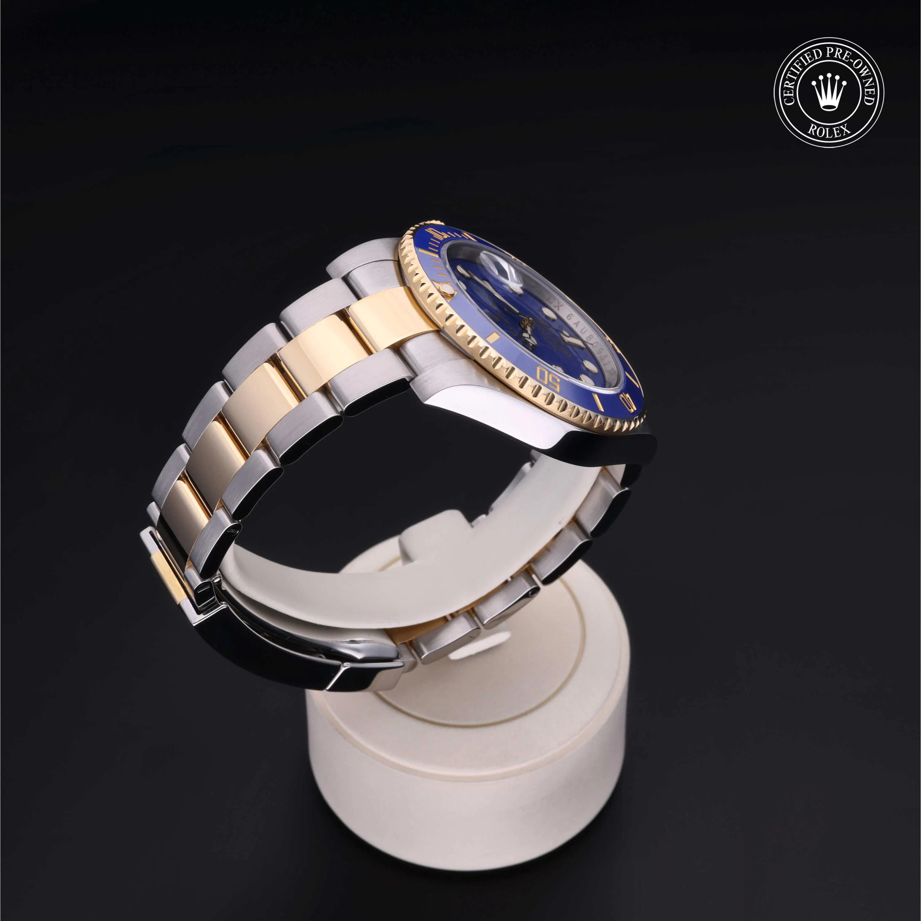 Rolex Certified Pre-Owned Submariner Date (116613LB) self - winding automatic watch, features a 40mm stainless steel case with an 18k yellow gold bidirectional rotating bezel fitted with a blue cerachrom 60-minute scale insert surrounding a blue dial. The watch is secured on a stainless steel and 18k yellow gold Oyster bracelet complete with a folding buckle. Functions include hours, minutes, seconds and date. This watch has received Rolex-authorized service and certification. It does not come with the original box or papers, but includes a custom Rolex Certified Pre-Owned hang tag, travel pouch and RCPO international warranty card.