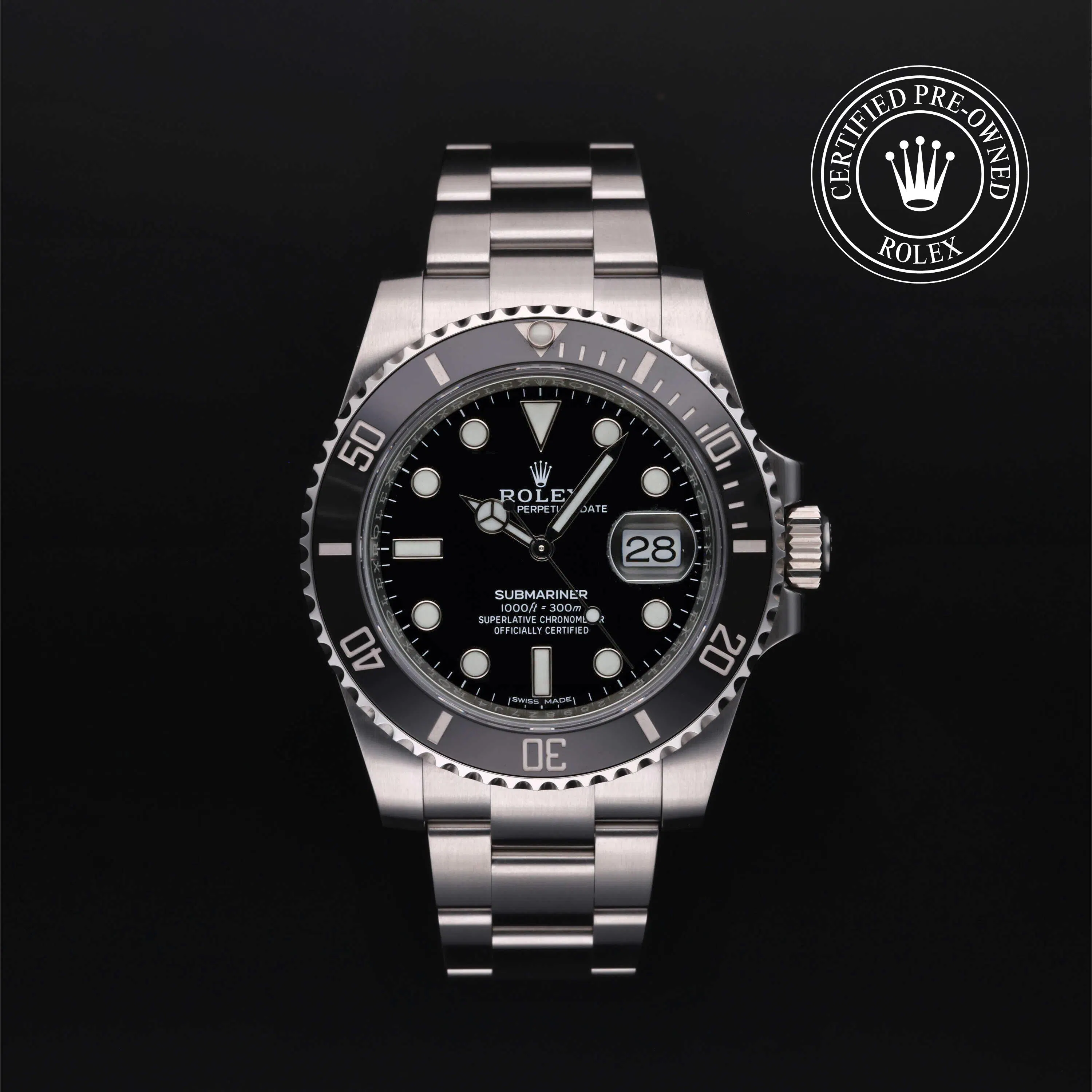 Rolex Certified Pre-Owned Submariner Date (116610LN) self - winding automatic watch, features a 40mm stainless steel case and rotating bezel with a black cerachrom insert surrounding a black dial on a stainless steel oyster bracelet. Functions include hours, minutes, seconds and date. This watch has received Rolex-authorized service and certification. It comes with the original box and papers, and includes a custom Rolex Certified Pre-Owned hang tag, travel pouch and RCPO international warranty card.