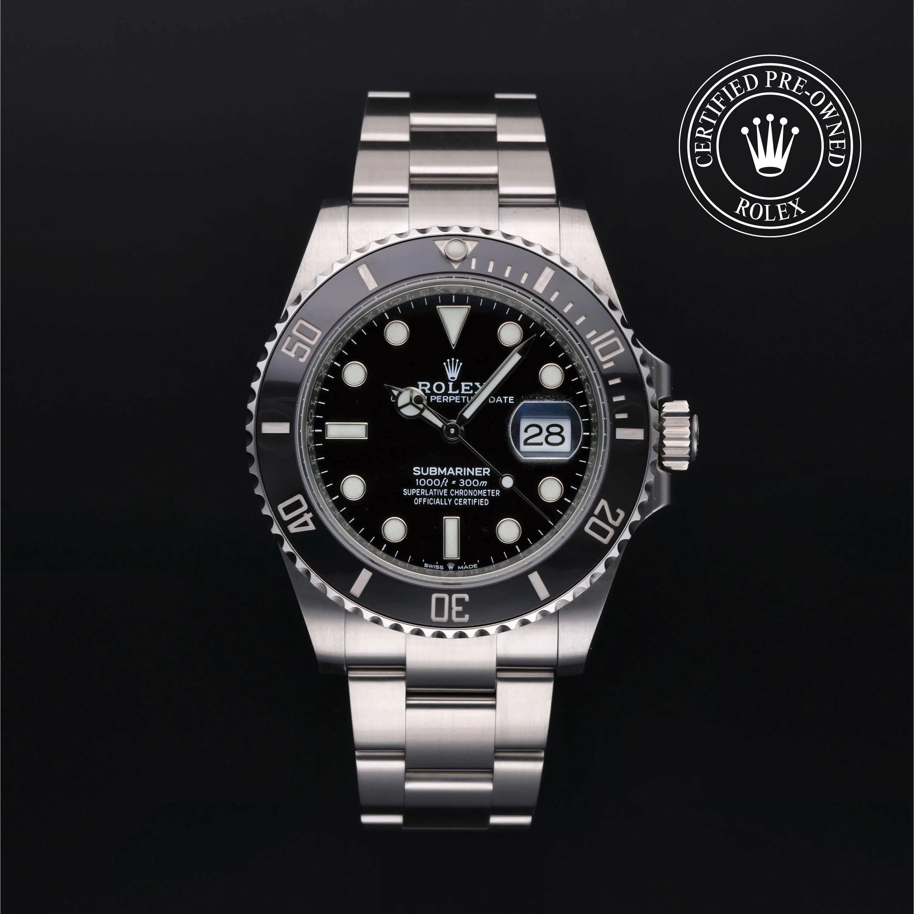 Rolex Certified Pre-Owned Submariner Date (126610LN) self - winding automatic watch, features a 41mm stainless steel case and unidirectional rotating bezel with a black cerachrom insert surrounding a black dial on a stainless steel oyster bracelet. Functions include hours, minutes, seconds and date. This watch has received Rolex-authorized service and certification. It comes with the original box and papers, and includes a custom Rolex Certified Pre-Owned hang tag, travel pouch and RCPO international warranty card.