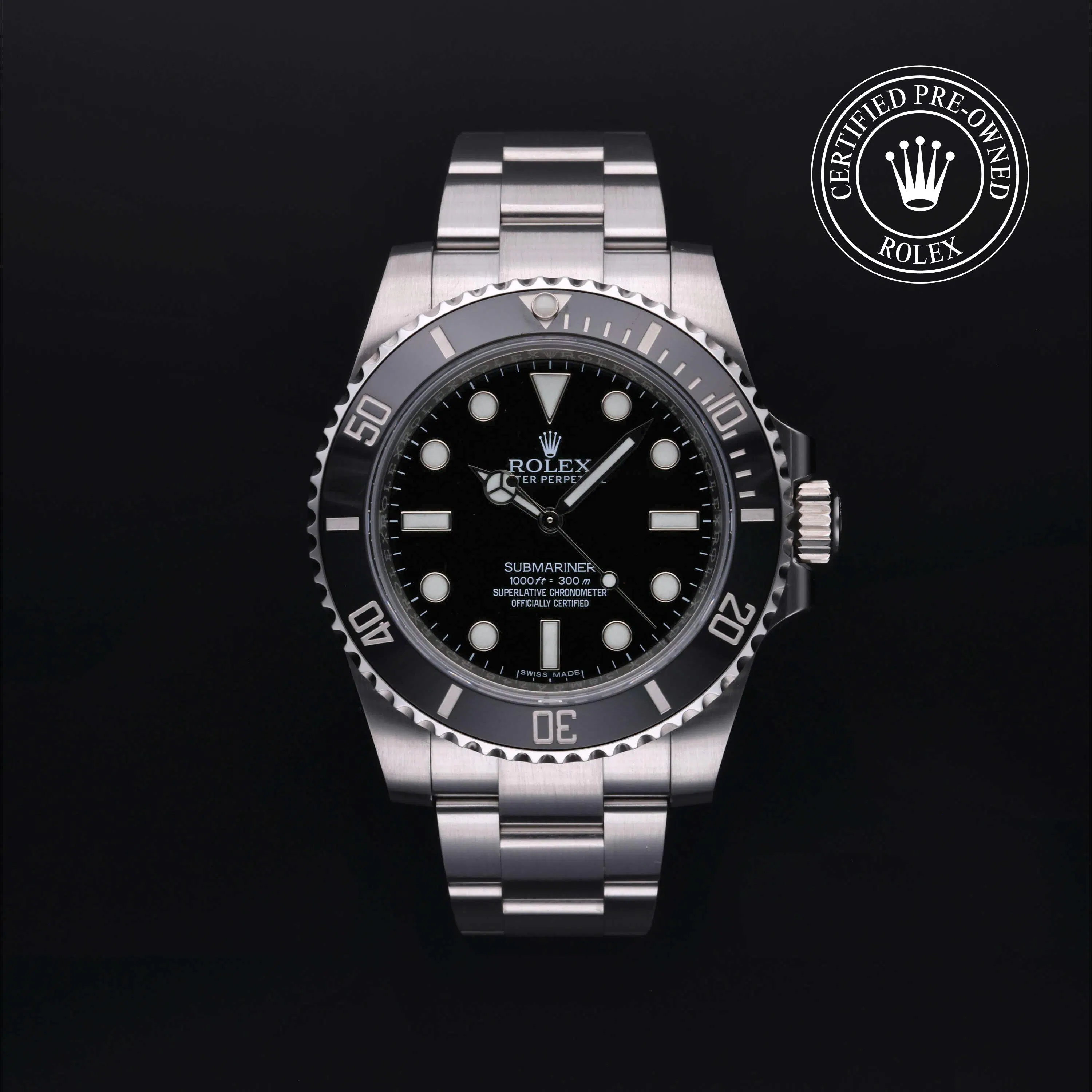 Rolex Certified Pre-Owned Submariner No Date (114060) self - winding automatic watch, features a 40mm stainless steel case and unidirectional rotating bezel with a black cerachrom insert surrounding a black dial. This watch is secured on a stainless steel Oyster bracelet. Functions include hours, minutes and seconds. This watch has received Rolex-authorized service and certification. It comes with the original box and papers, and includes a custom Rolex Certified Pre-Owned hang tag, travel pouch and RCPO international warranty card.