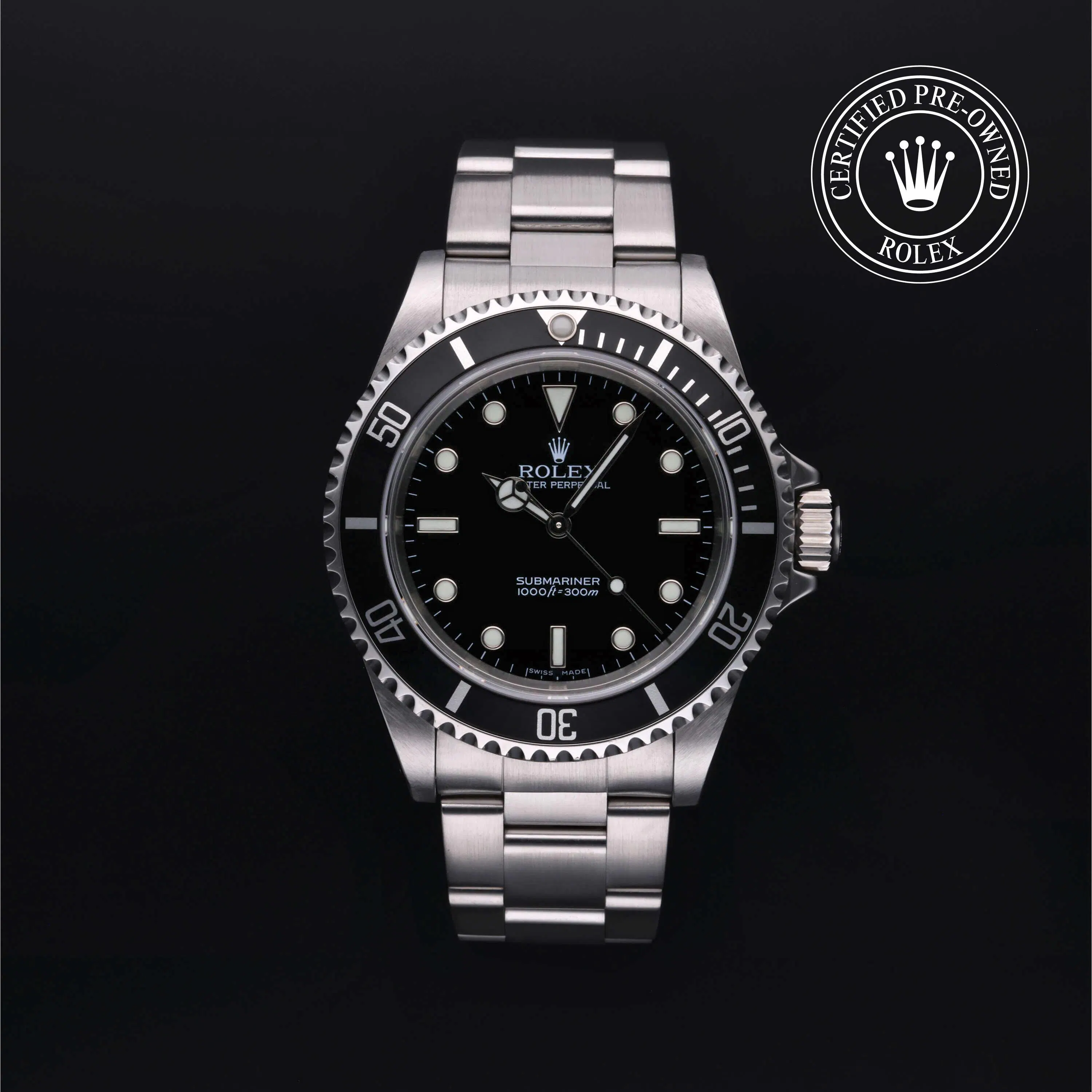 Rolex Certified Pre-Owned Submariner (14060M) self - winding automatic watch, features a 40mm stainless steel case and rotating bezel with a black aluminum insert surrounding a black dial on a stainless steel Oyster bracelet. Functions include hours, minutes and seconds. This watch has received Rolex-authorized service and certification. It comes with the original box and papers, and includes a custom Rolex Certified Pre-Owned hang tag, travel pouch and RCPO international warranty card.