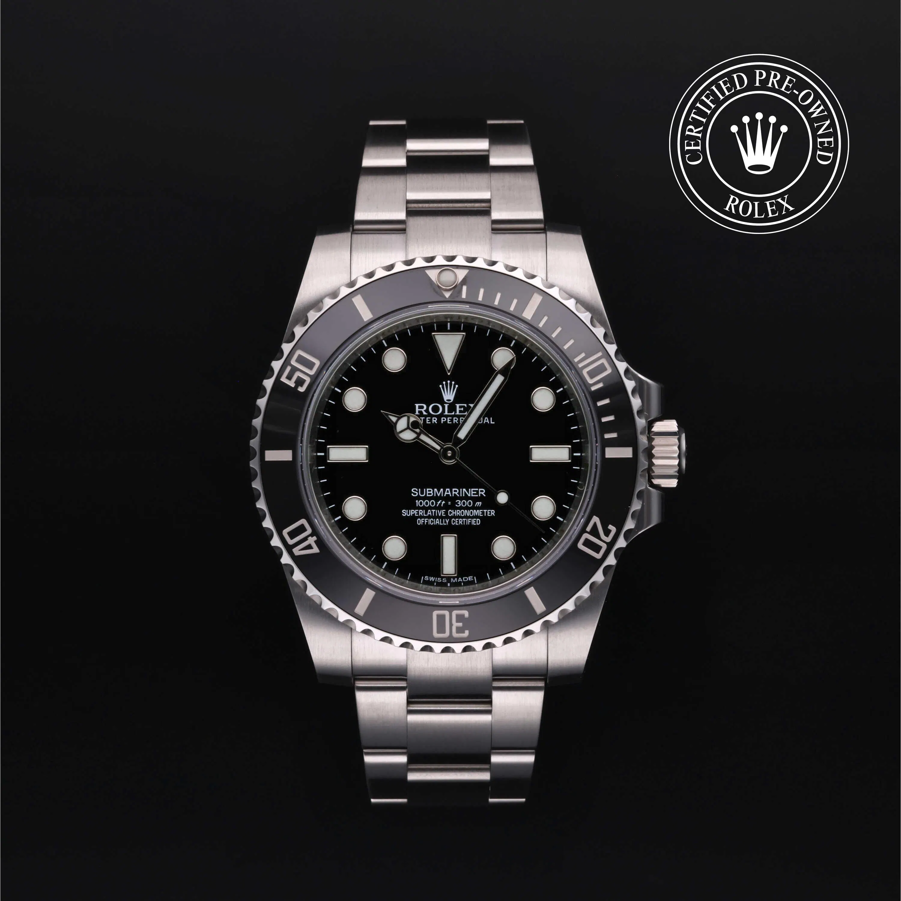 Rolex Certified Pre-Owned Submariner No Date (114060) self - winding automatic watch, features a 40mm stainless steel case and unidirectional rotating bezel with a black cerachrom inert surrounding a black dial. This watch is secured on a stainless steel Oyster bracelet. Functions include hours, minutes and seconds. This watch has received Rolex-authorized service and certification. It comes with the original box and papers, and includes a custom Rolex Certified Pre-Owned hang tag, travel pouch and RCPO international warranty card.