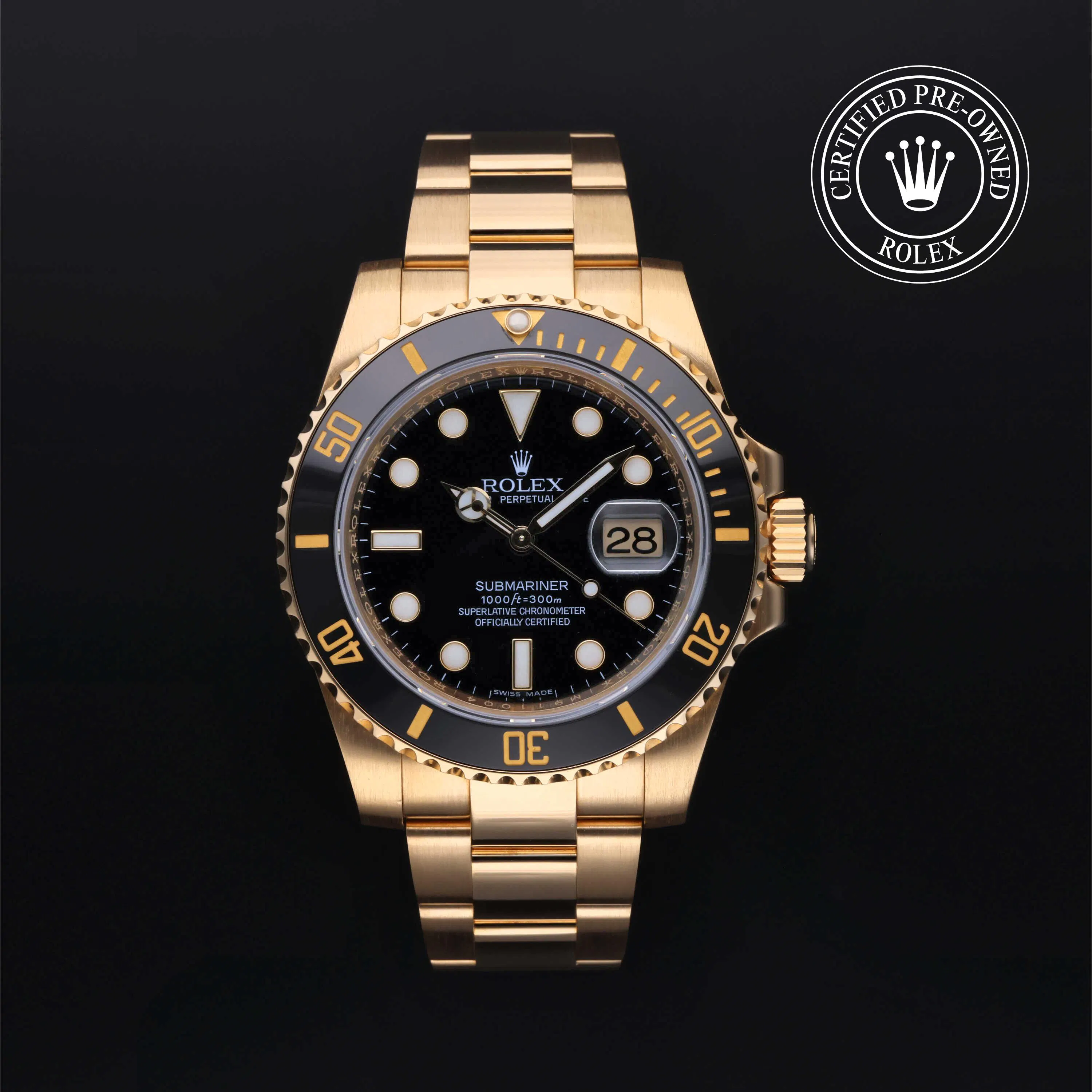 Rolex Certified Pre-Owned Submariner Date (116618LN) self - winding automatic watch, features a 40mm 18k yellow gold case and rotating bezel with a black cerachrom insert surrounding a black dial on an 18k yellow gold Oyster bracelet. Functions include hours, minutes, seconds and date. This watch has received Rolex-authorized service and certification. It comes with the original box and papers, and includes a custom Rolex Certified Pre-Owned hang tag, travel pouch and RCPO international warranty card.