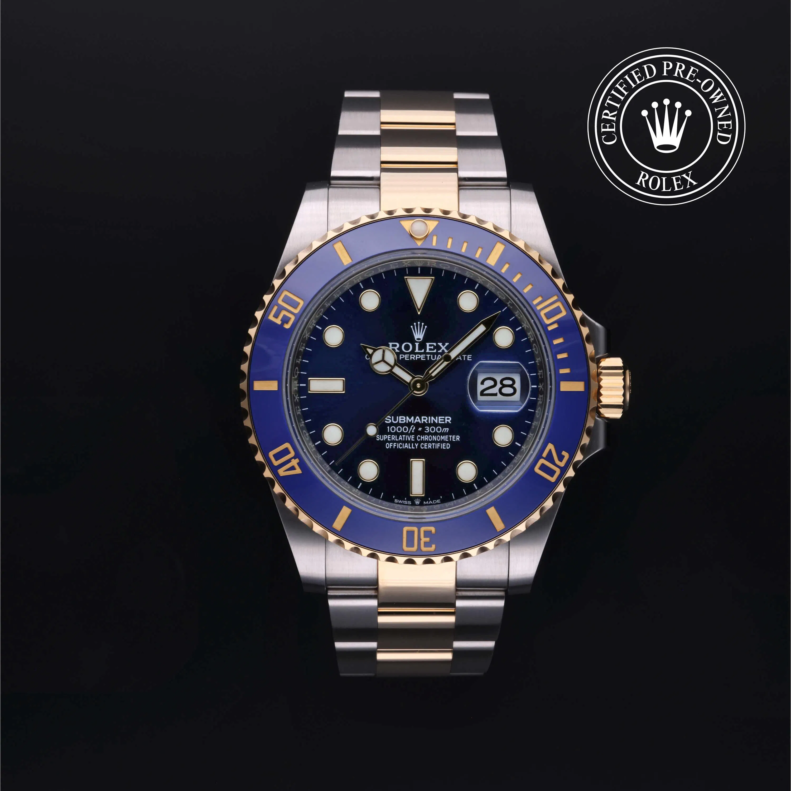 Rolex Certified Pre-Owned Submariner (126613LB) self - winding automatic watch, features a 41mm stainless steel case with an 18k yellow gold unidirectional bezel with a blue cerachrom insert surrounding a blue dial on a stainless steel and 18k yellow gold Oyster bracelet. Functions include hours, minutes, seconds and date. This watch has received Rolex-authorized service and certification. It comes with the original papers, and includes a custom Rolex Certified Pre-Owned hang tag, travel pouch and RCPO international warranty card.