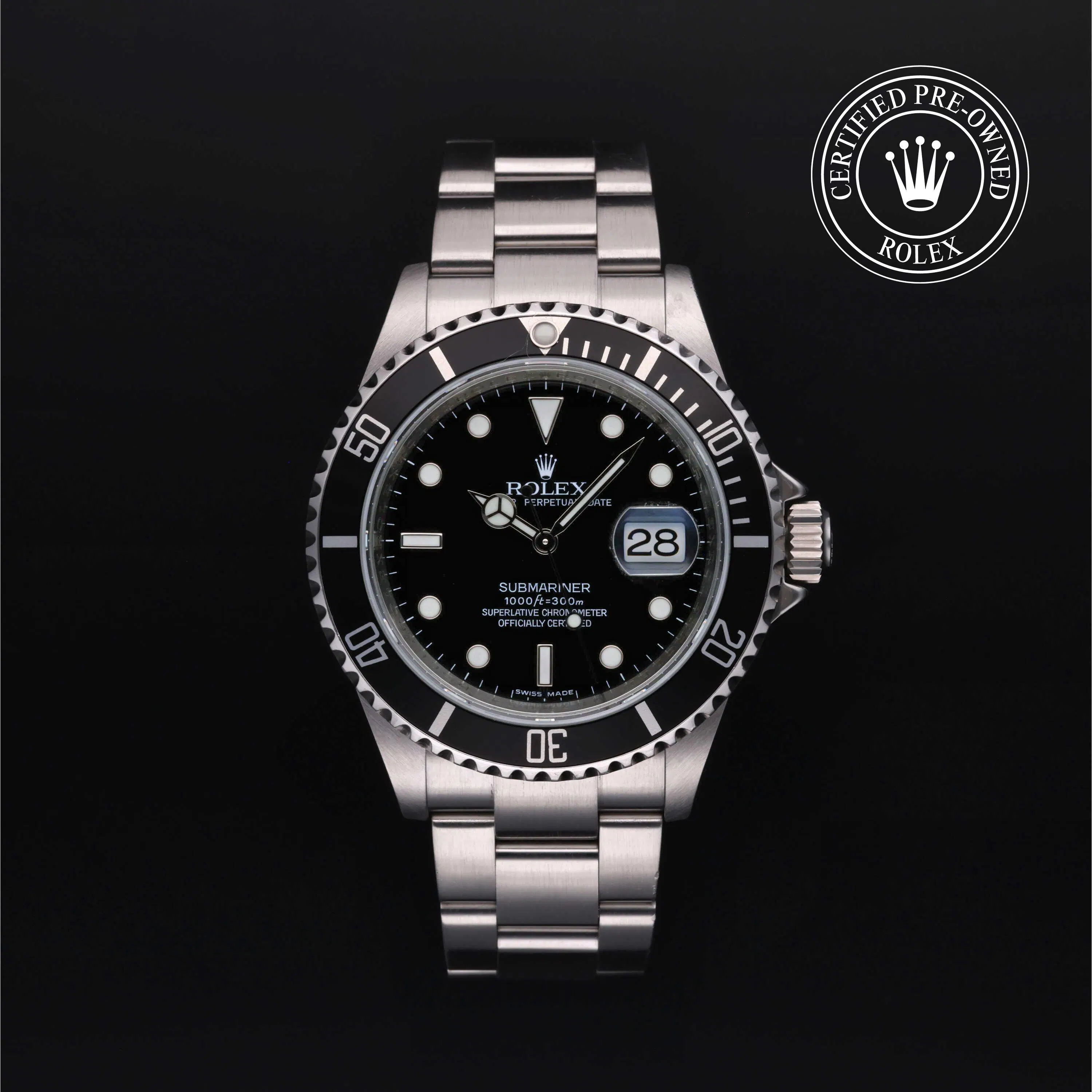 Rolex Certified Pre-Owned Submariner Date (16610) self - winding automatic watch, features a 40mm stainless steel case and unidirectional rotating bezel with a black aluminum insert surrounding a black dial. This watch is secured on stainless steel Oyster bracelet. Functions include hours, minutes, seconds and date. This watch has received Rolex-authorized service and certification. It does not come with the original box or papers, but includes a custom Rolex Certified Pre-Owned hang tag, travel pouch and RCPO international warranty card.