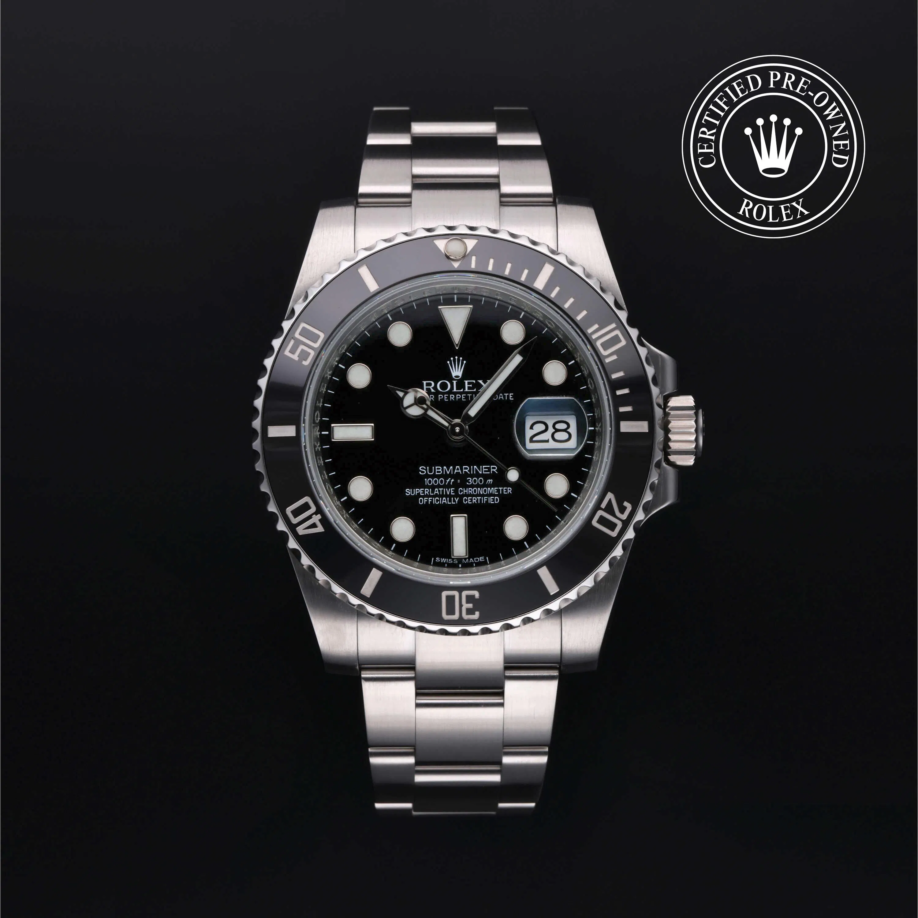 Rolex Certified Pre-Owned Submariner Date (116610LN) self - winding automatic watch, features a 40mm stainless steel case and unidirectional rotating bezel fitted with a black cerachrom 60-minute scale insert surrounding a black dial. The watch is secured on a stainless steel Oyster bracelet complete with a folding buckle. Functions include hours, minutes, seconds and date. This watch has been serviced by an authorized service center and certified by Rolex. It does not come with the original box or papers, but includes a custom Rolex Certified Pre-Owned hang tag, travel pouch and international warranty card.