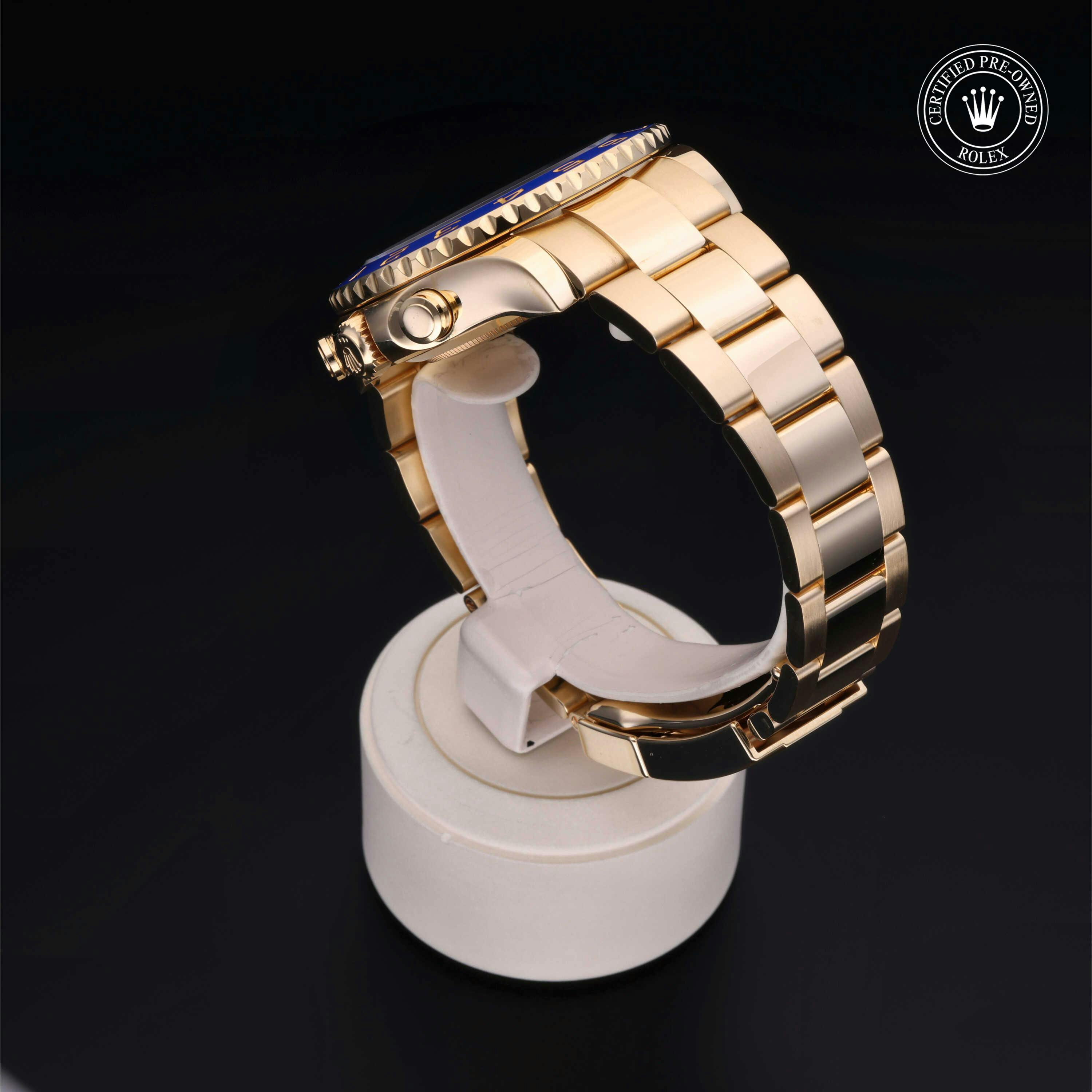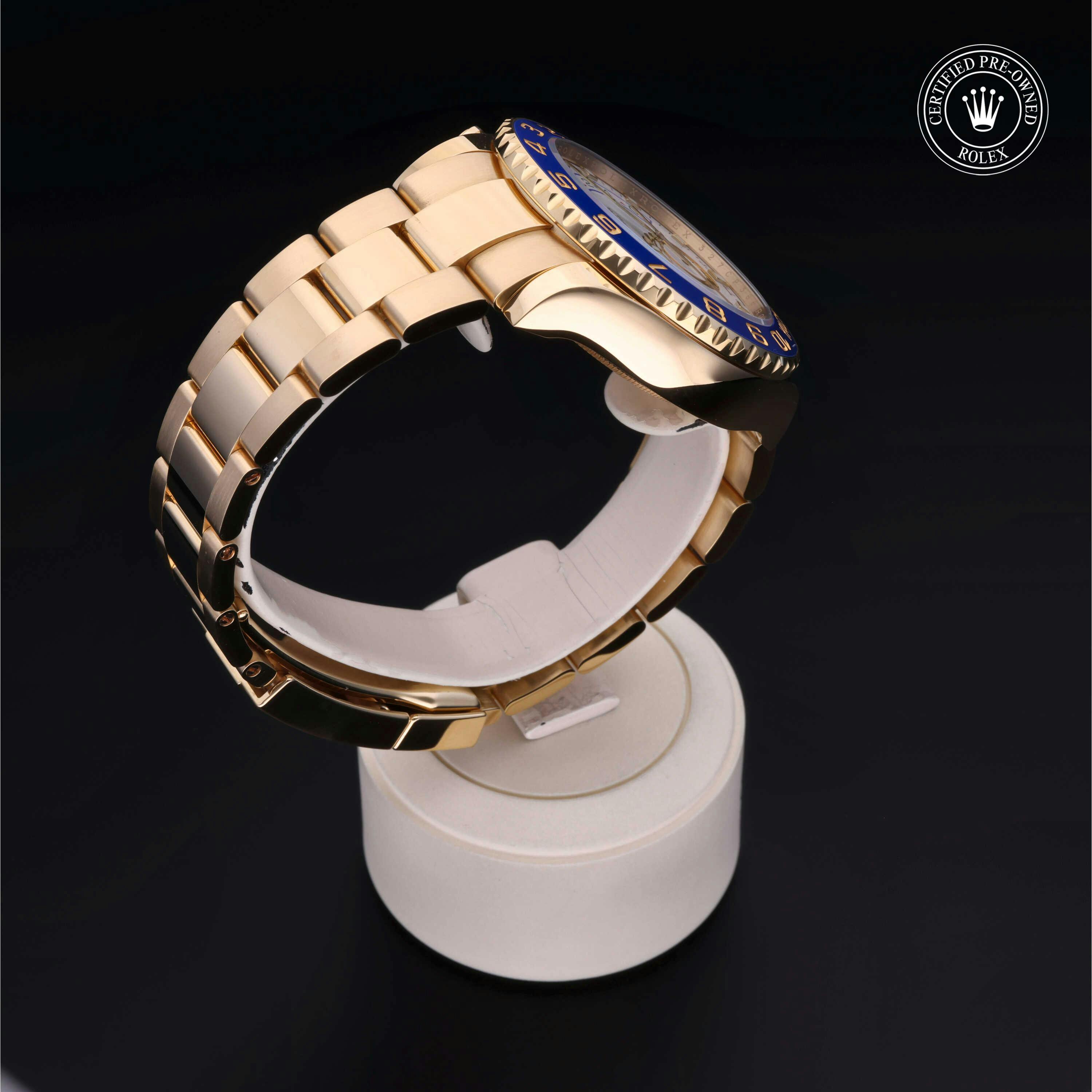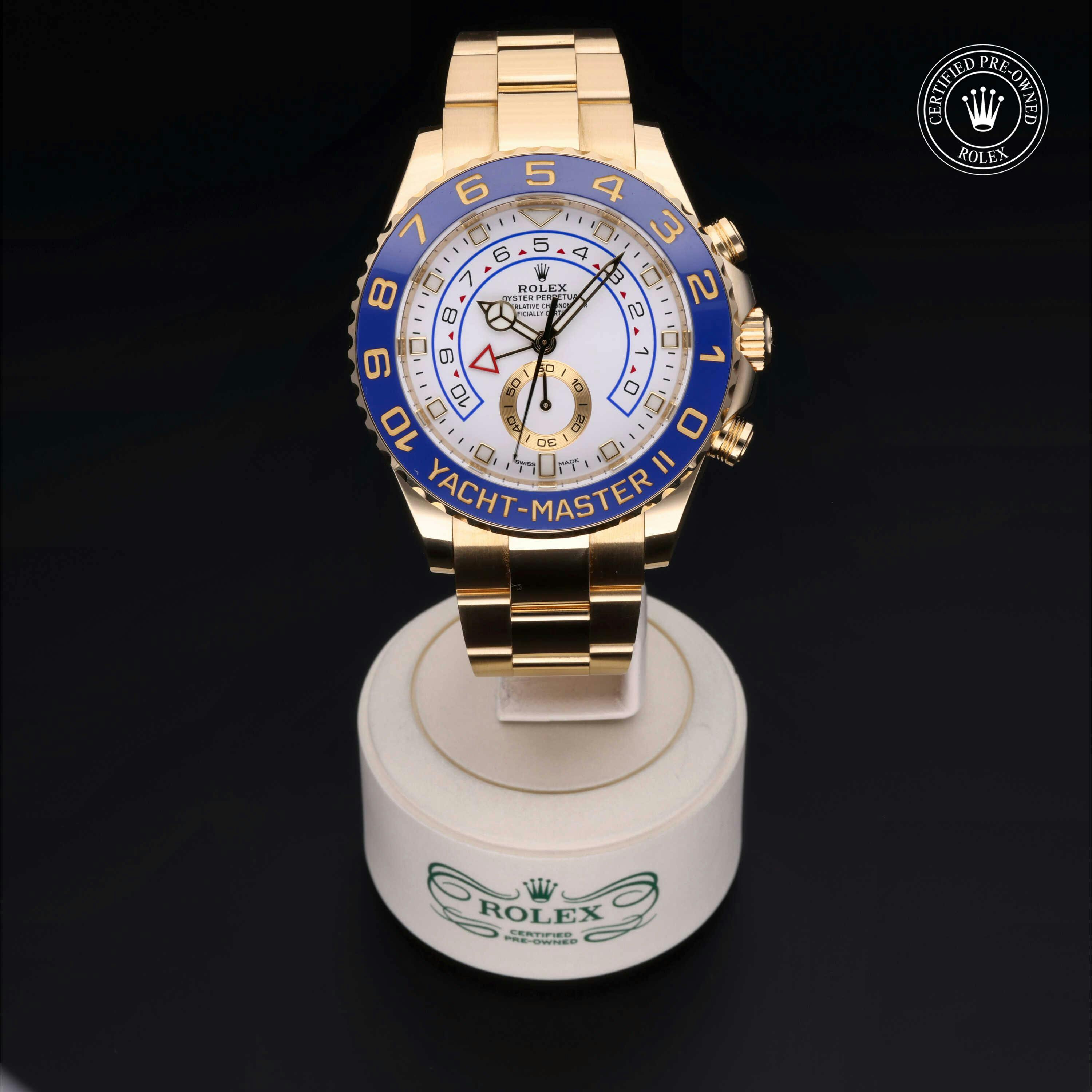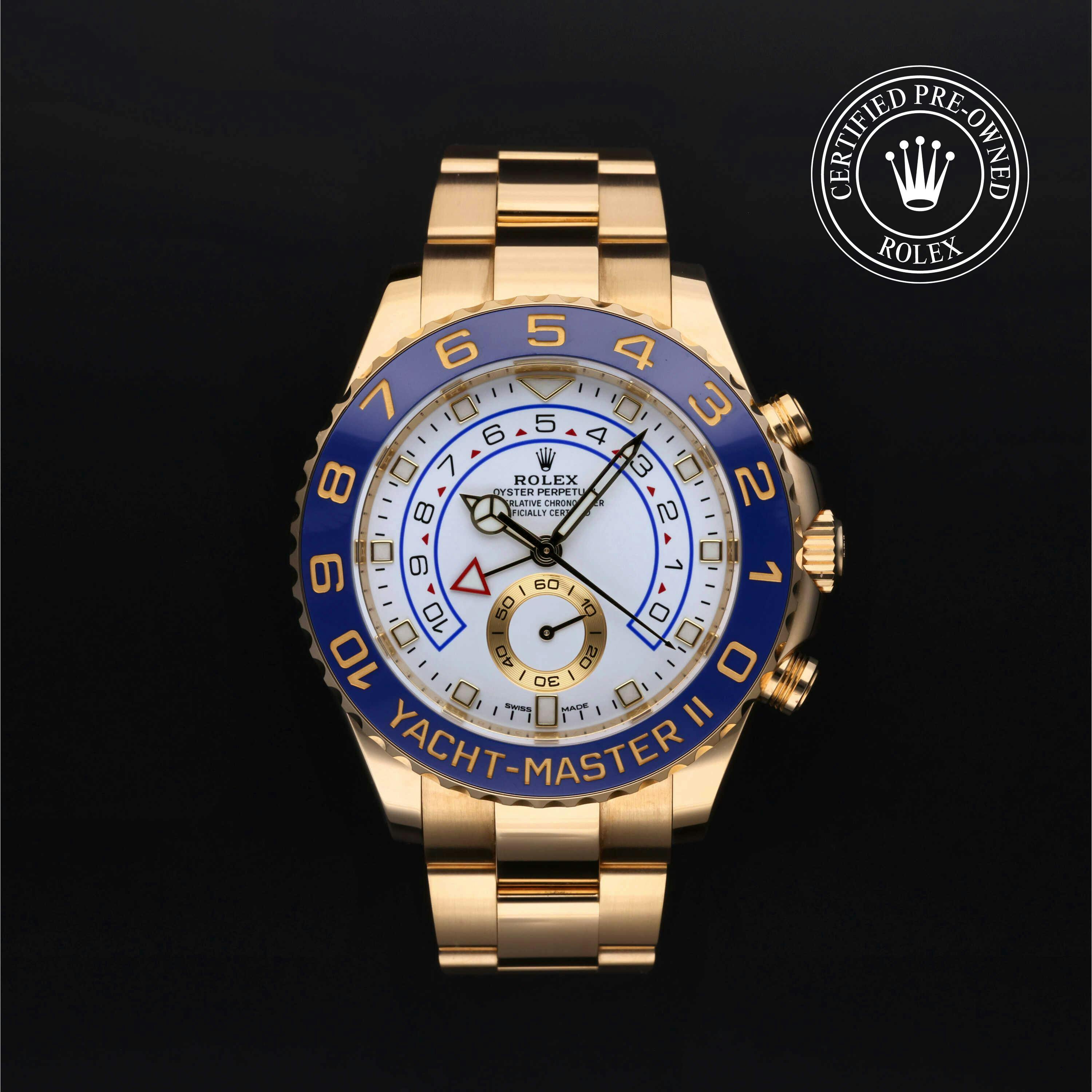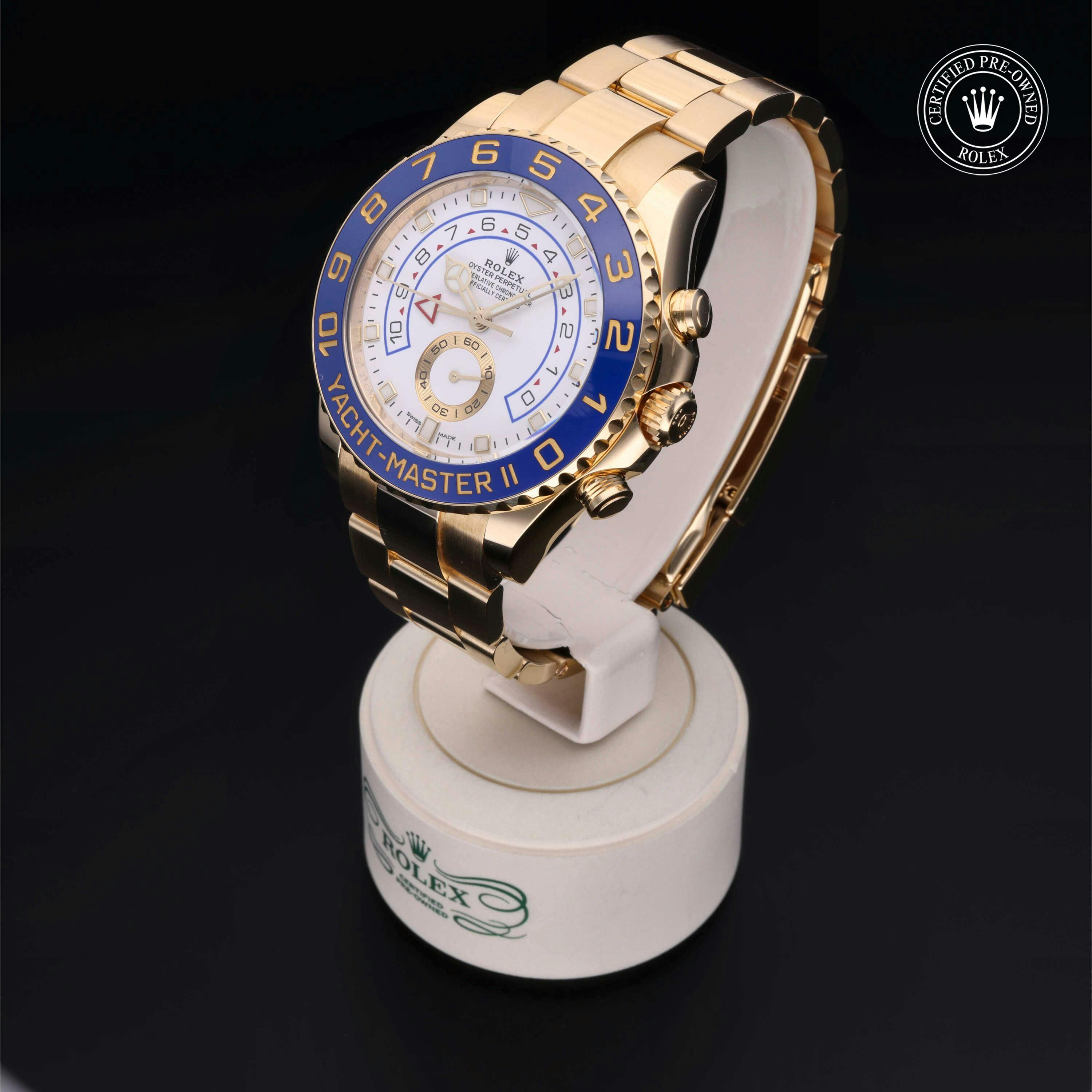 Rolex Certified Pre-Owned Yacht-Master II (116688) self - winding automatic watch, features a 44mm 18k yellow gold case with an 18k yellow gold bidirectional rotating bezel featuring a blue cerachrom insert. The bezel is surrounding a white dial and the watch is secured on an 18k yellow gold Oyster bracelet complete with a folding buckle. Functions include hours, minutes, seconds and countdown timer. This watch has been serviced by an authorized service center and certified by Rolex. It comes with the original box and papers as well as a custom Rolex Certified Pre-Owned hang tag, travel pouch and international warranty card.