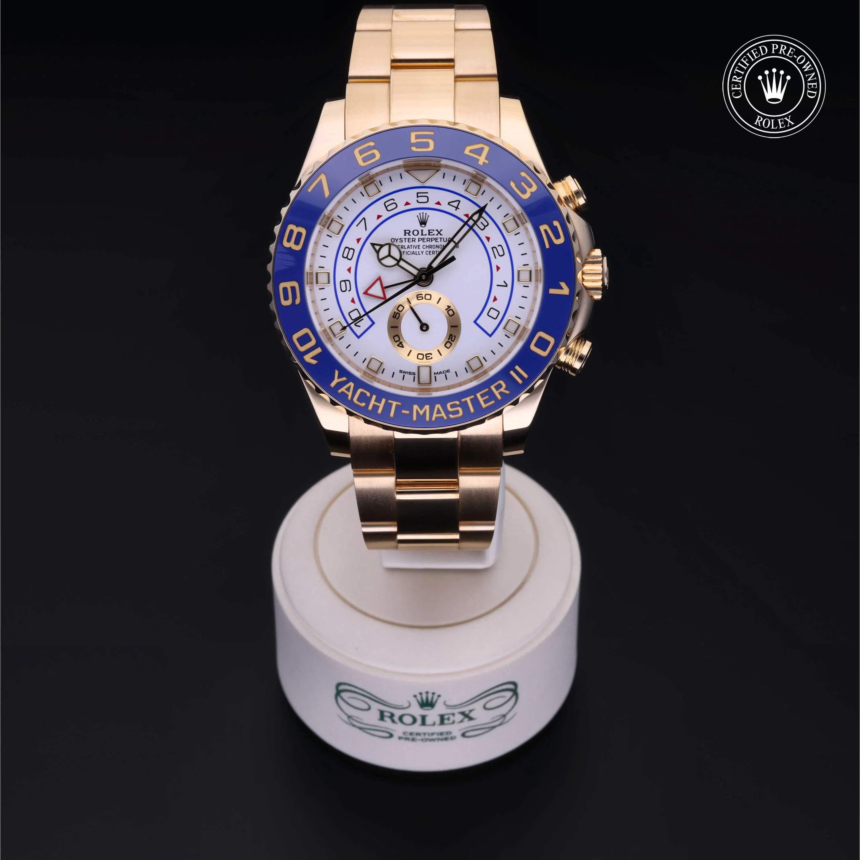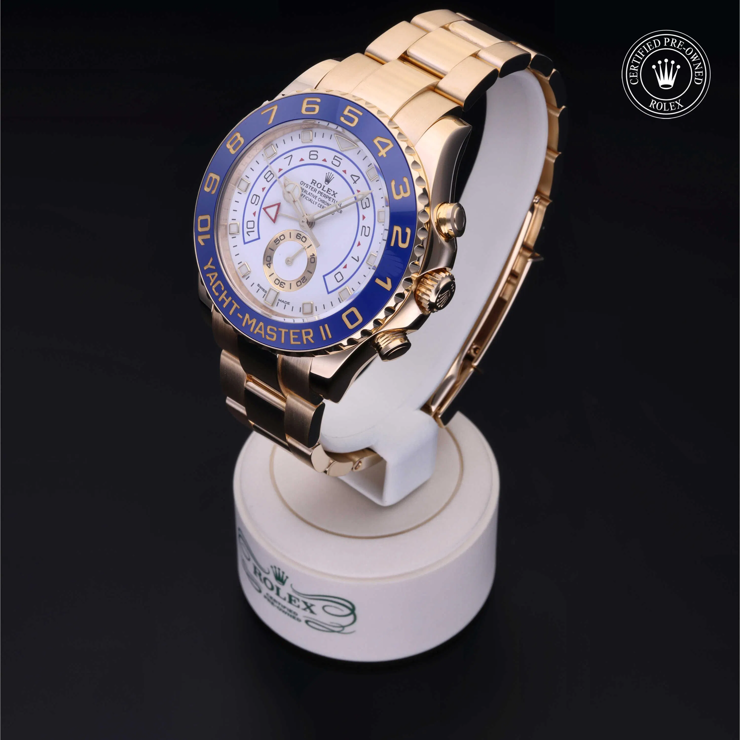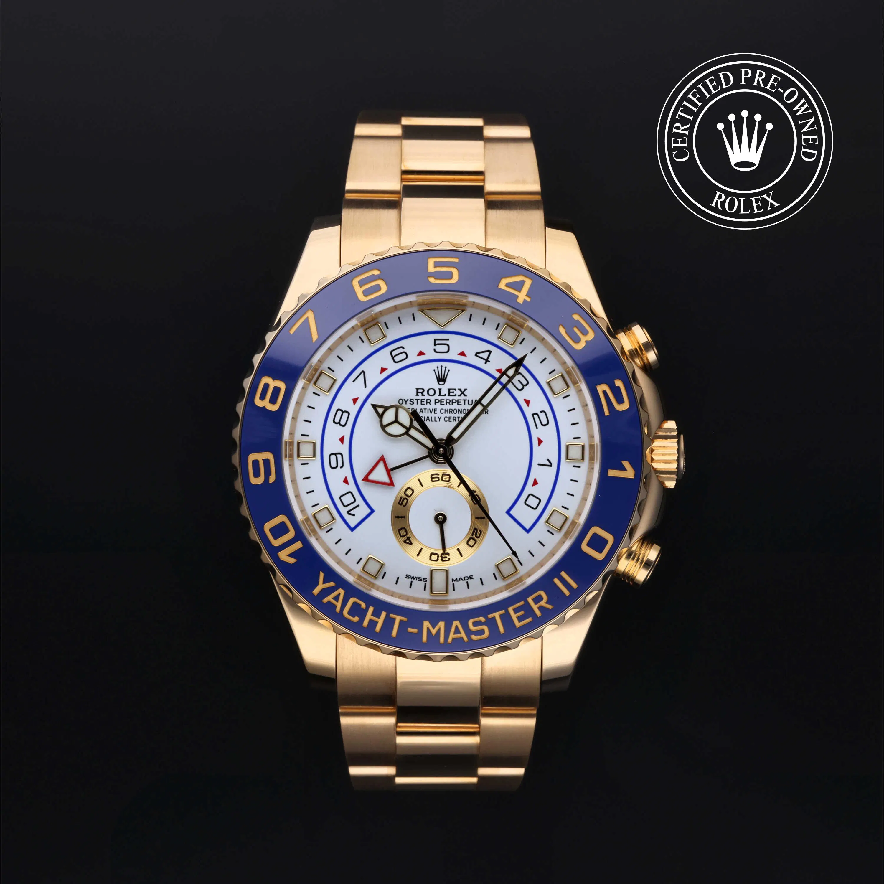 Rolex Certified Pre-Owned Yacht-Master II (116688) self - winding automatic watch, features a 44mm 18k yellow gold case and bidirectional rotating bezel with a blue cerachrom insert surrounding a white dial on an 18k yellow gold oyster bracelet. Functions include hours, minutes, seconds and countdown timer. This watch has received Rolex-authorized service and certification. It comes with the original box and papers, and includes a custom Rolex Certified Pre-Owned hang tag, travel pouch and RCPO international warranty card.