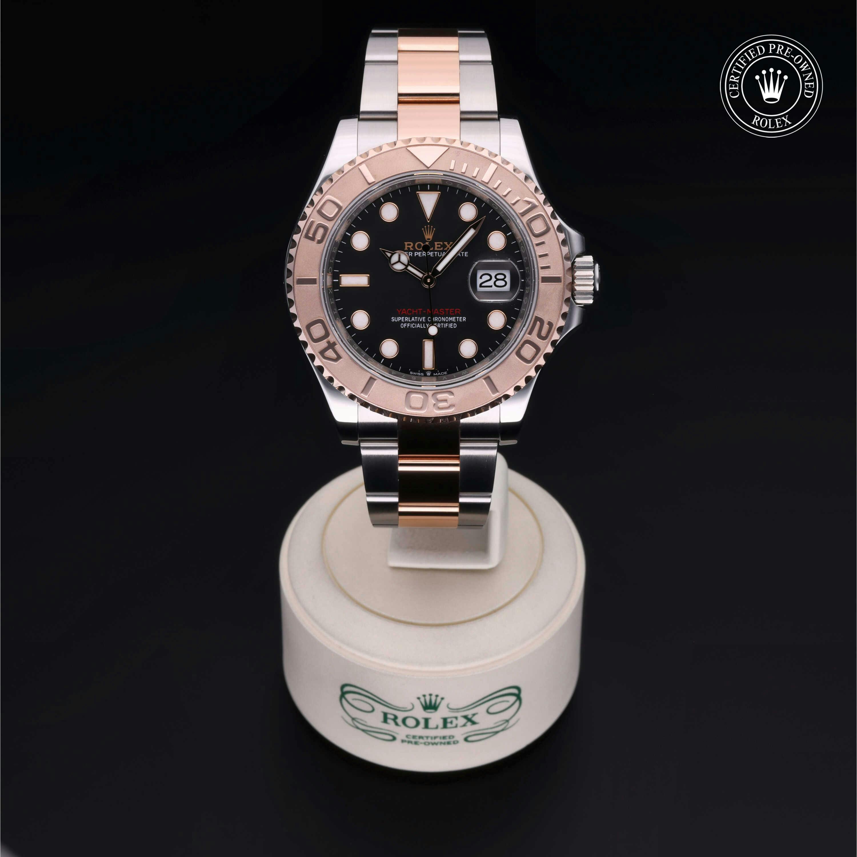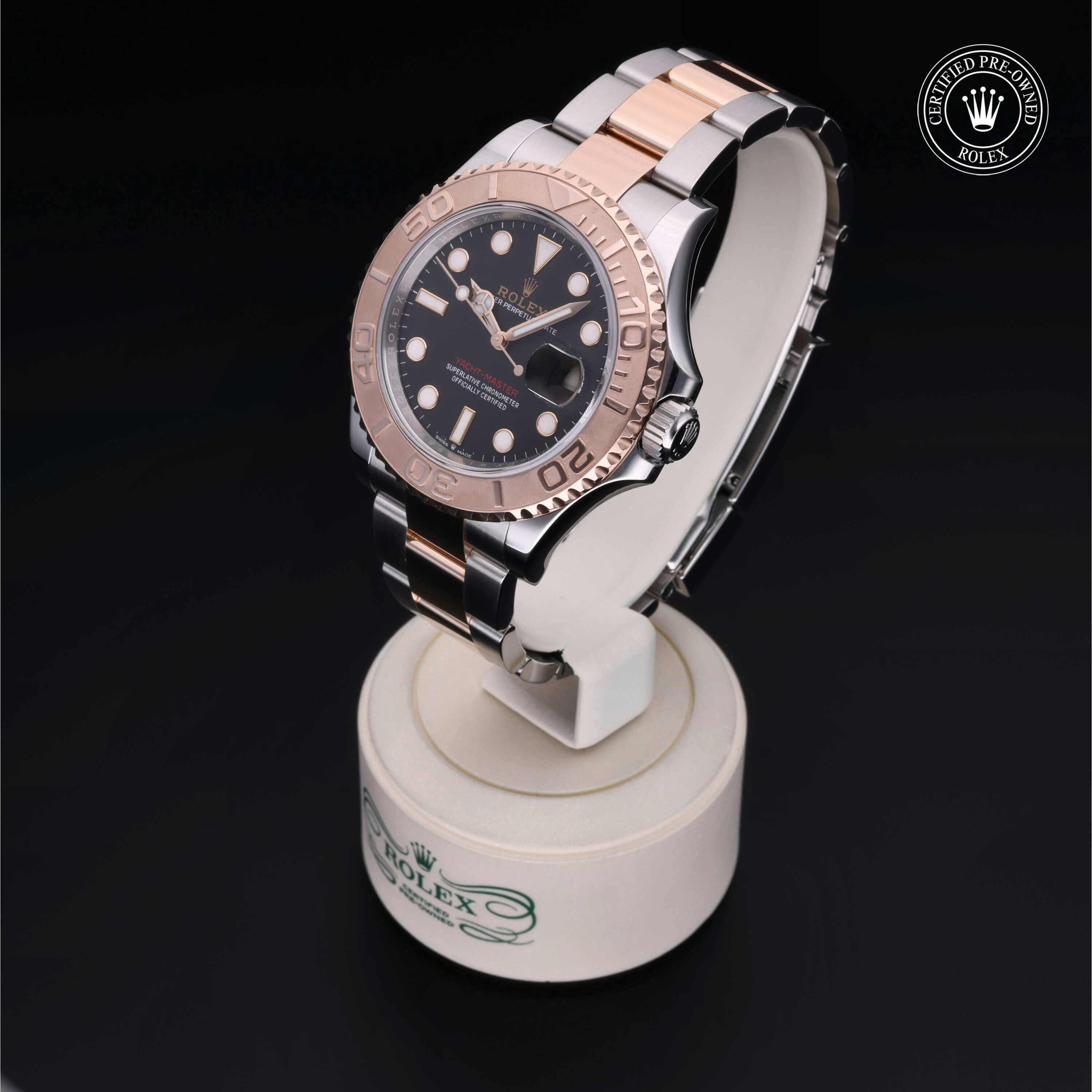 Rolex Certified Pre-Owned Yacht-Master (126621) self - winding automatic watch, features a 40mm stainless steel case with an 18k rose gold rotating bezel surrounding an intense matte black dial on a stainless steel and 18k rose gold oyster bracelet. Functions include hours, minutes, seconds and date. This watch has received Rolex-authorized service and certification. It does not come with the original box or papers, but includes a custom Rolex Certified Pre-Owned hang tag, travel pouch and RCPO international warranty card.
