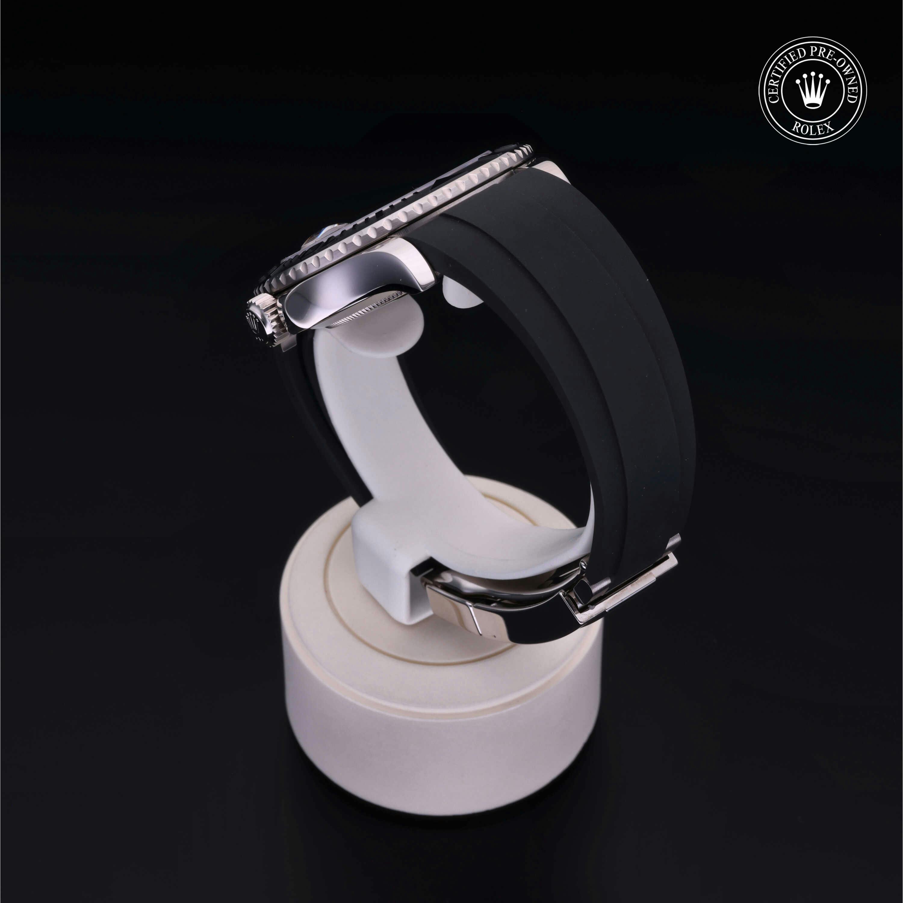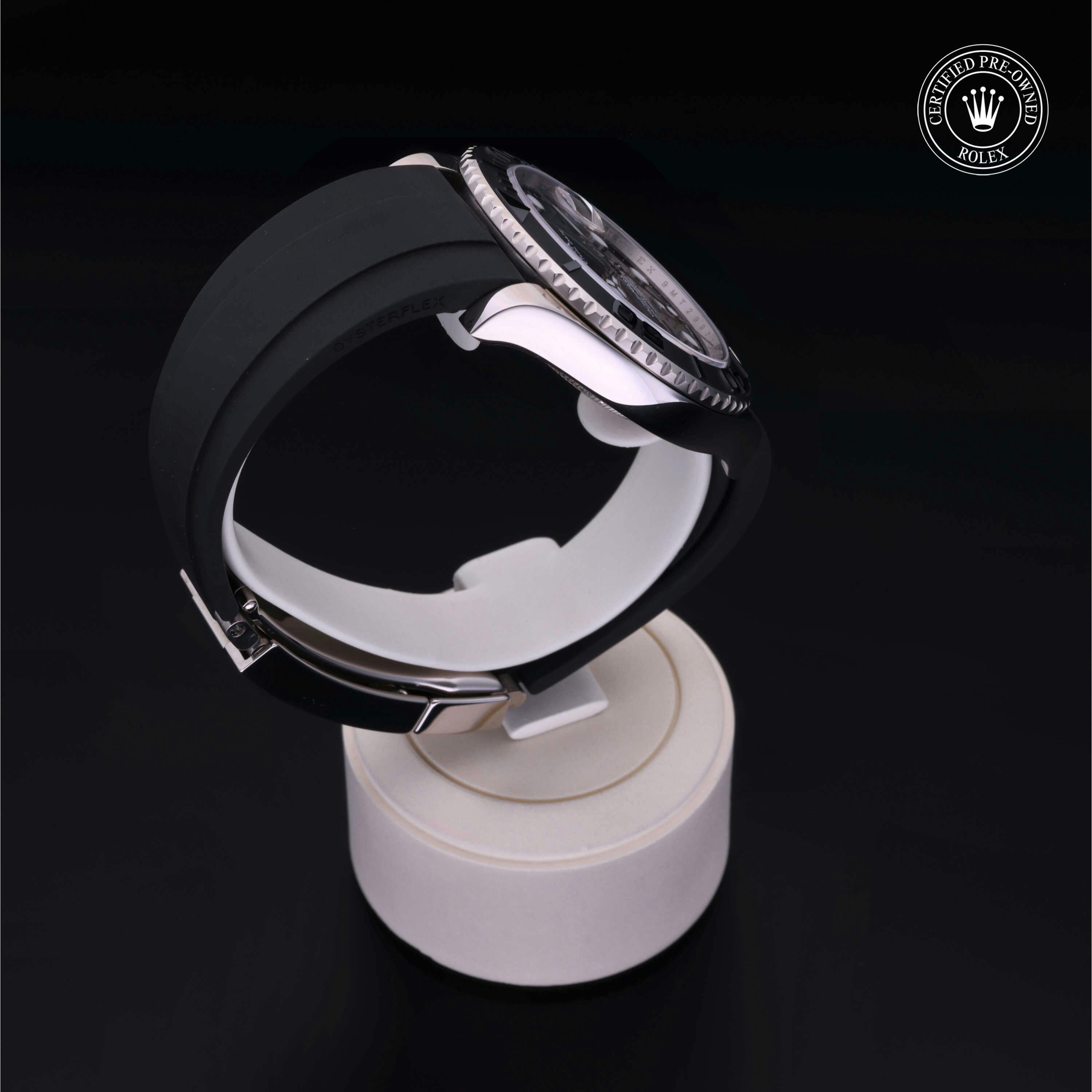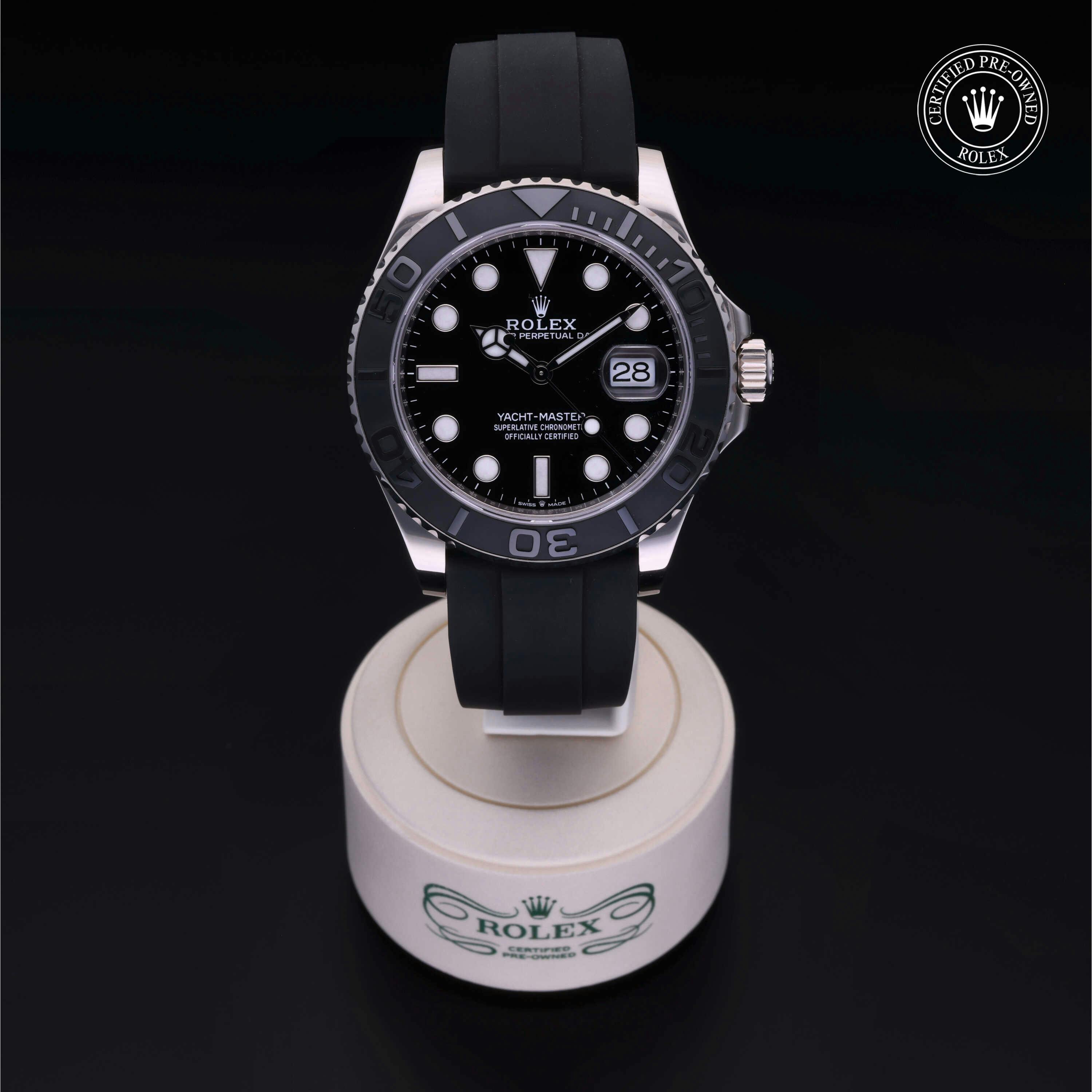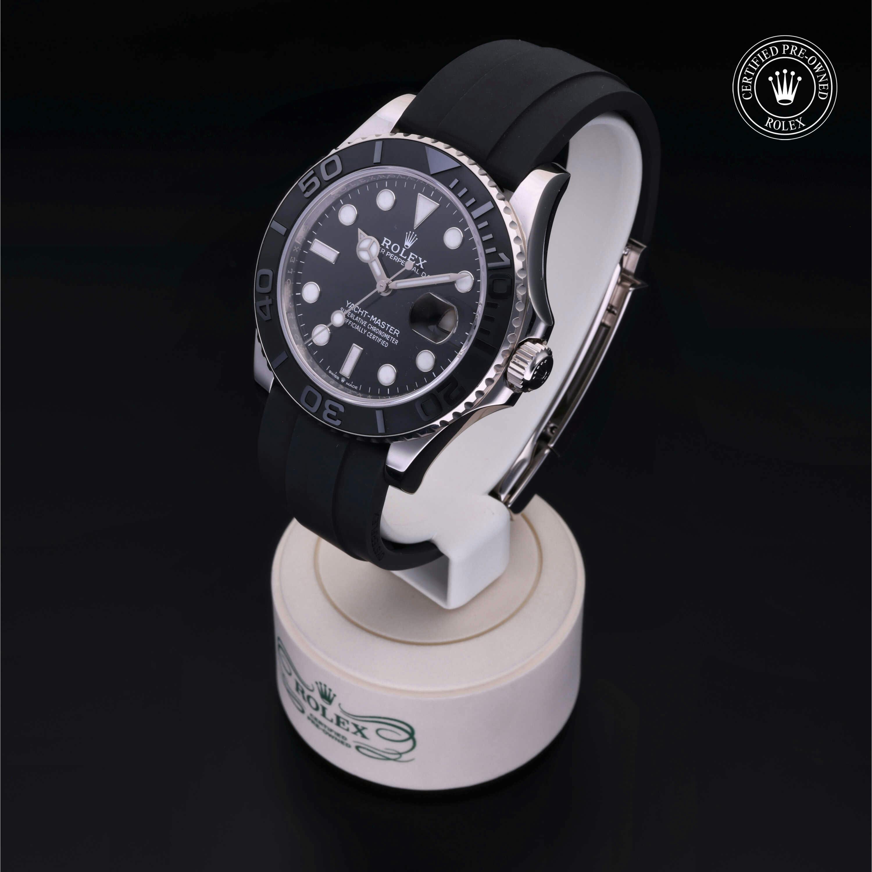 Rolex Certified Pre-Owned Yacht-Master (226659) self - winding automatic watch, features a 42mm 18k white gold case with a black cerachrom bezel surrounding a black dial on a black oysterflex strap with an 18k white gold deployant buckle. Functions include hours, minutes, seconds and date. This watch has received Rolex-authorized service and certification. It comes with the original box, and includes a Rolex Certified Pre-Owned hang tag, travel pouch and RCPO international warranty card.