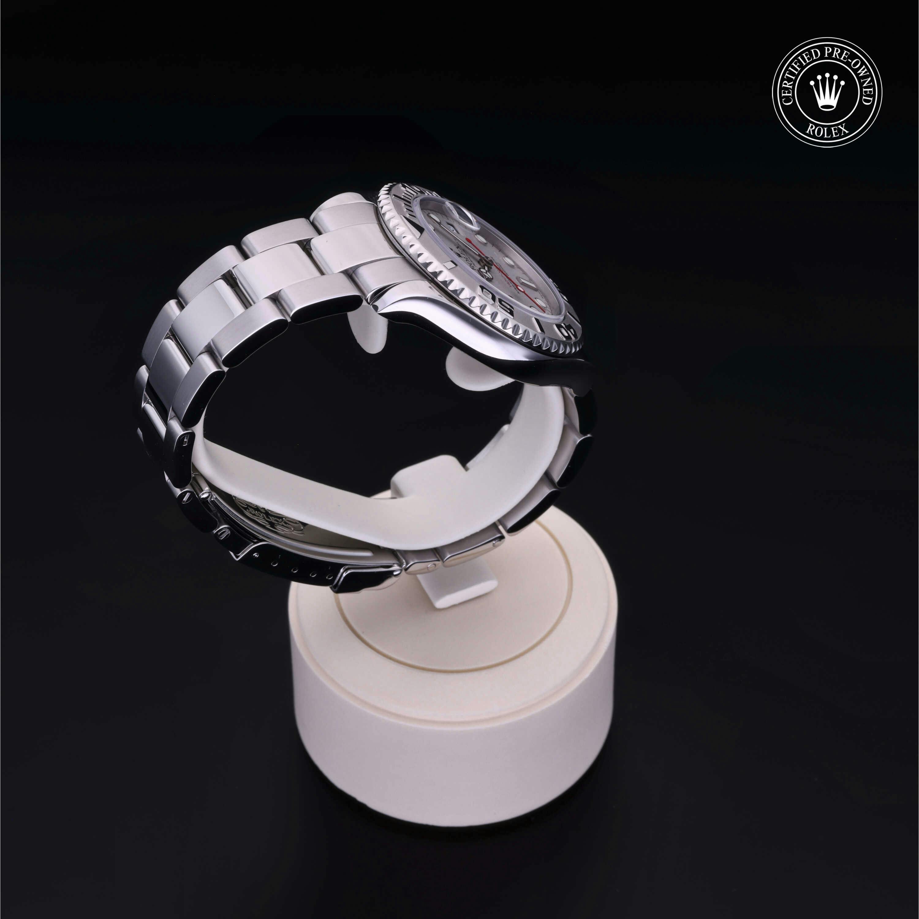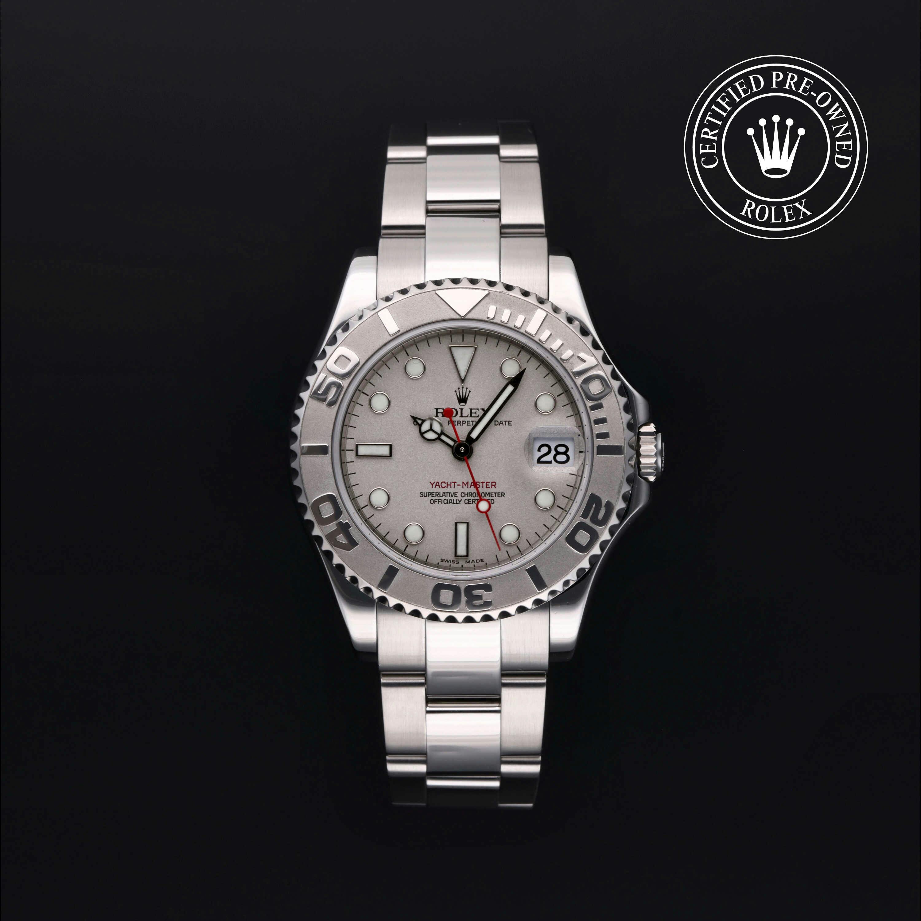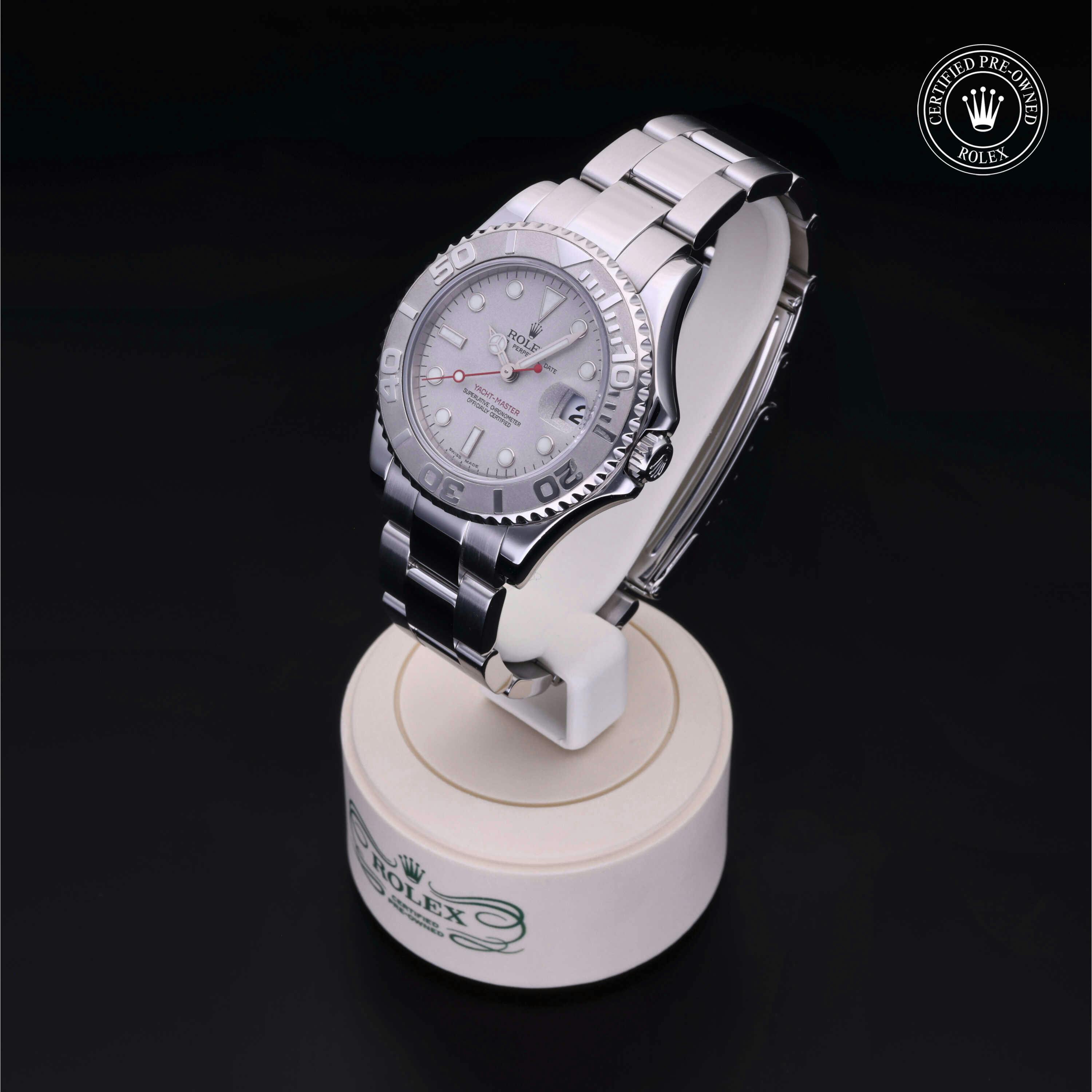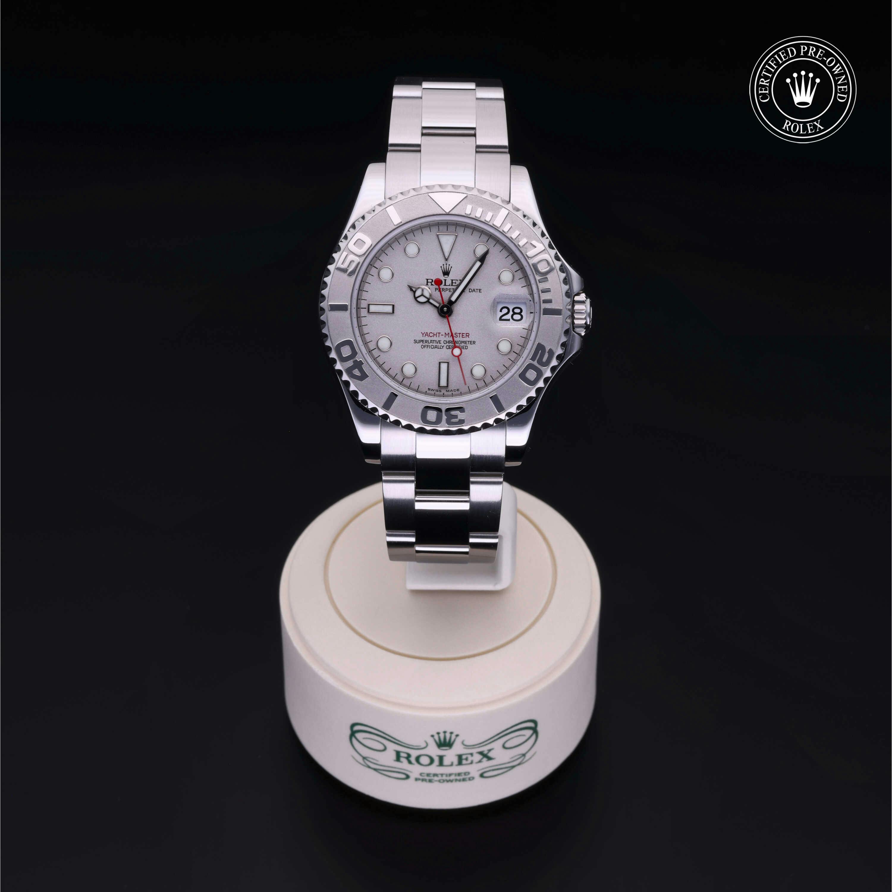 Rolex Certified Pre-Owned Yacht-Master (168622) self - winding automatic watch, features a 35mm stainless steel case with a platinum bidirectional rotating bezel surrounding a platinum dial on a stainless steel oyster bracelet. Functions include hours, minutes, seconds and date. This watch has received Rolex-authorized service and certification. It does not come with the original box or papers, but includes a custom Rolex Certified Pre-Owned hang tag, travel pouch and RCPO international warranty card.