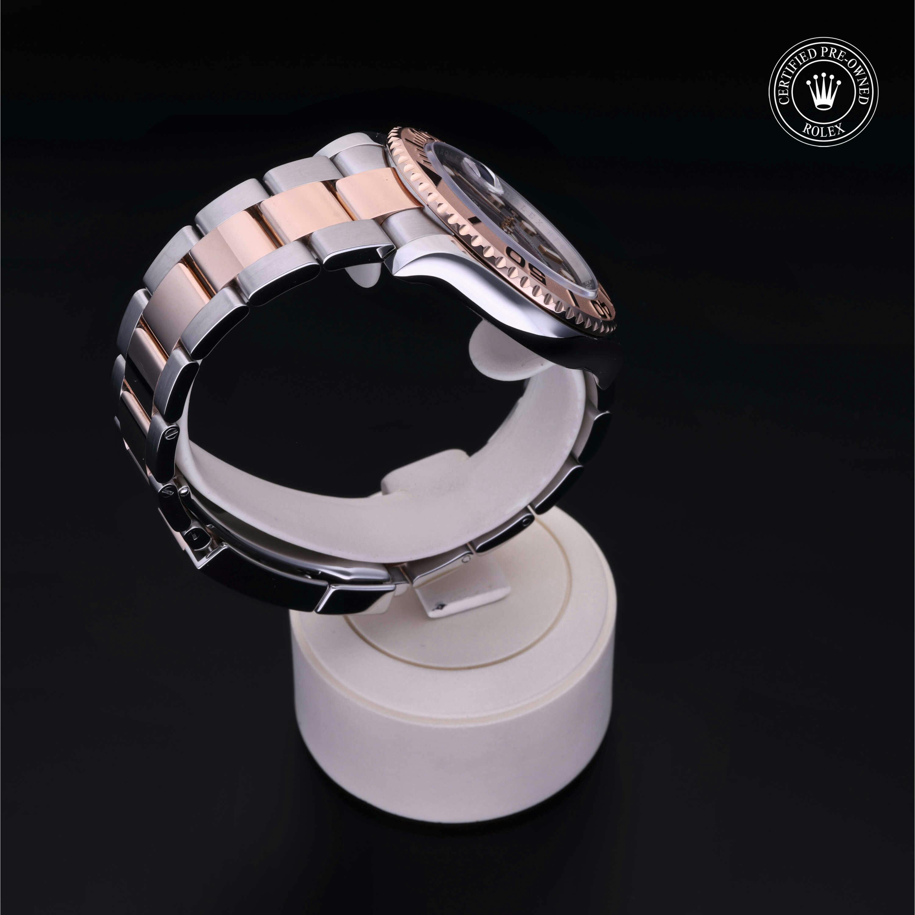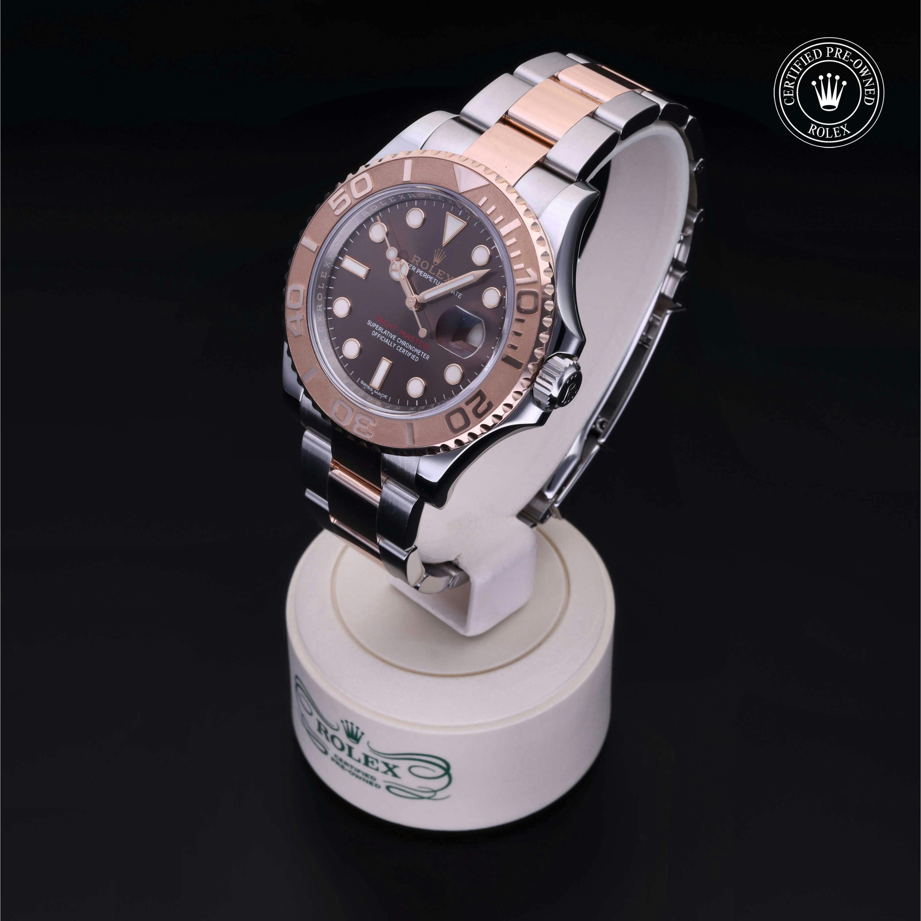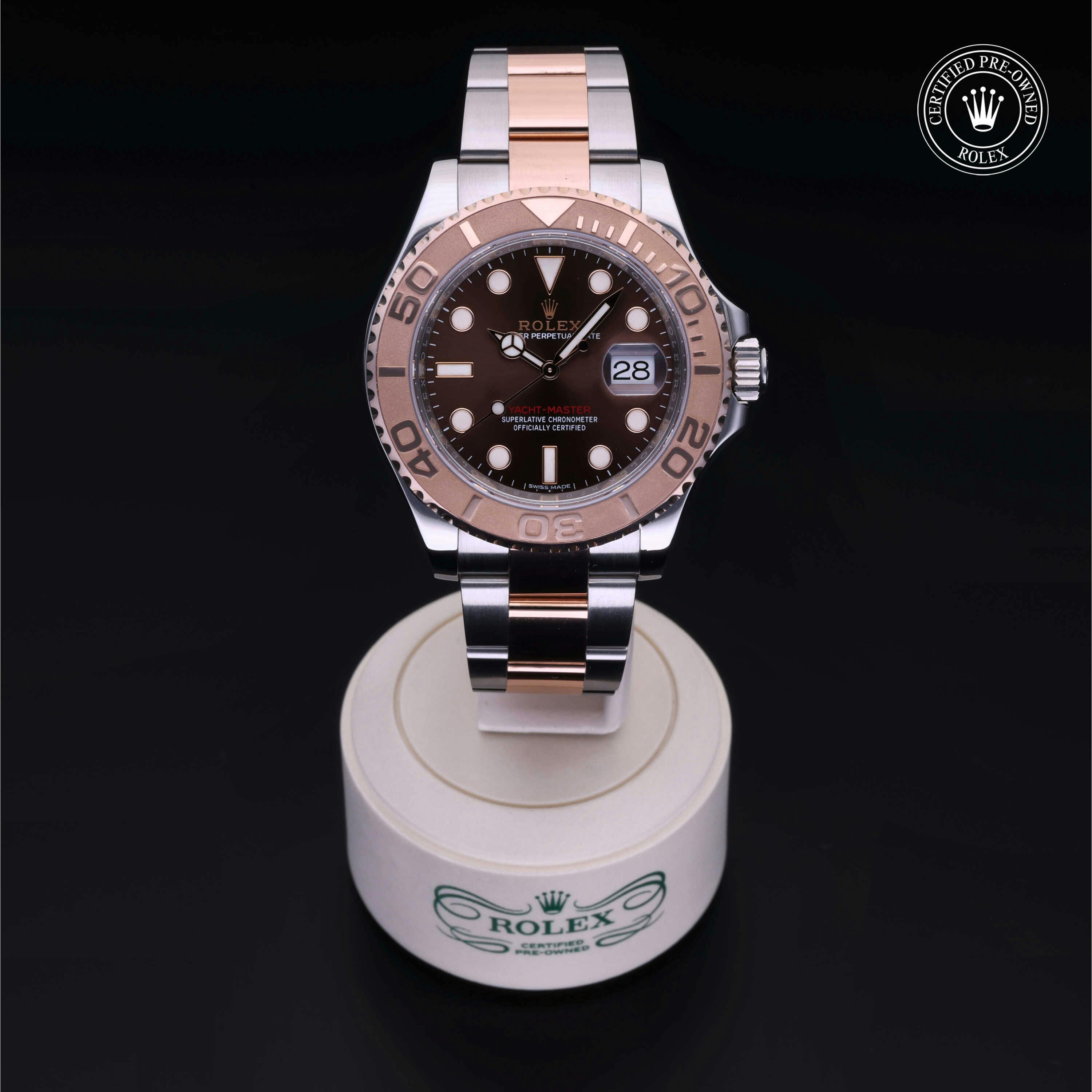 Rolex Certified Pre-Owned Yacht-Master (116621) self - winding automatic watch, features a 40mm stainless steel case with an 18k rose gold rotatable bezel surrounding a chocolate brown dial on a stainless steel and 18k rose gold oyster bracelet. Functions include hours, minutes, seconds and date. This watch has received Rolex-authorized service and certification. It does not come with the original box or papers, but includes a custom Rolex Certified Pre-Owned hang tag, travel pouch and RCPO international warranty card.