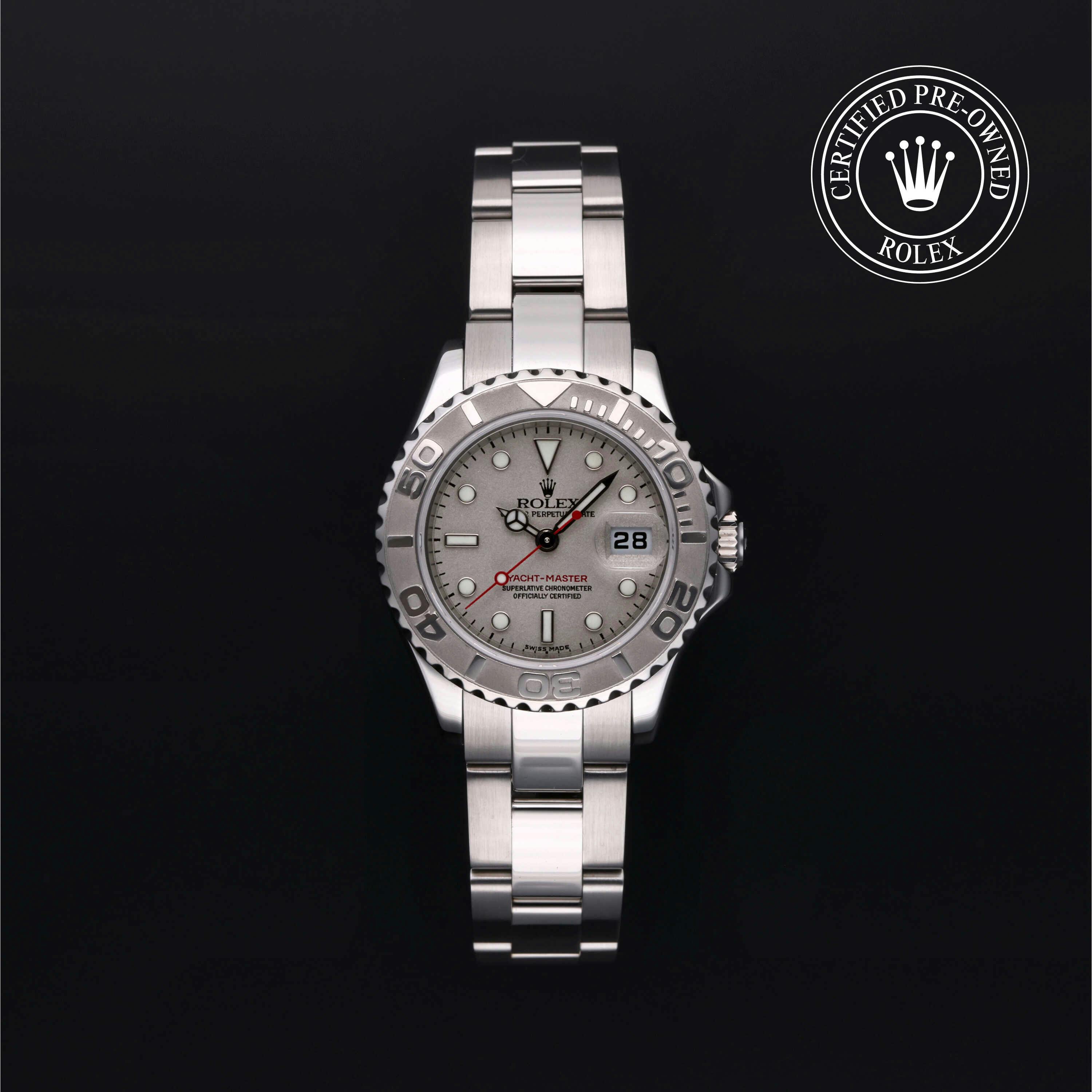 Rolex Certified Pre-Owned Yacht-Master (169622) self - winding automatic watch, features a 29mm stainless steel case with a platinum bezel surrounding a platinum dial on a stainless steel oyster bracelet. Functions include hours, minutes, seconds and date. This watch has received Rolex-authorized service and certification. It does not come with the original box or papers, but includes a custom Rolex Certified Pre-Owned hang tag, travel pouch and RCPO international warranty card.