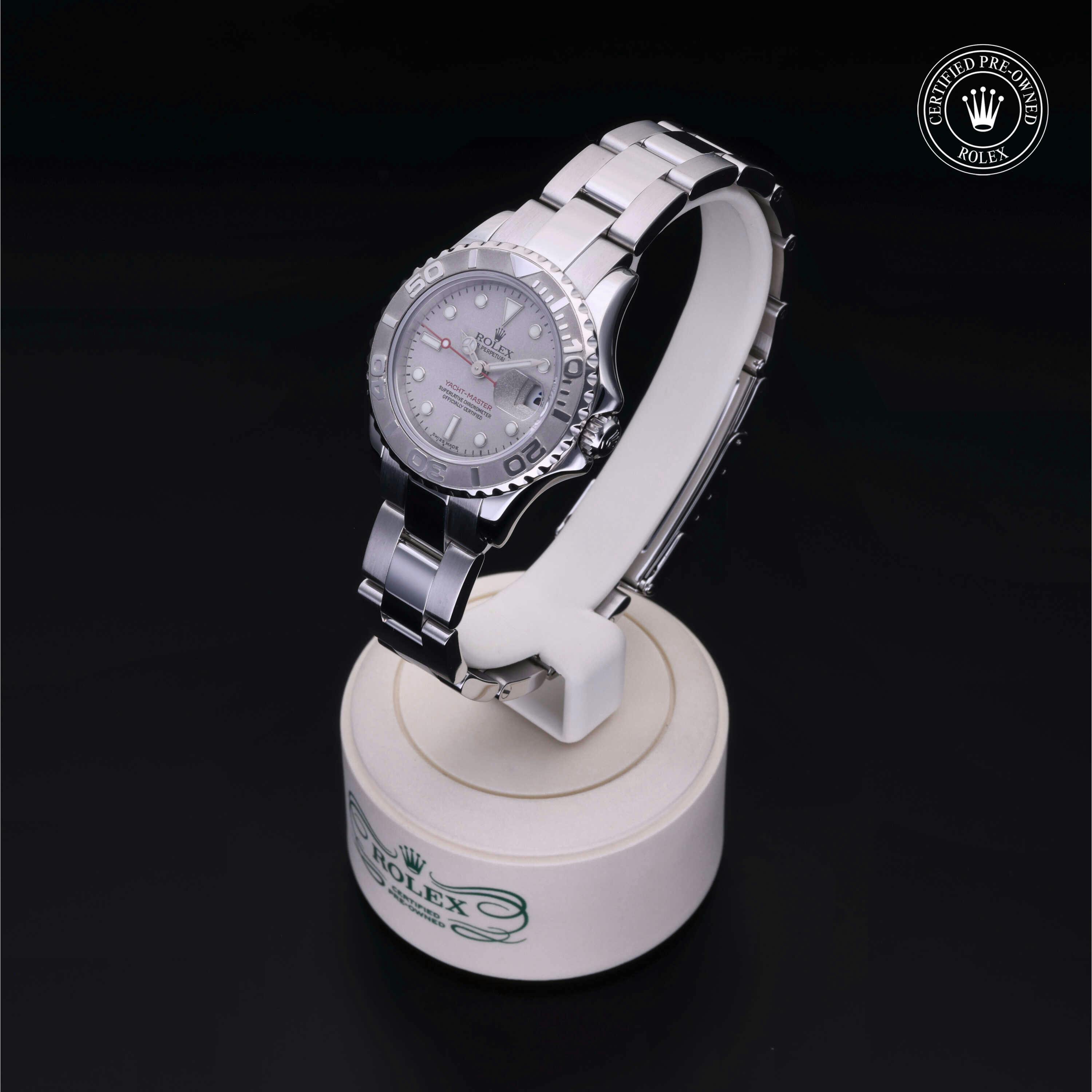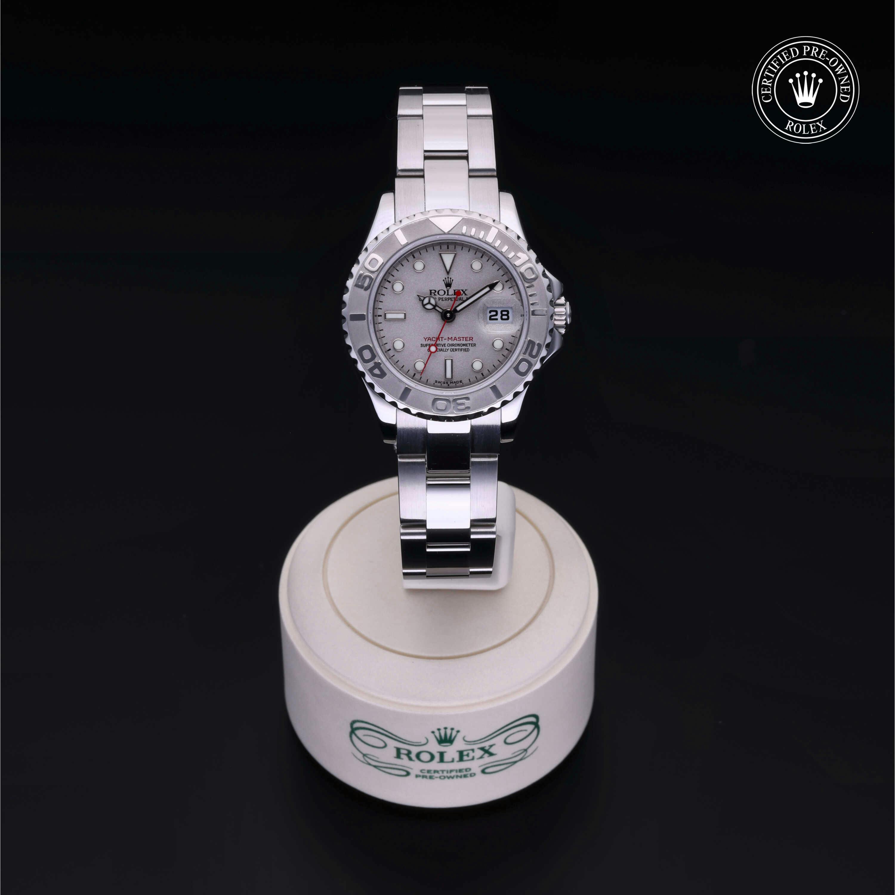 Rolex Certified Pre-Owned Yacht-Master (169622) self - winding automatic watch, features a 29mm stainless steel case with a platinum bezel surrounding a platinum dial on a stainless steel oyster bracelet. Functions include hours, minutes, seconds and date. This watch has received Rolex-authorized service and certification. It does not come with the original box or papers, but includes a custom Rolex Certified Pre-Owned hang tag, travel pouch and RCPO international warranty card.