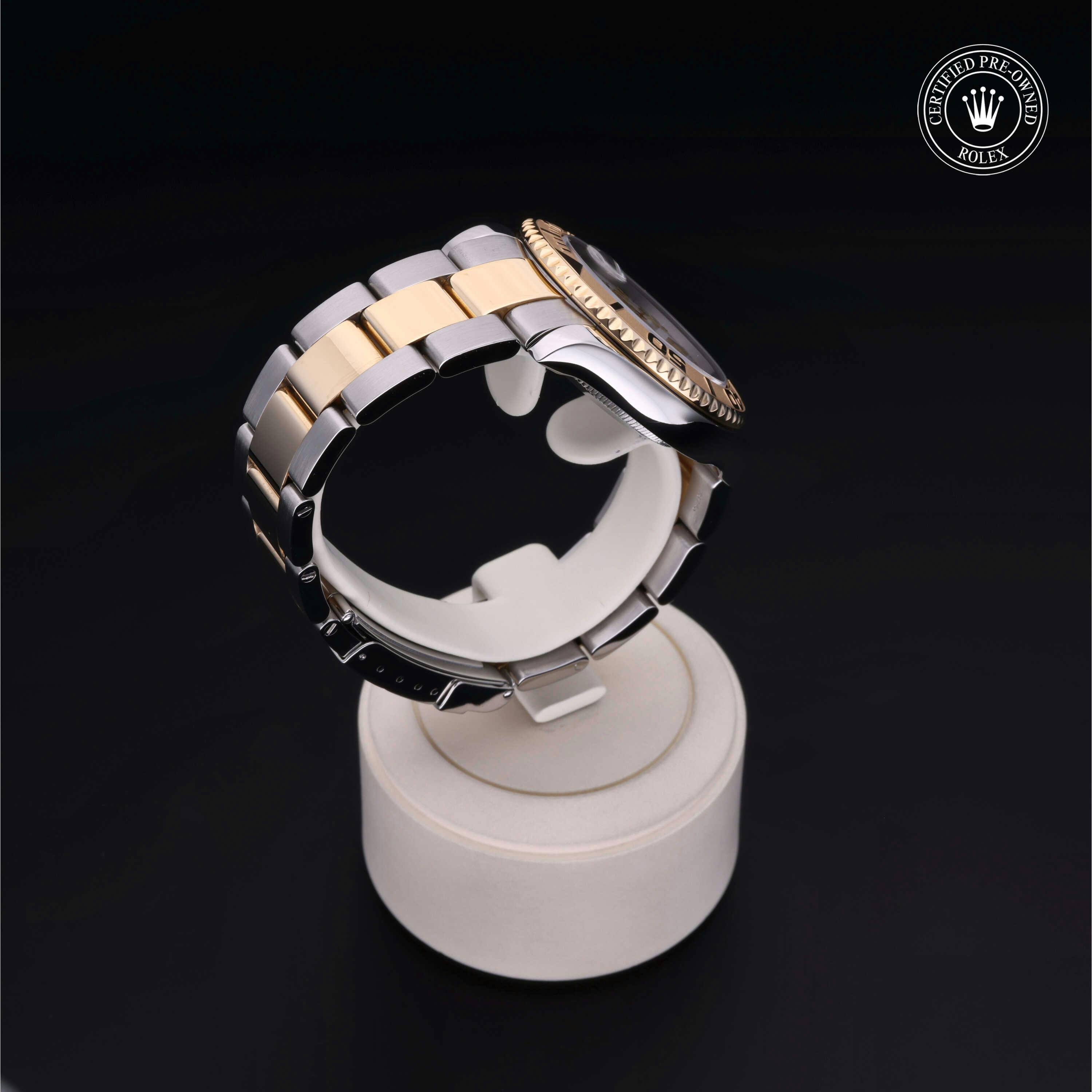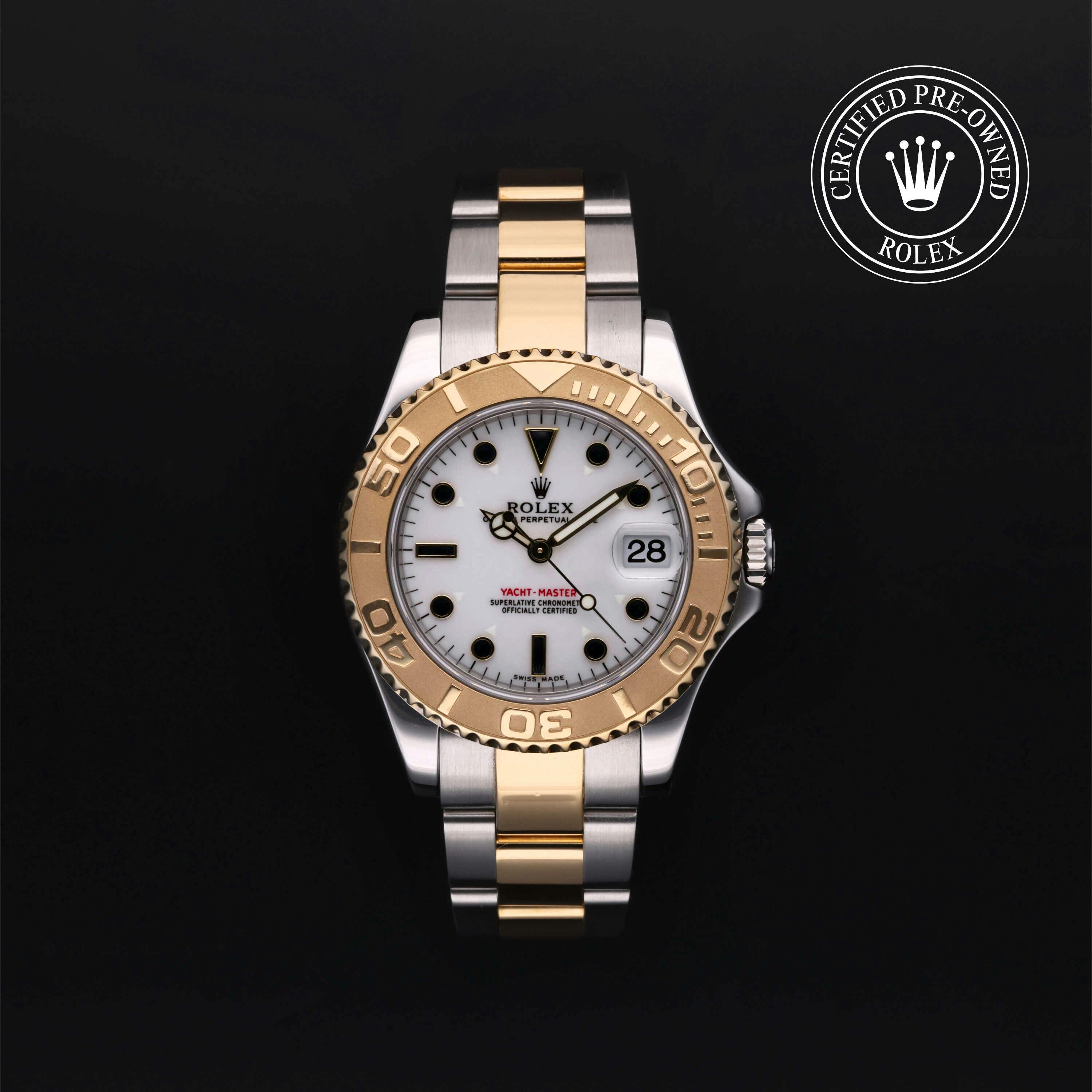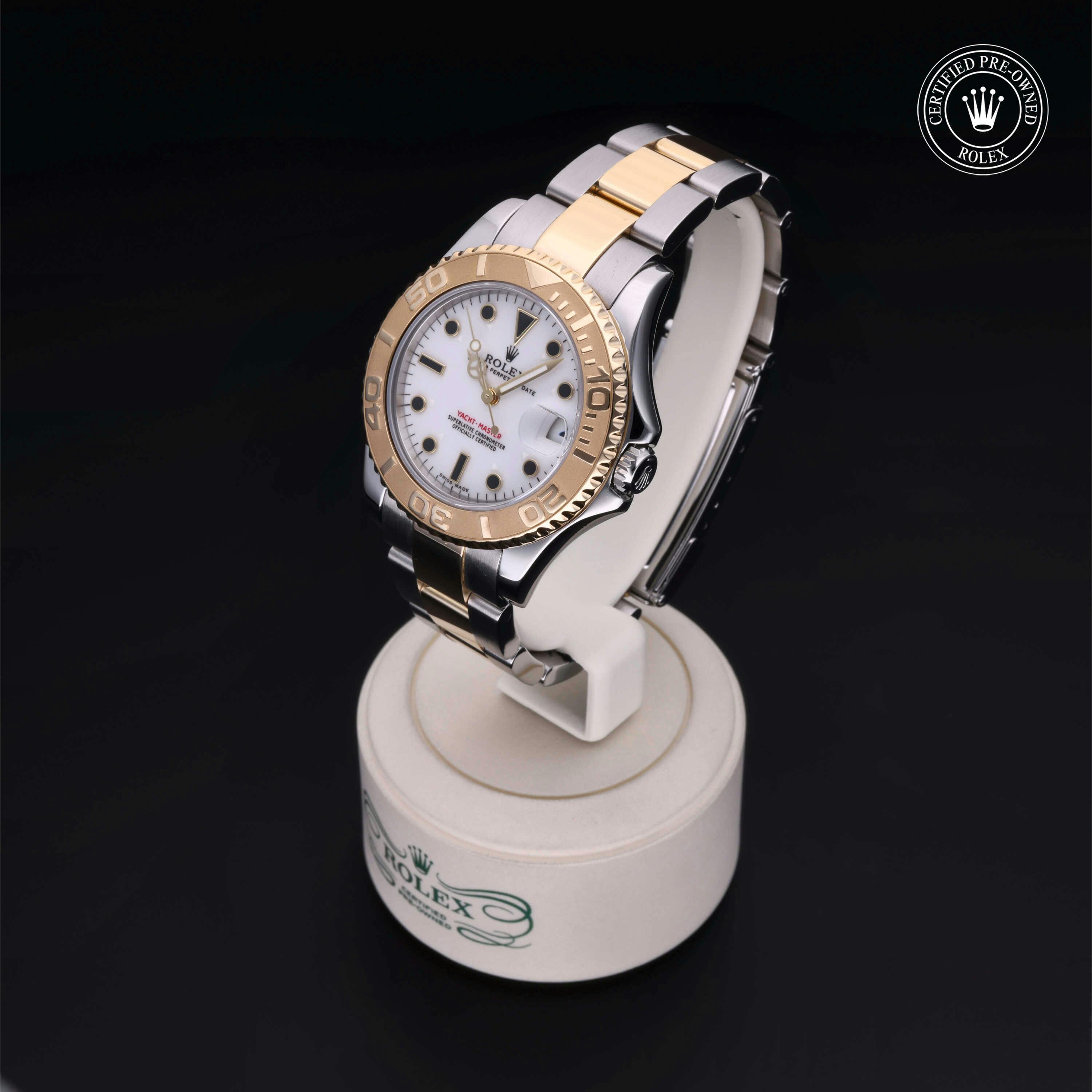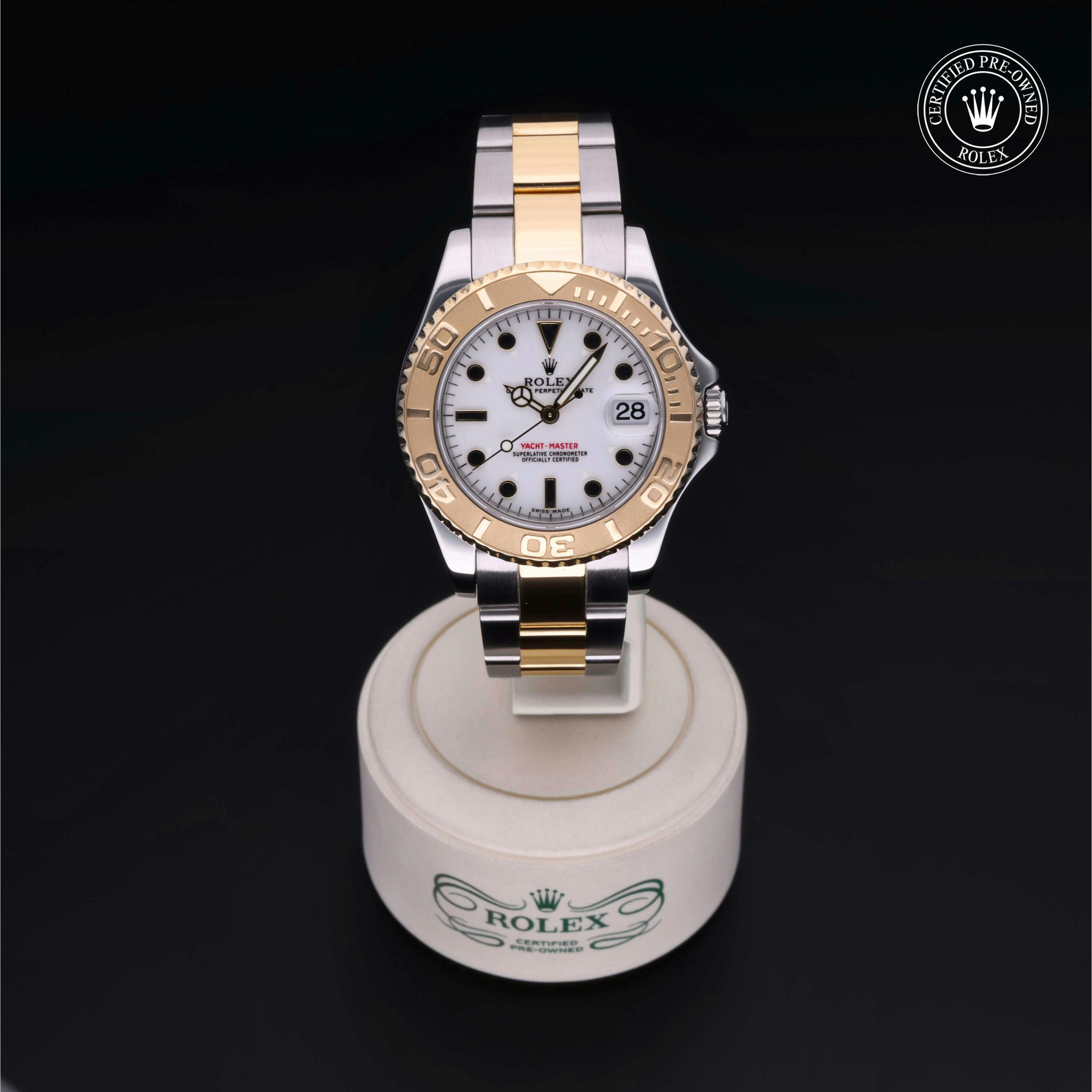 Rolex Certified Pre-Owned Yacht-Master (168623) self - winding automatic watch, features a 35mm stainless steel case with an 18k yellow gold bidirectional rotating bezel surrounding a white dial on a stainless steel and 18k yellow gold oyster bracelet. Functions include hours, minutes, seconds and date. This watch has received Rolex-authorized service and certification. It comes with the original papers, and includes a custom Rolex Certified Pre-Owned hang tag, travel pouch and RCPO international warranty card.