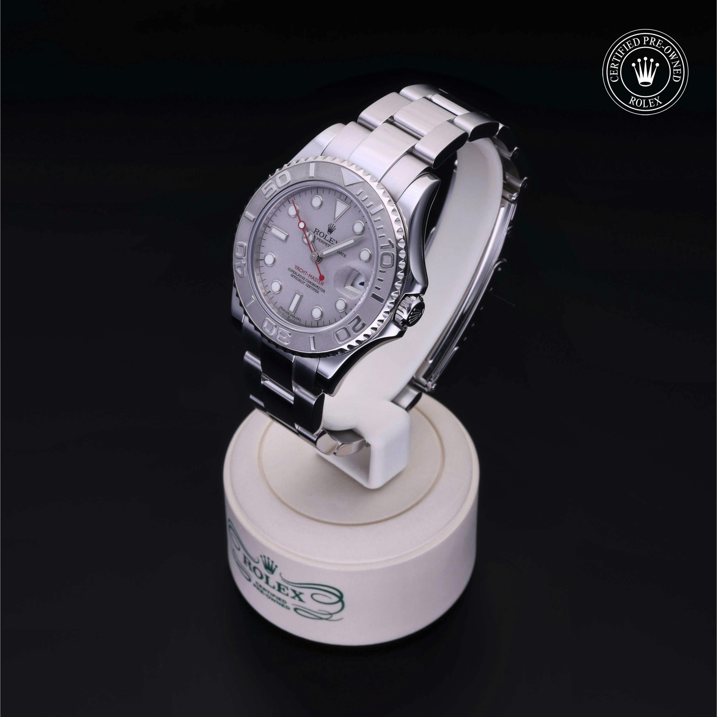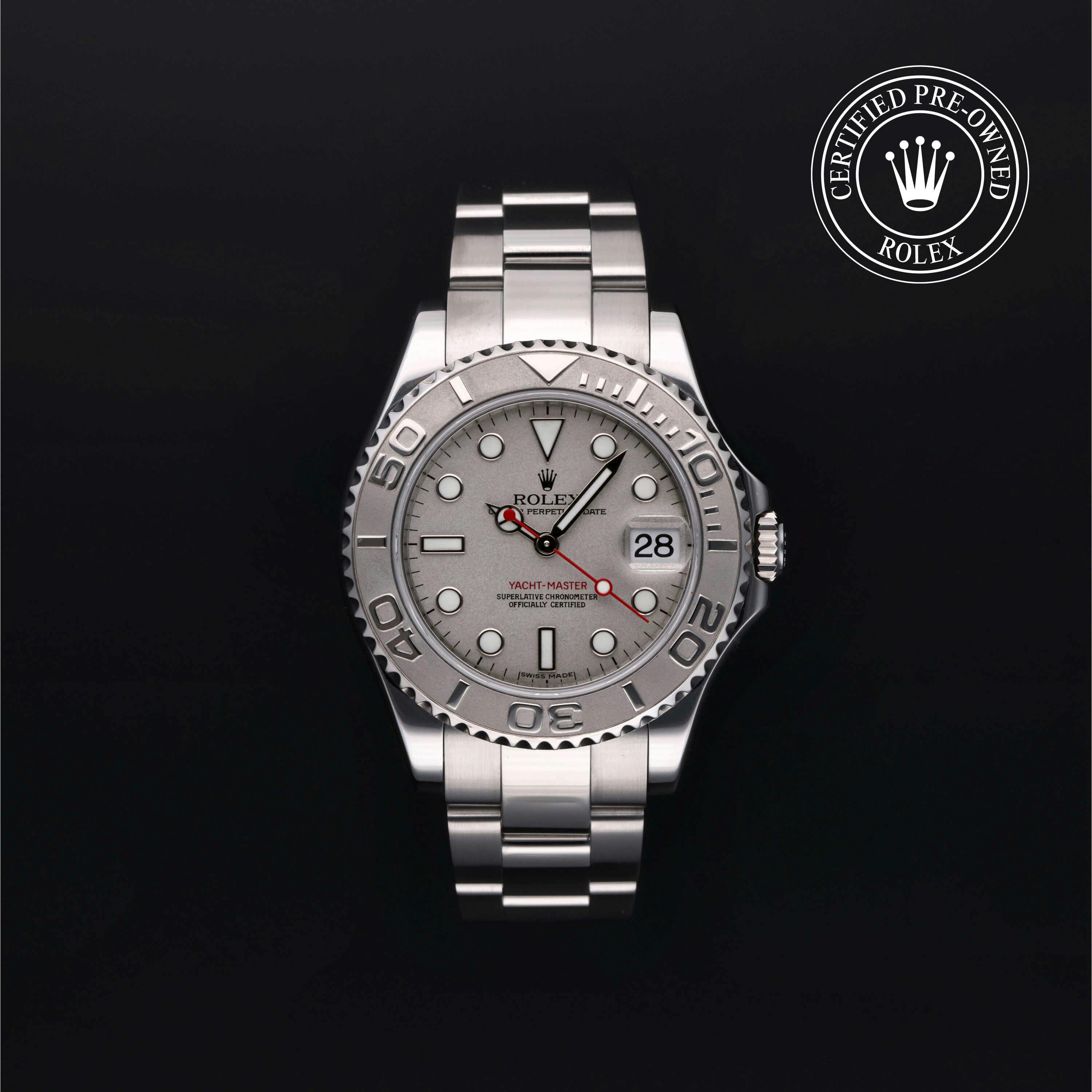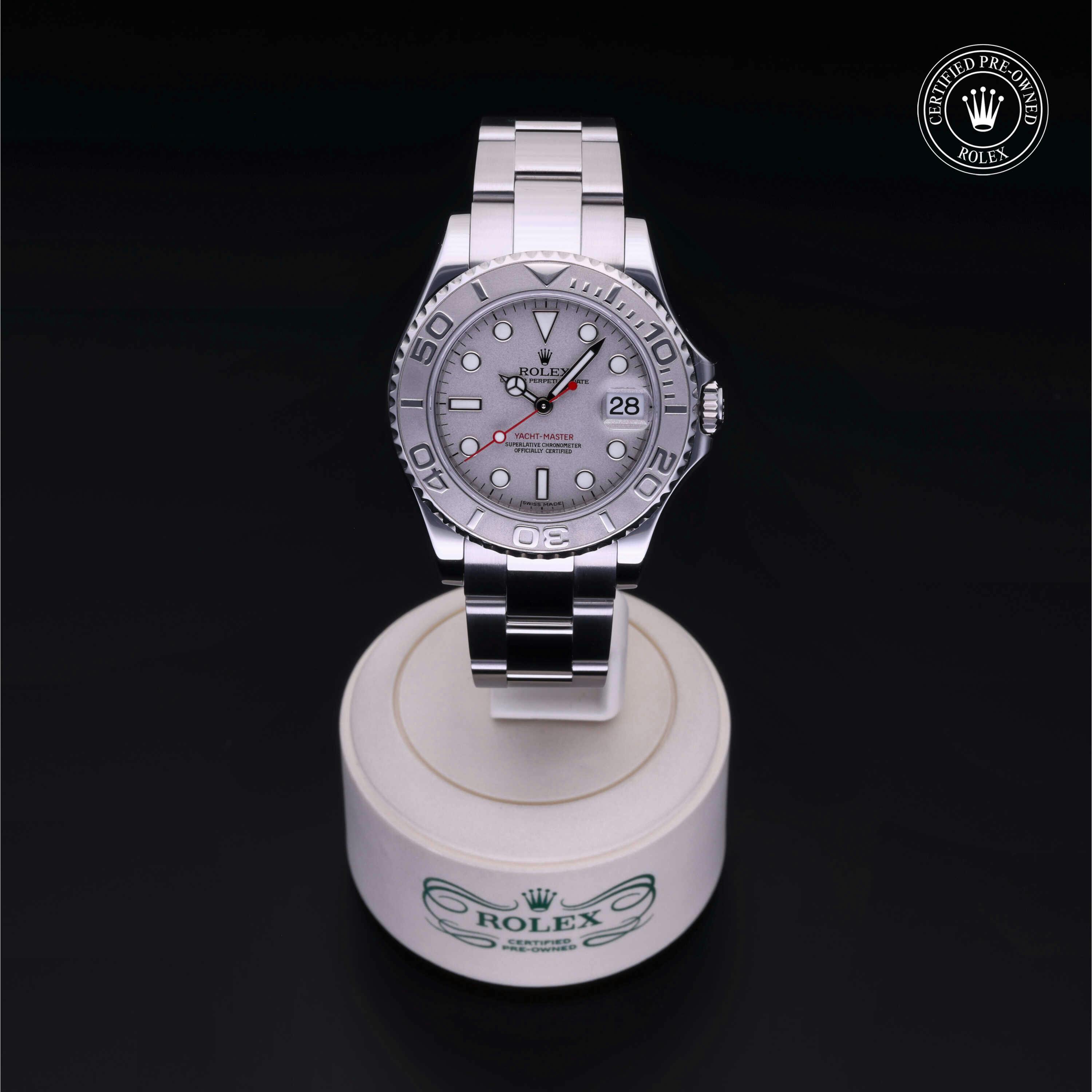 Rolex Certified Pre-Owned Yacht-Master (168622) self - winding automatic watch, features a 35mm stainless steel case with a platinum rotatable bezel surrounding a platinum dial on a stainless steel oyster bracelet. Functions include hours, minutes, seconds and date. This watch has received Rolex-authorized service and certification. It does not come with the original box or papers, but includes a custom Rolex Certified Pre-Owned hang tag, travel pouch and RCPO international warranty card.