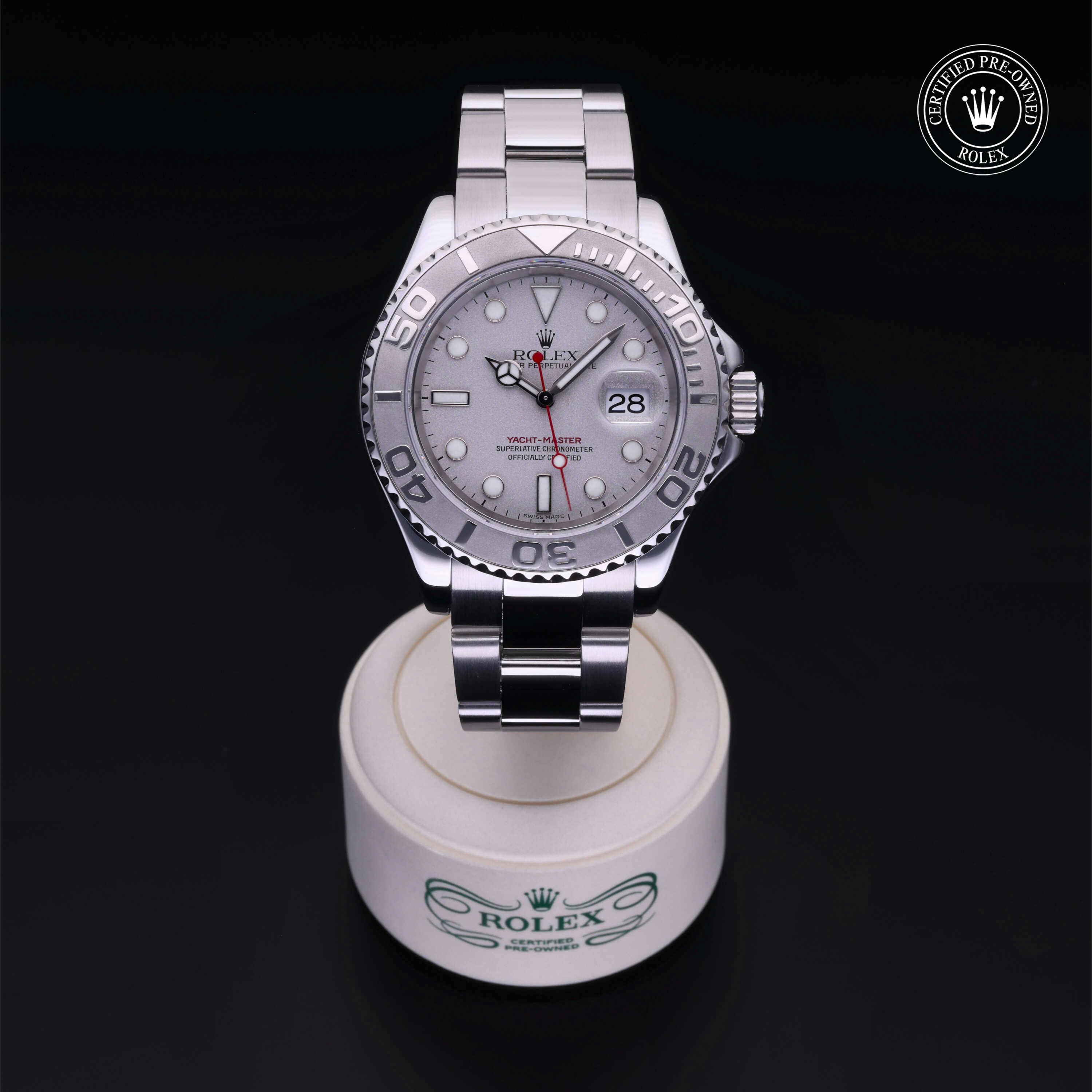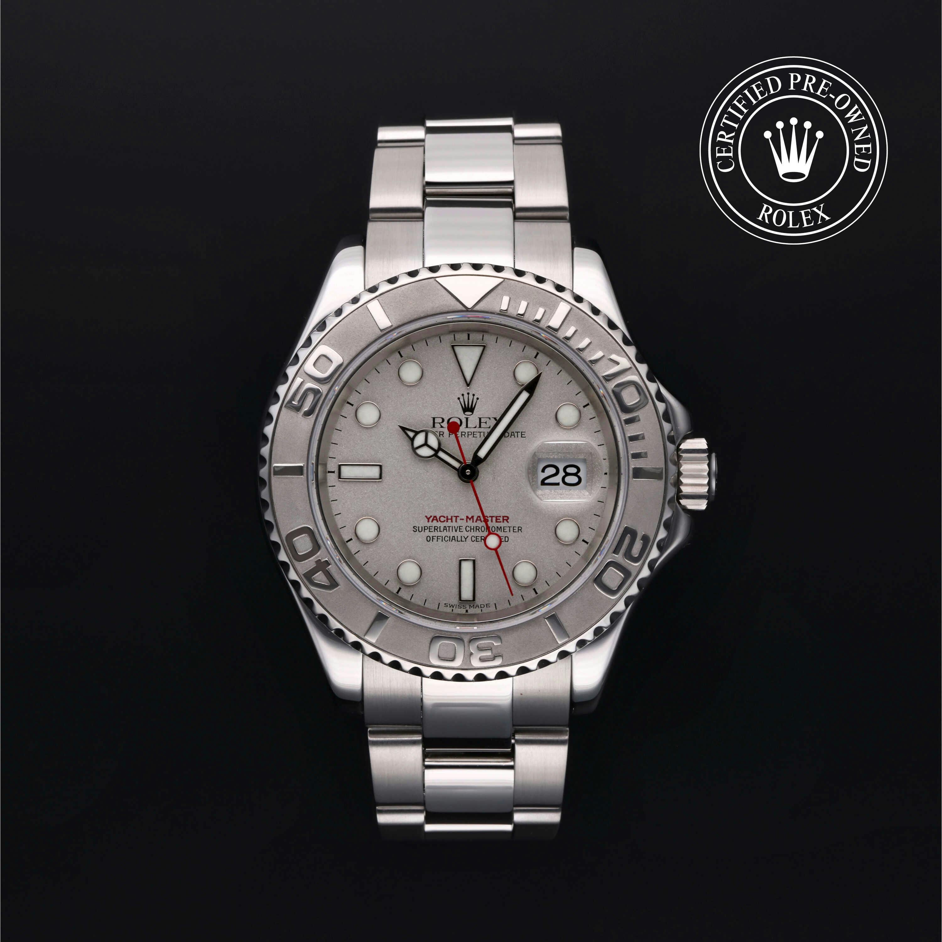 Rolex Certified Pre-Owned Yacht-Master (16622) self - winding automatic watch, features a 40mm stainless steel case with a platinum bezel surrounding a platinum dial on a stainless steel oyster bracelet. Functions include hours, minutes, seconds and date. This watch has received Rolex-authorized service and certification. It does not come with the original box or papers, but includes a custom Rolex Certified Pre-Owned hang tag, travel pouch and RCPO international warranty card.