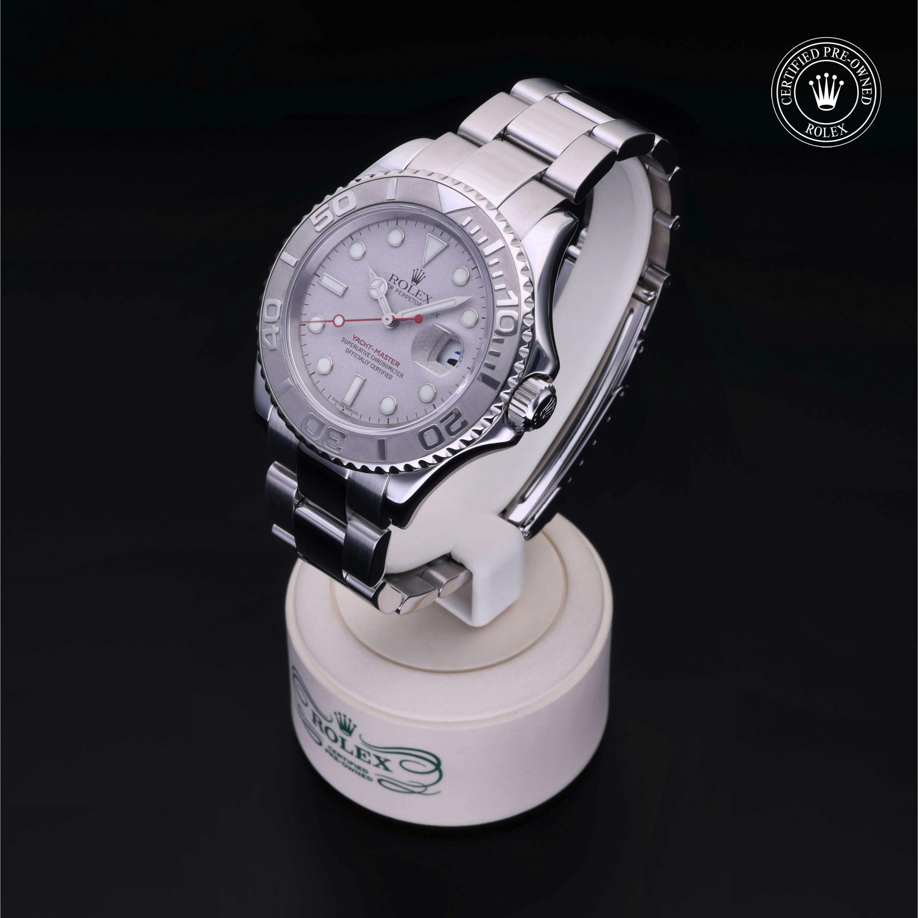 Rolex Certified Pre-Owned Yacht-Master (16622) self - winding automatic watch, features a 40mm stainless steel case with a platinum bezel surrounding a platinum dial on a stainless steel oyster bracelet. Functions include hours, minutes, seconds and date. This watch has received Rolex-authorized service and certification. It does not come with the original box or papers, but includes a custom Rolex Certified Pre-Owned hang tag, travel pouch and RCPO international warranty card.