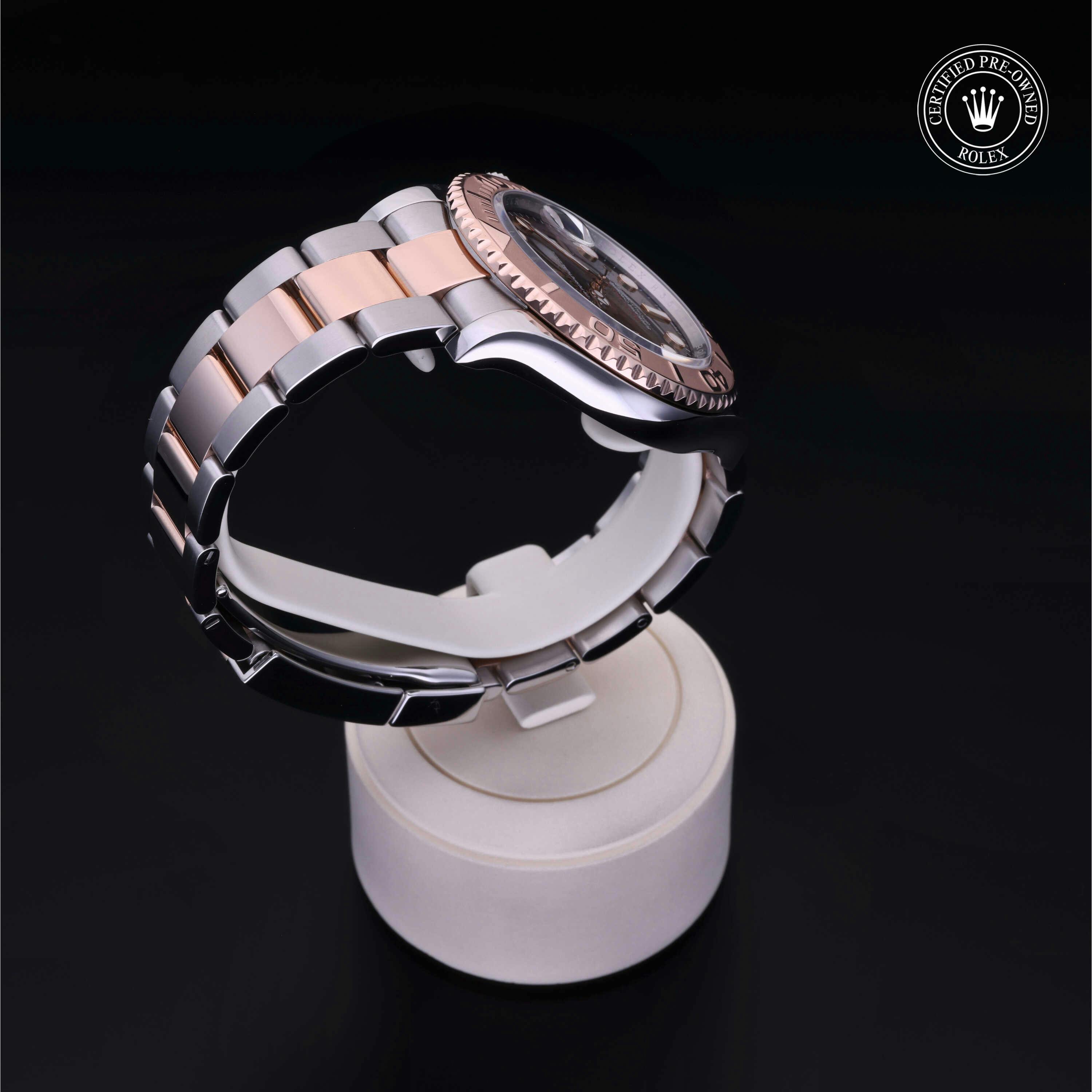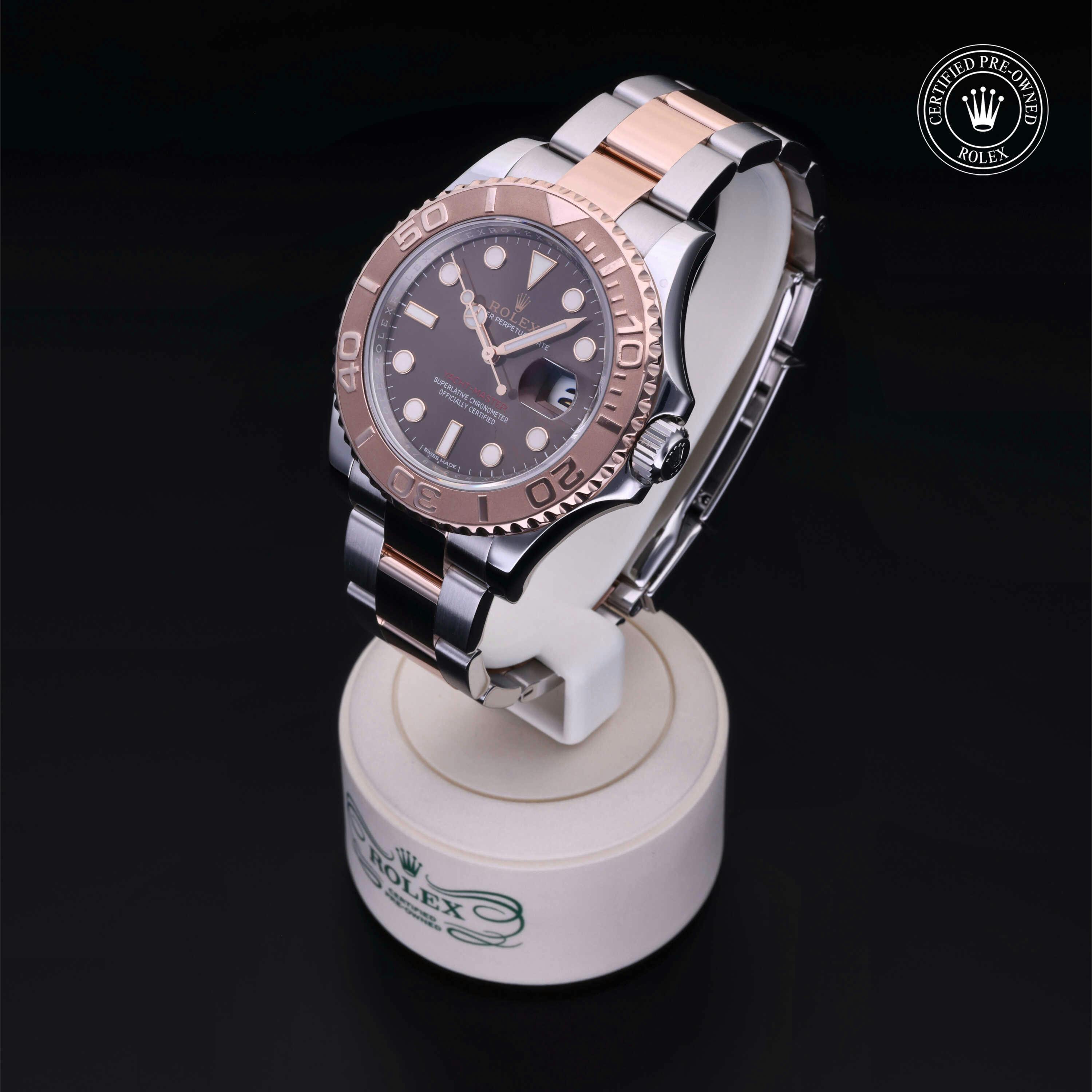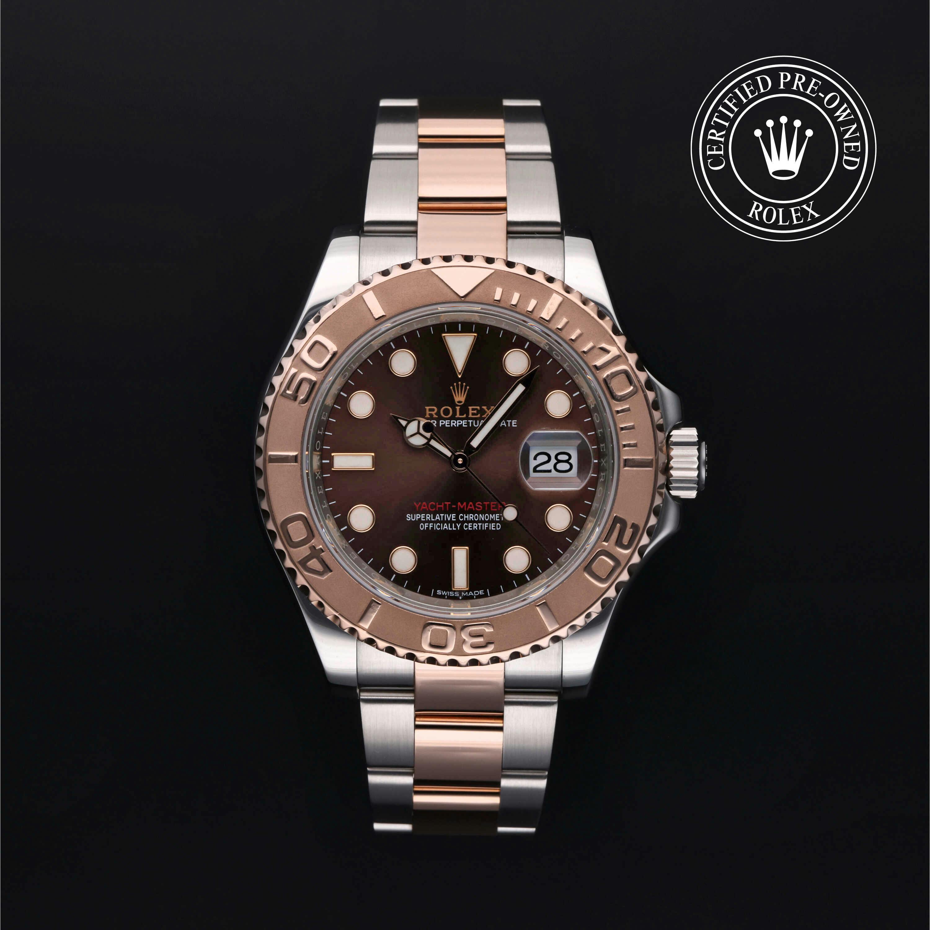 Rolex Certified Pre-Owned Yacht-Master (116621) self - winding automatic watch, features a 40mm stainless steel case with an 18k rose gold bezel surrounding a chocolate brown dial on a stainless steel and 18k rose gold oyster bracelet. Functions include hours, minutes, seconds and date. This watch has received Rolex-authorized service and certification. It does not come with the original box or papers, but includes a custom Rolex Certified Pre-Owned hang tag, travel pouch and RCPO international warranty card.