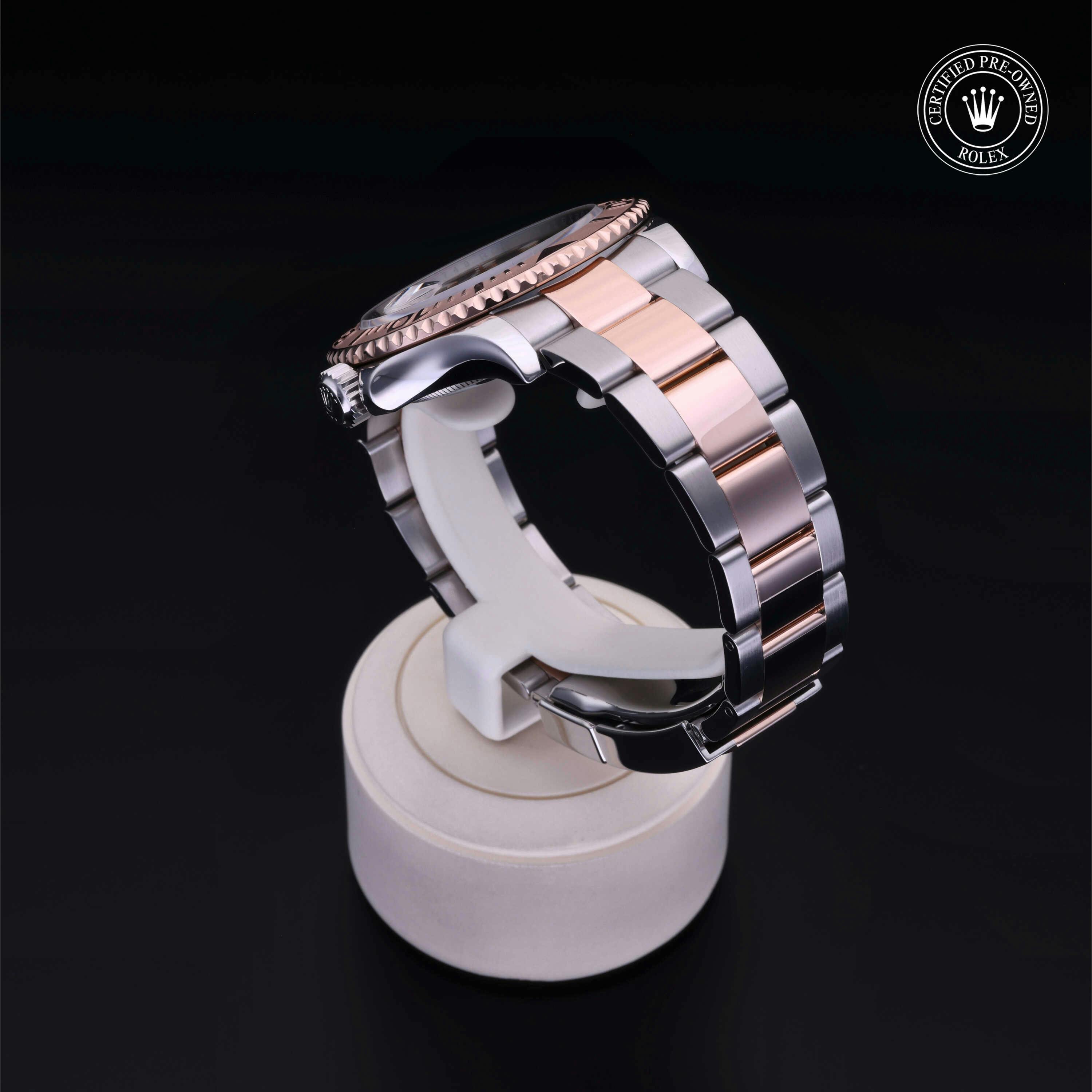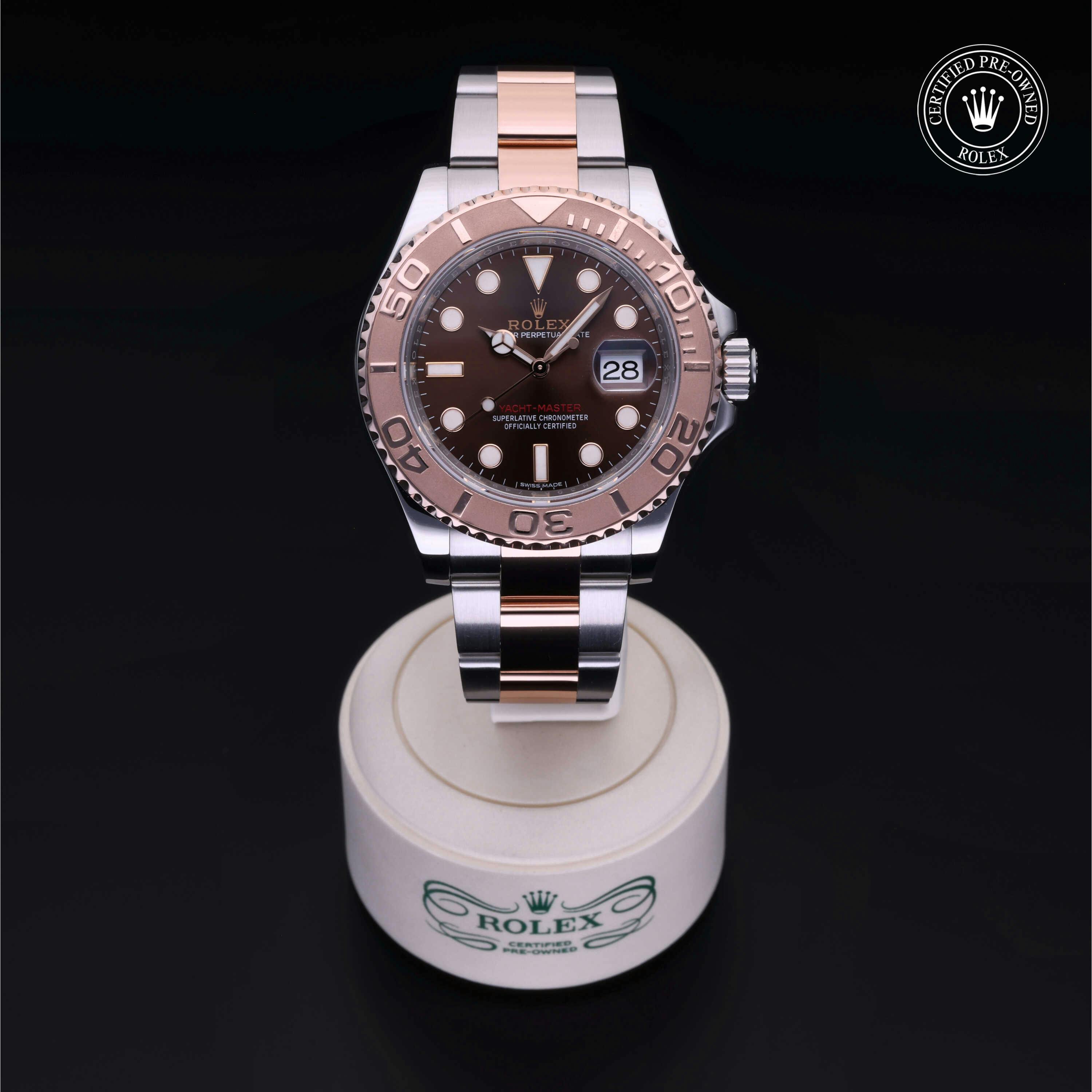 Rolex Certified Pre-Owned Yacht-Master (116621) self - winding automatic watch, features a 40mm stainless steel case with an 18k rose gold bezel surrounding a chocolate brown dial on a stainless steel and 18k rose gold oyster bracelet. Functions include hours, minutes, seconds and date. This watch has received Rolex-authorized service and certification. It does not come with the original box or papers, but includes a custom Rolex Certified Pre-Owned hang tag, travel pouch and RCPO international warranty card.