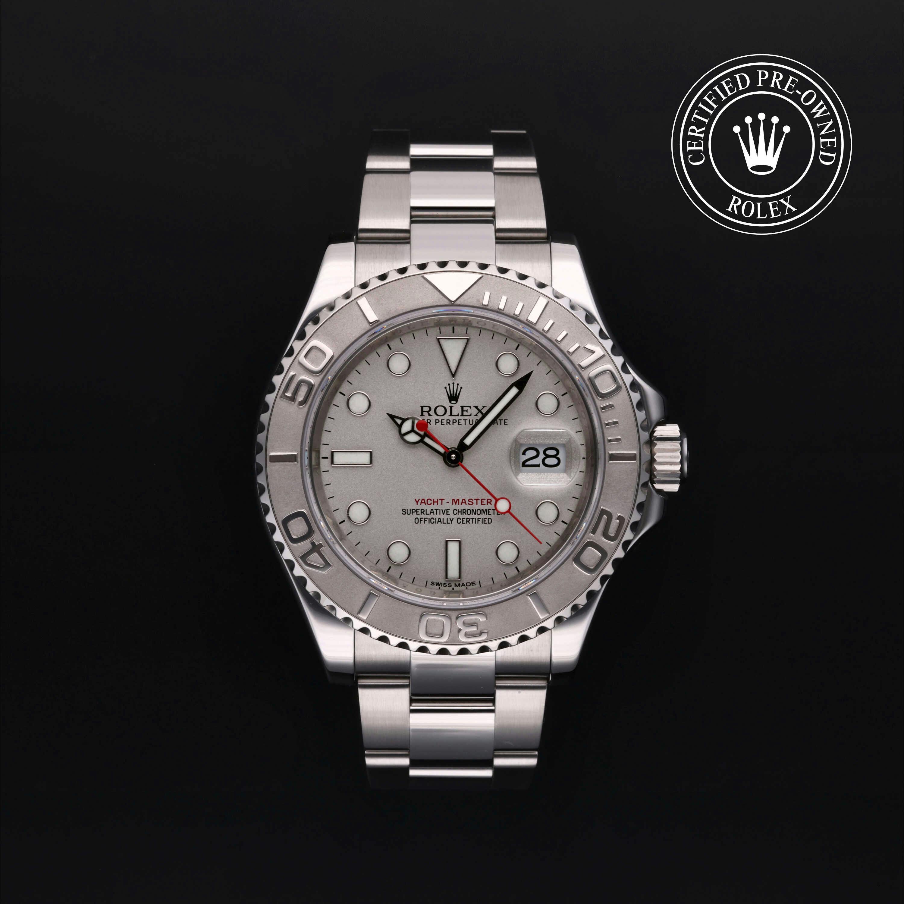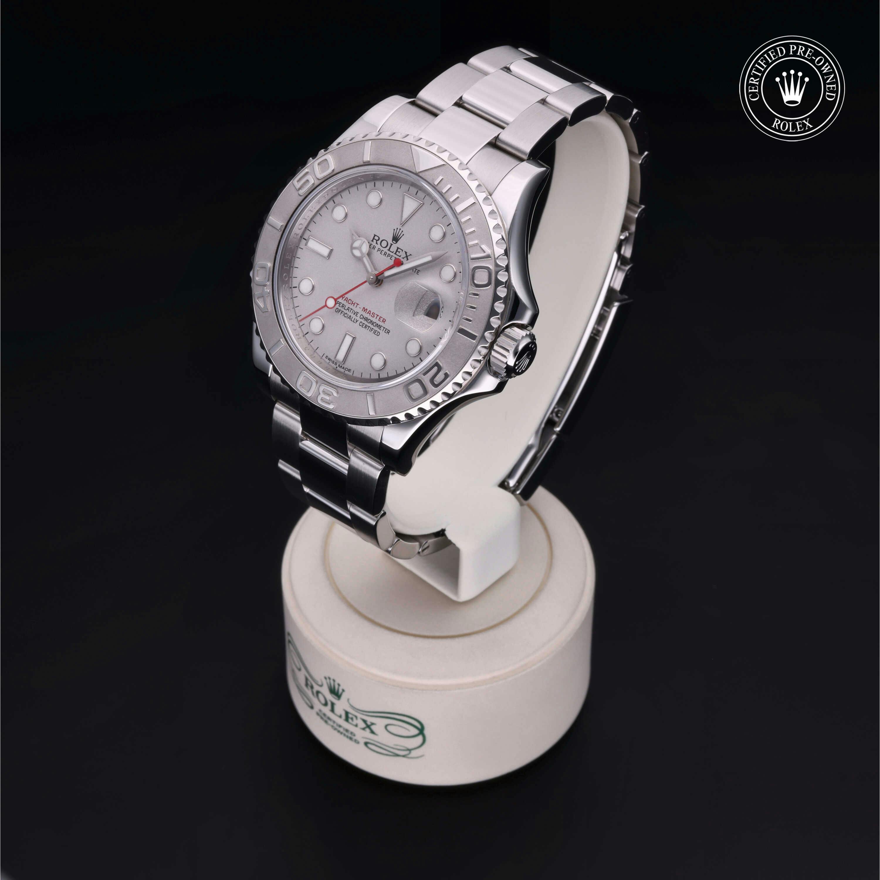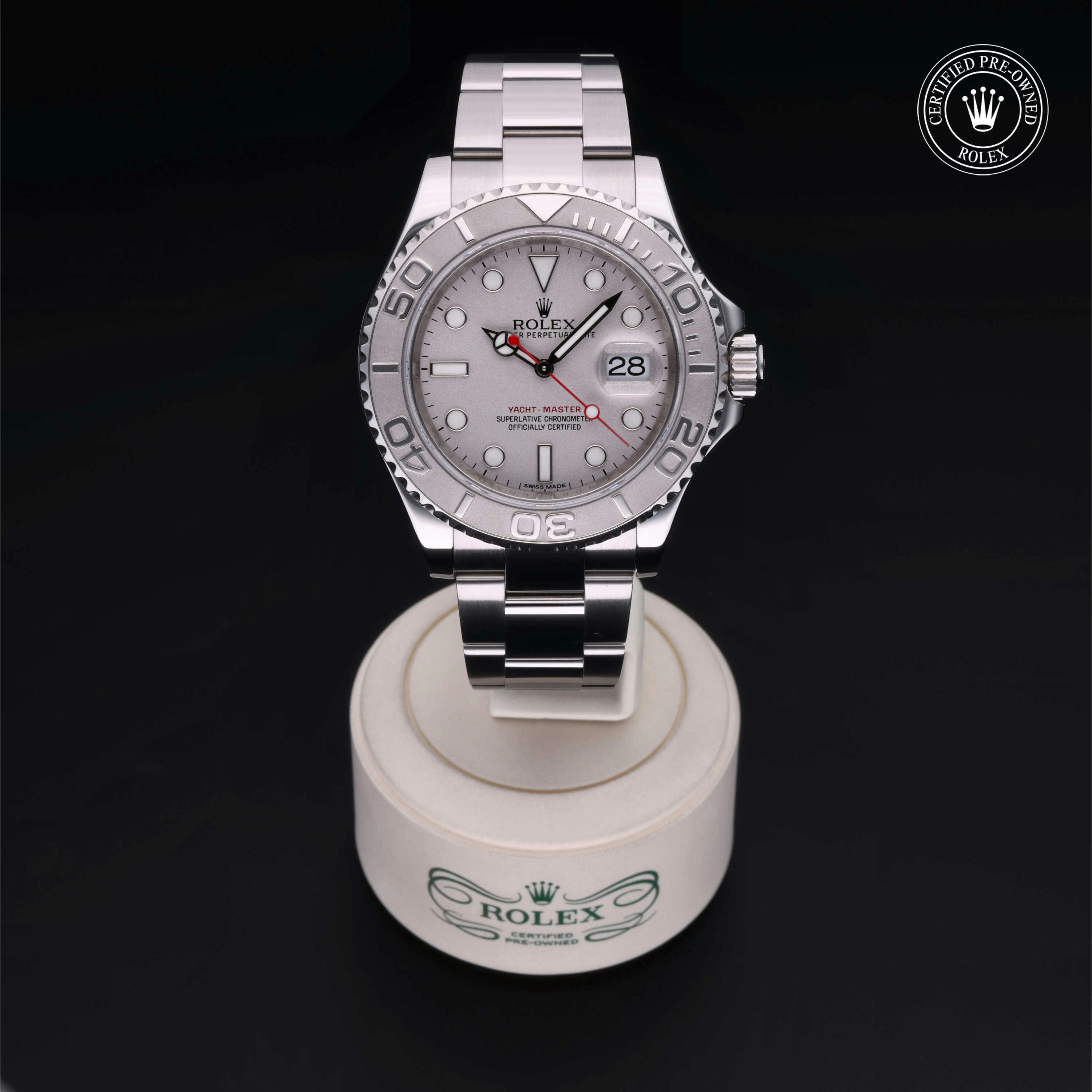Rolex Certified Pre-Owned Yacht-Master (116622) self - winding automatic watch, features a 40mm stainless steel case with a platinum bidirectional rotating bezel surrounding a platinum dial on a stainless steel oyster bracelet. Functions include hours, minutes, seconds and date. This watch has received Rolex-authorized service and certification. It does not come with the original box or papers, but includes a custom Rolex Certified Pre-Owned hang tag, travel pouch and RCPO international warranty card.
