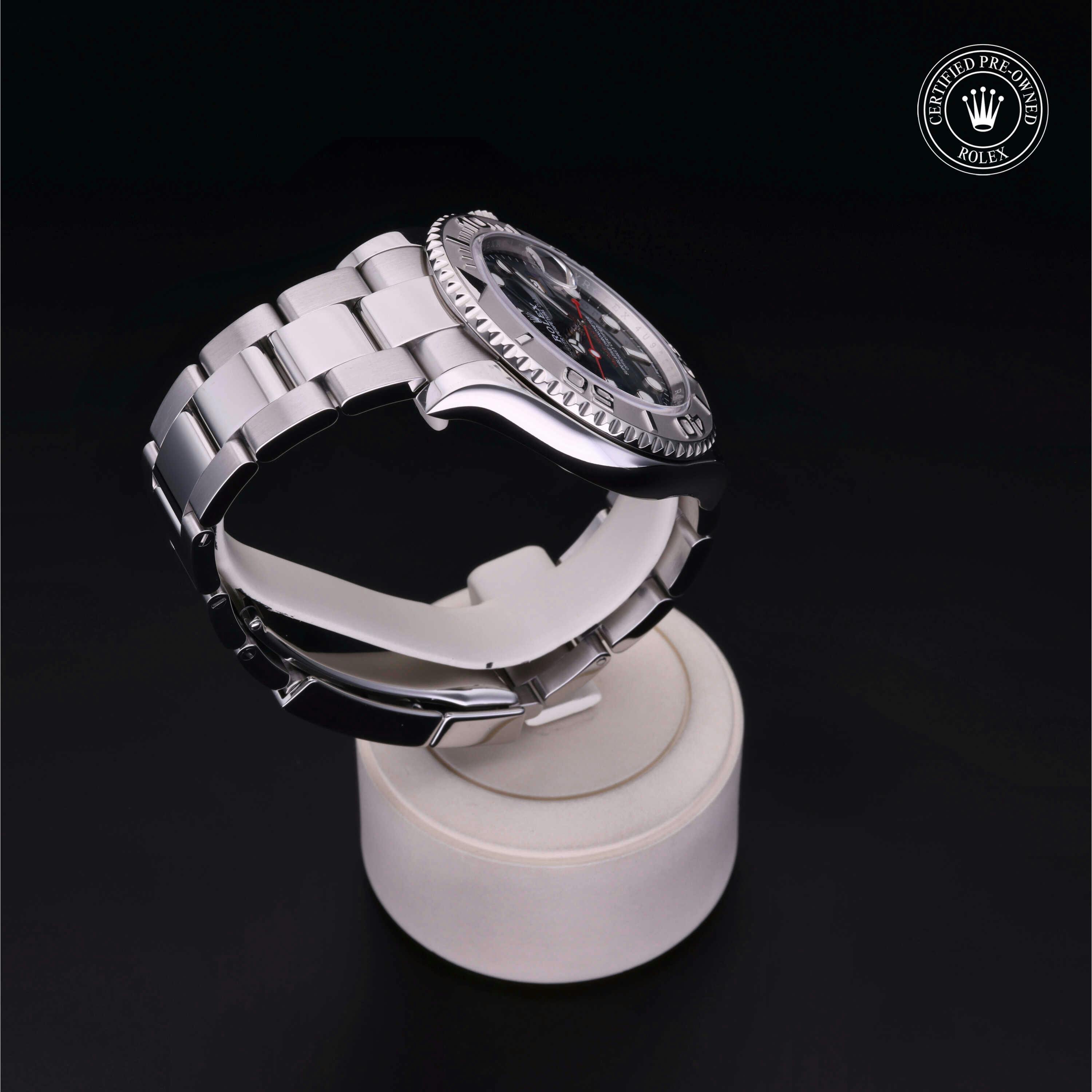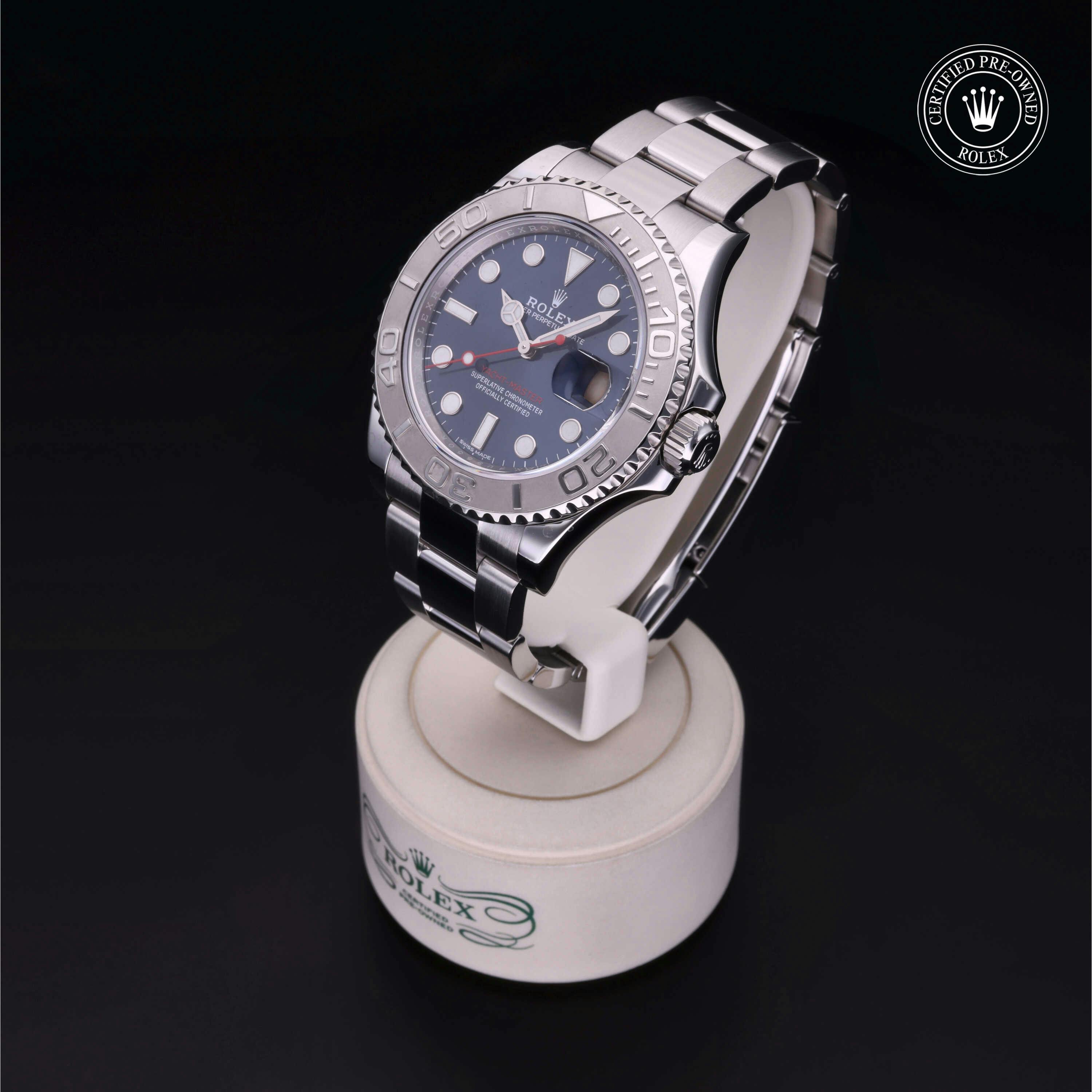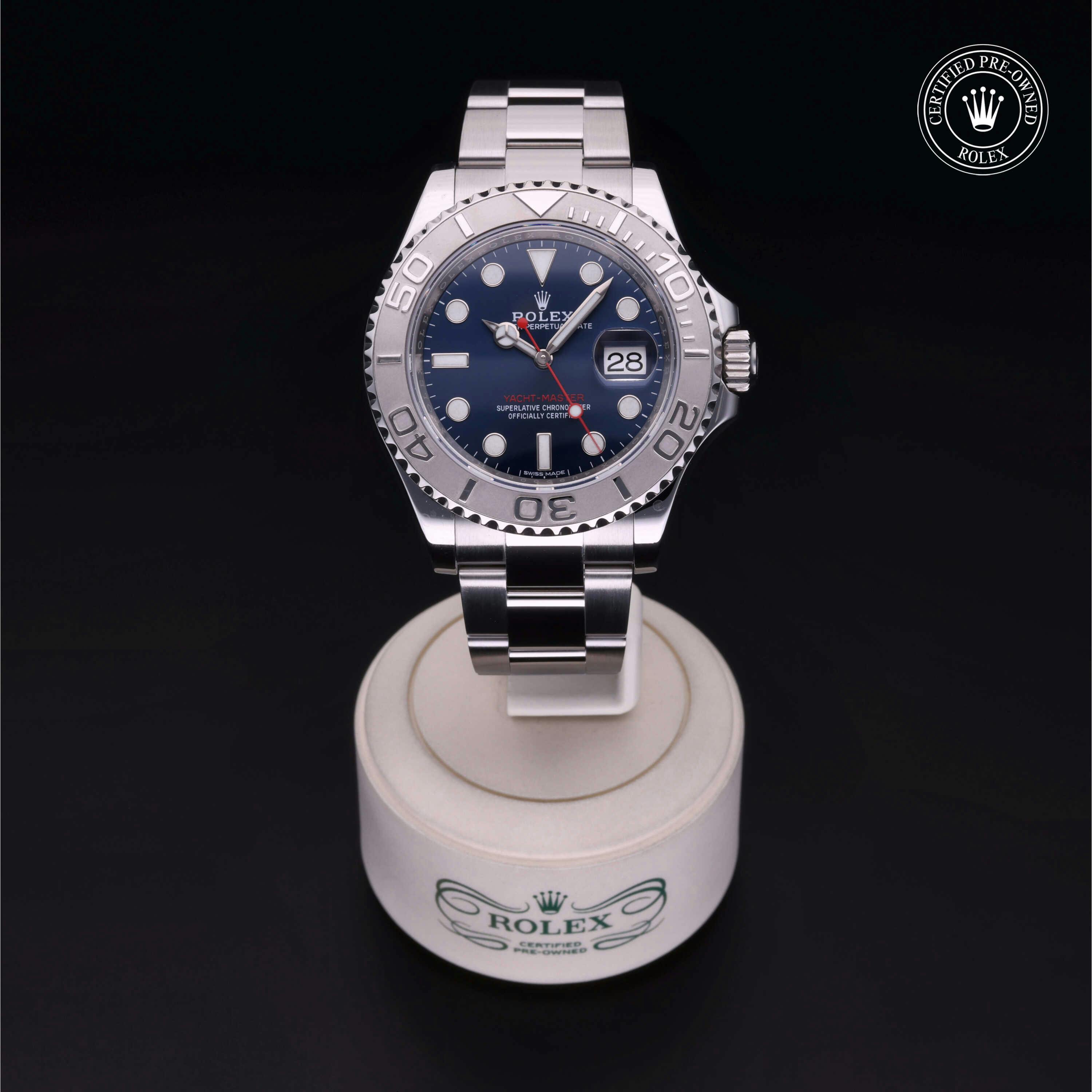 Rolex Certified Pre-Owned Yacht-Master (116622) self - winding automatic watch, features a 40mm stainless steel case with a platinum rotating bezel surrounding a blue dial on a stainless steel oyster bracelet. Functions include hours, minutes, seconds and date. This watch has received Rolex-authorized service and certification. It does not come with the original box or papers, but includes a custom Rolex Certified Pre-Owned hang tag, travel pouch and RCPO international warranty card.